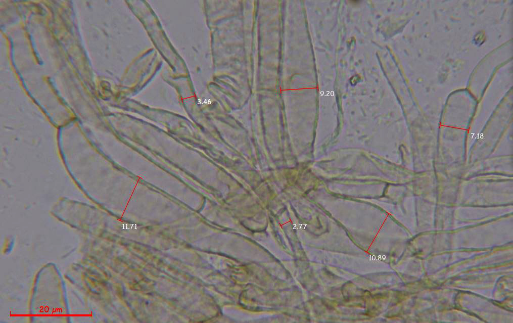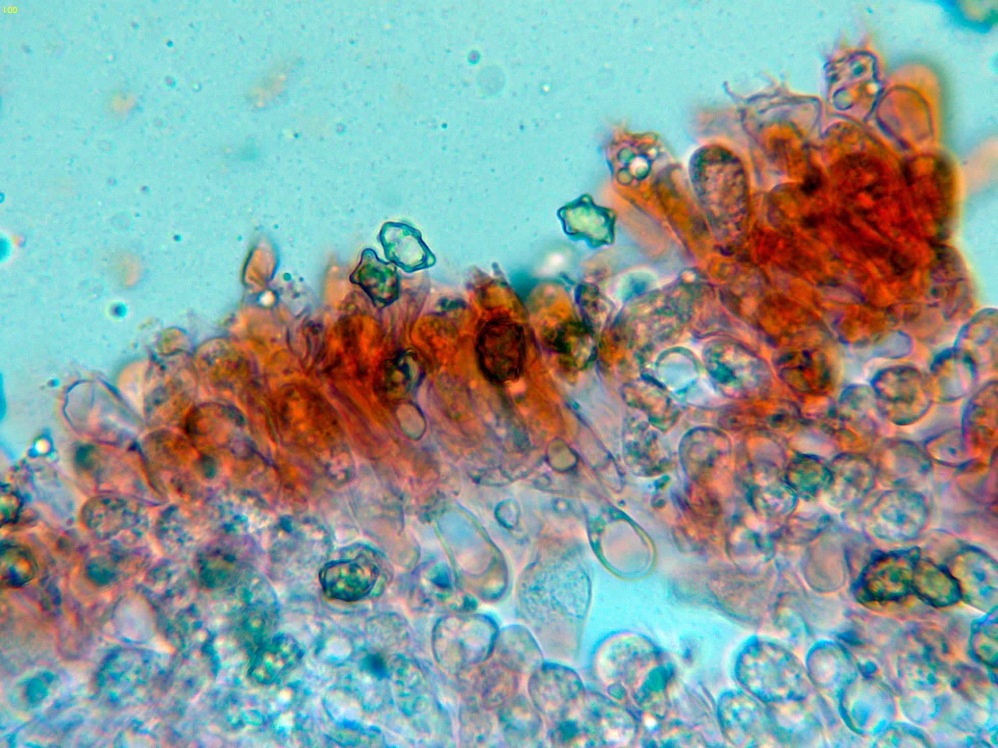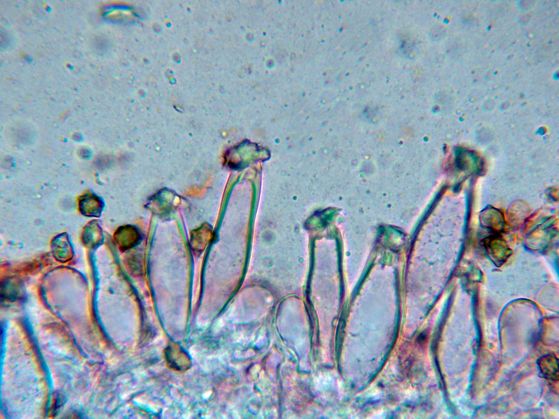 Los queilocistidios, de pared gruesa, con cristalizaciones en el ápice y unas medidas de (37.2) 38.6 - 49.1 (50.1) × (10.5) 11.5 - 14 (15.7) µm.