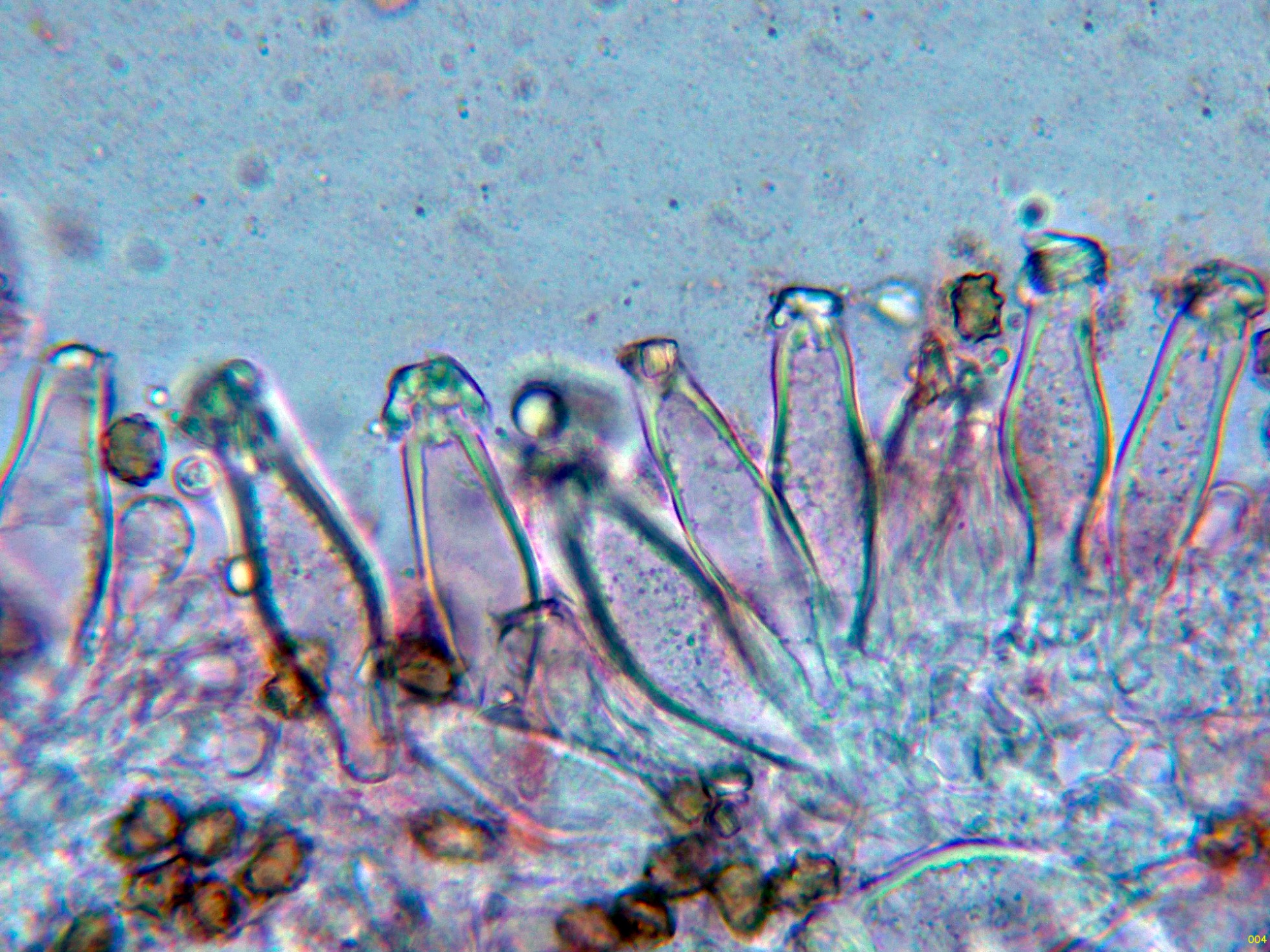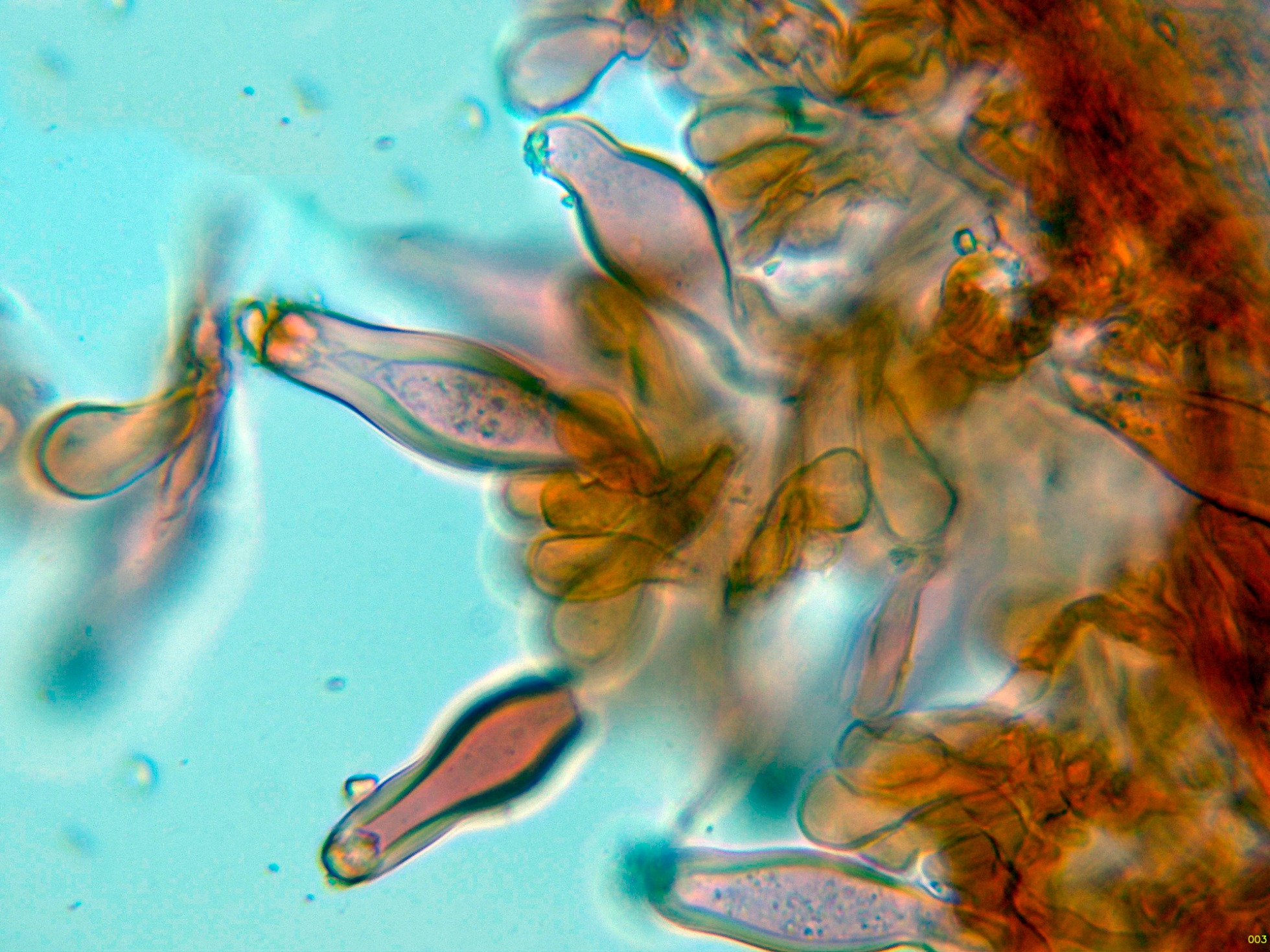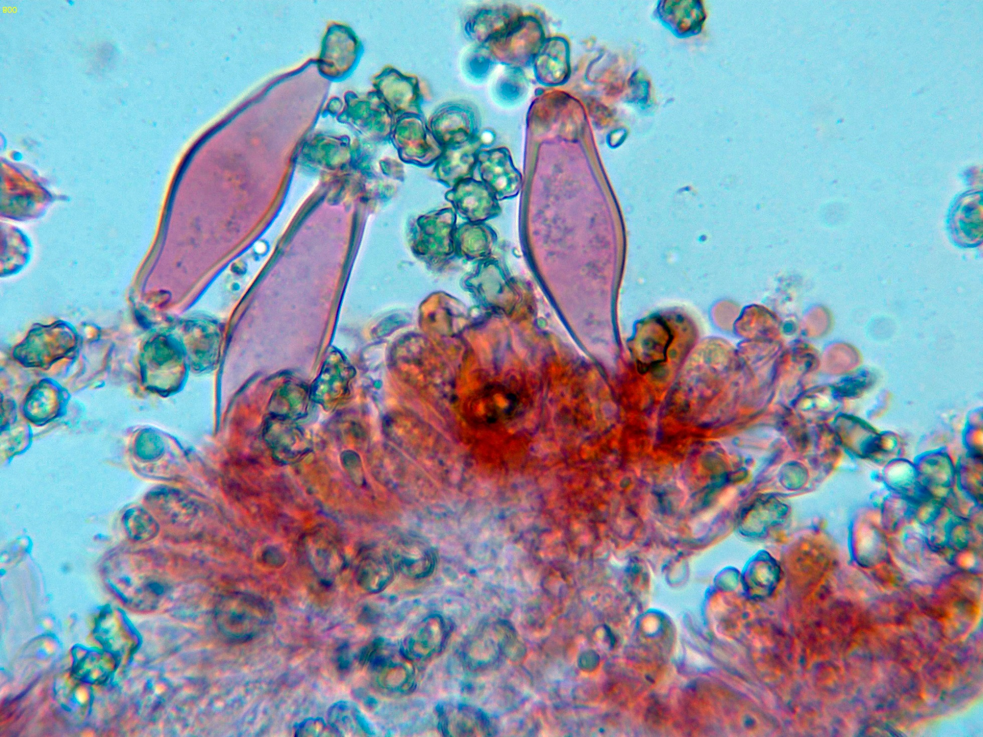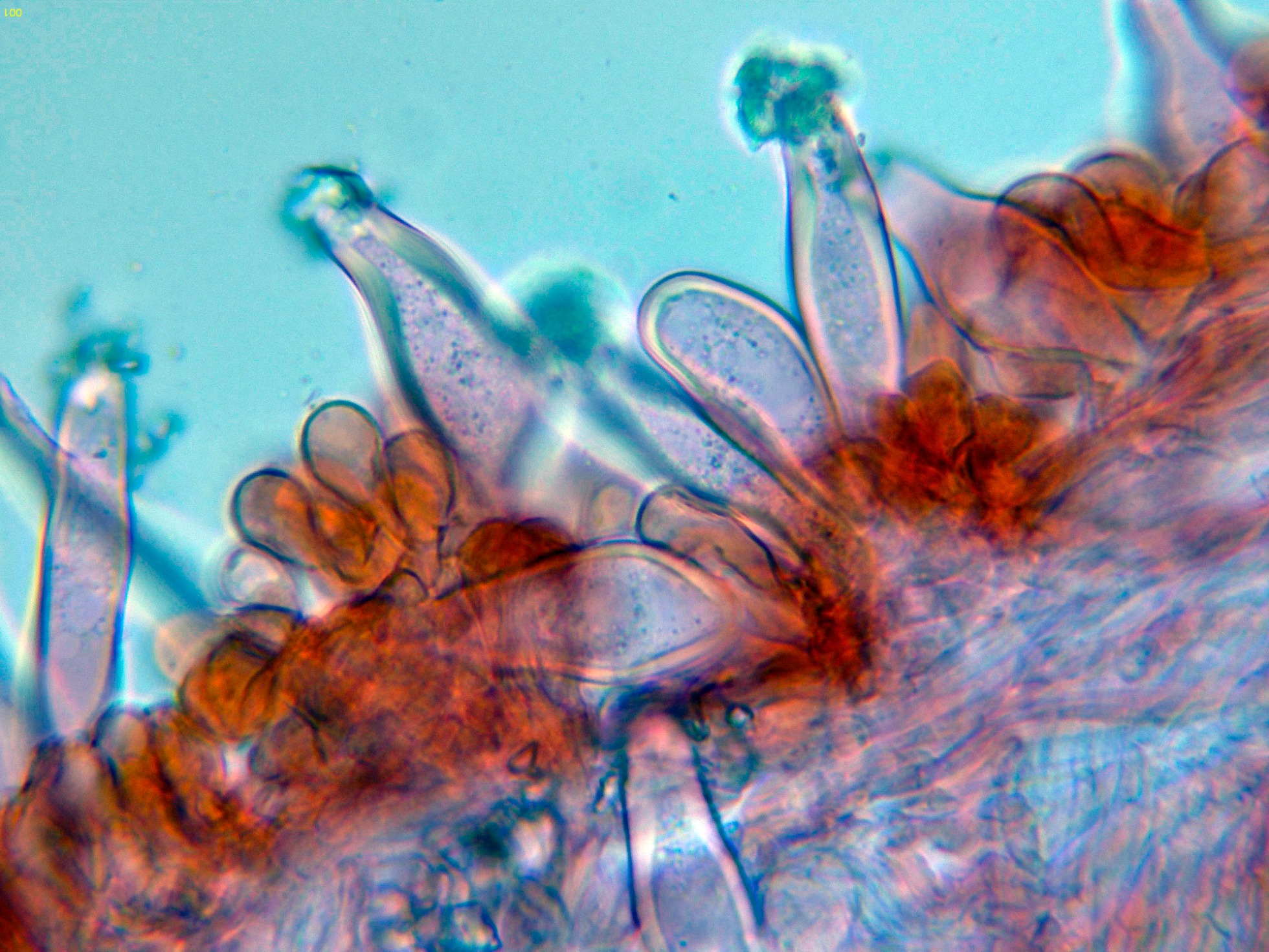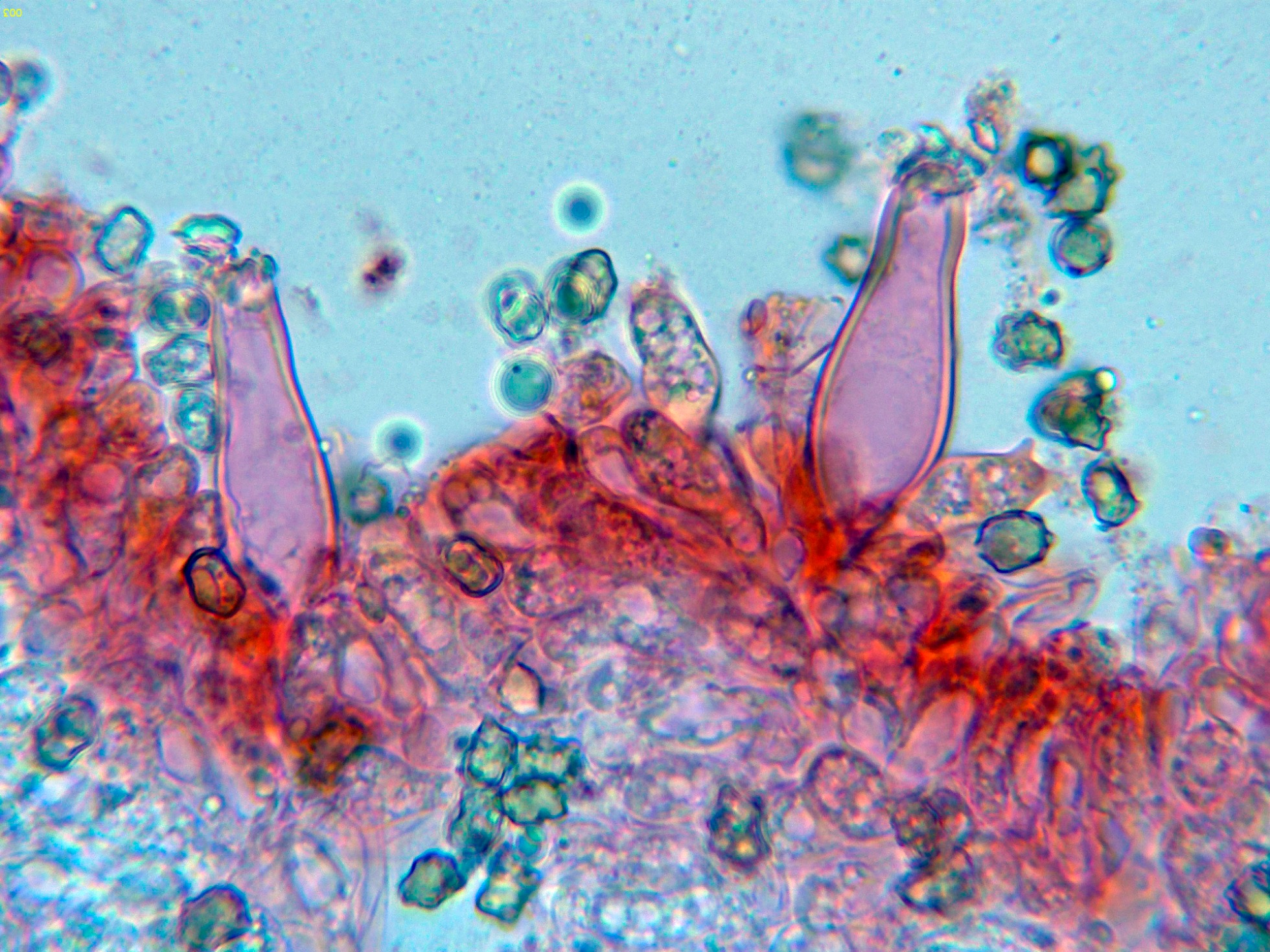 Pleurocistidios abundantes en la cara laminar, con una morfología parecida a los queilocistidios y con un tamaño ligeramente mayor: