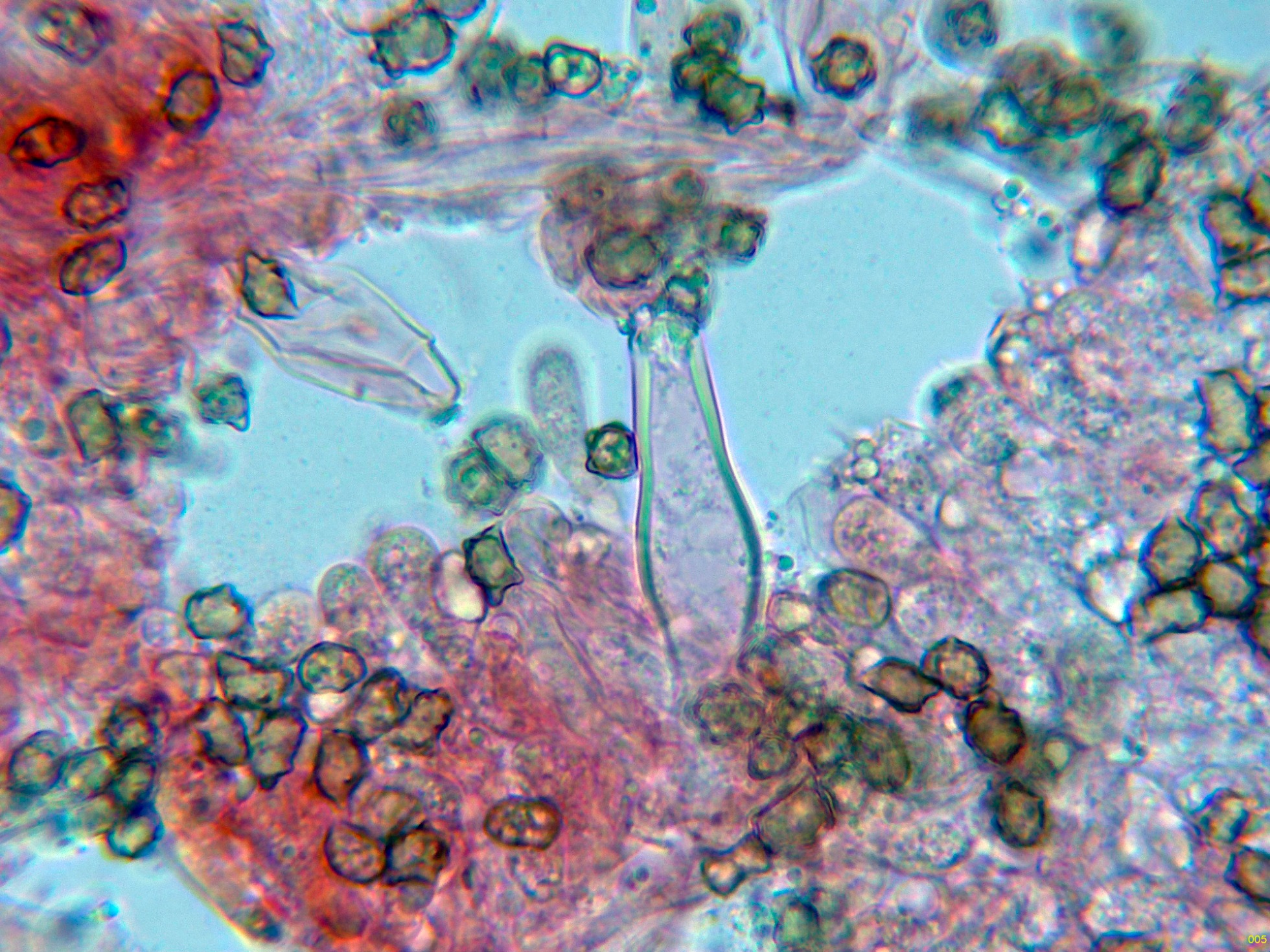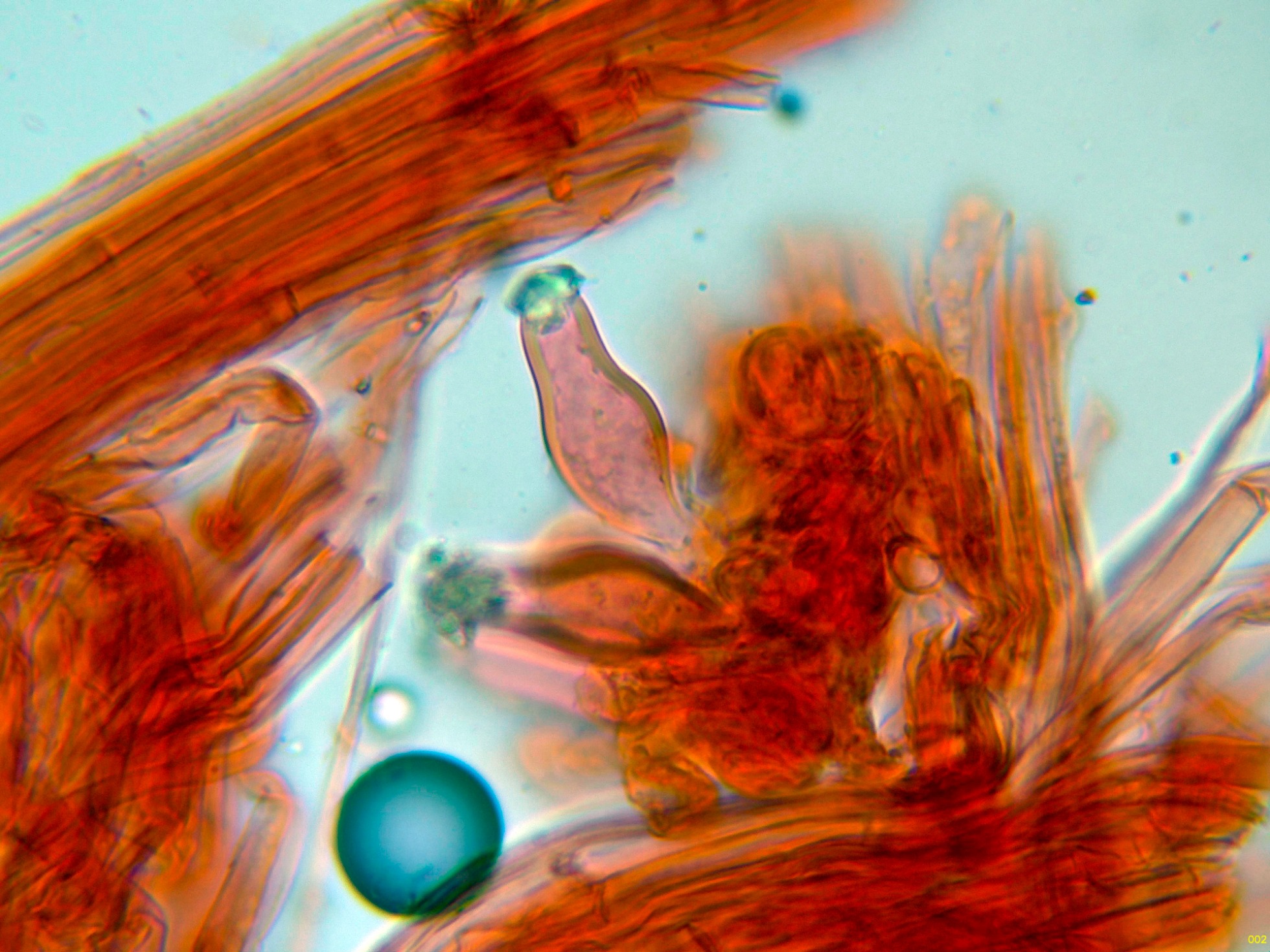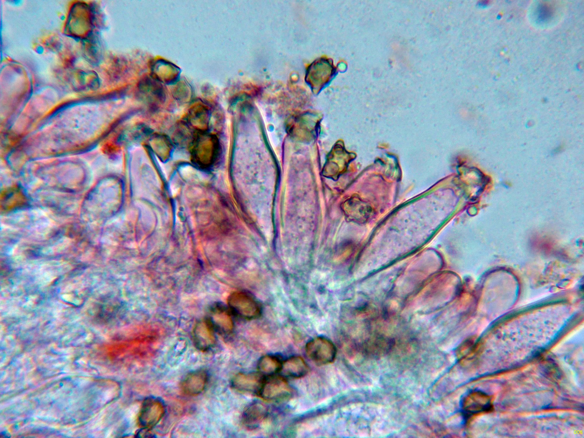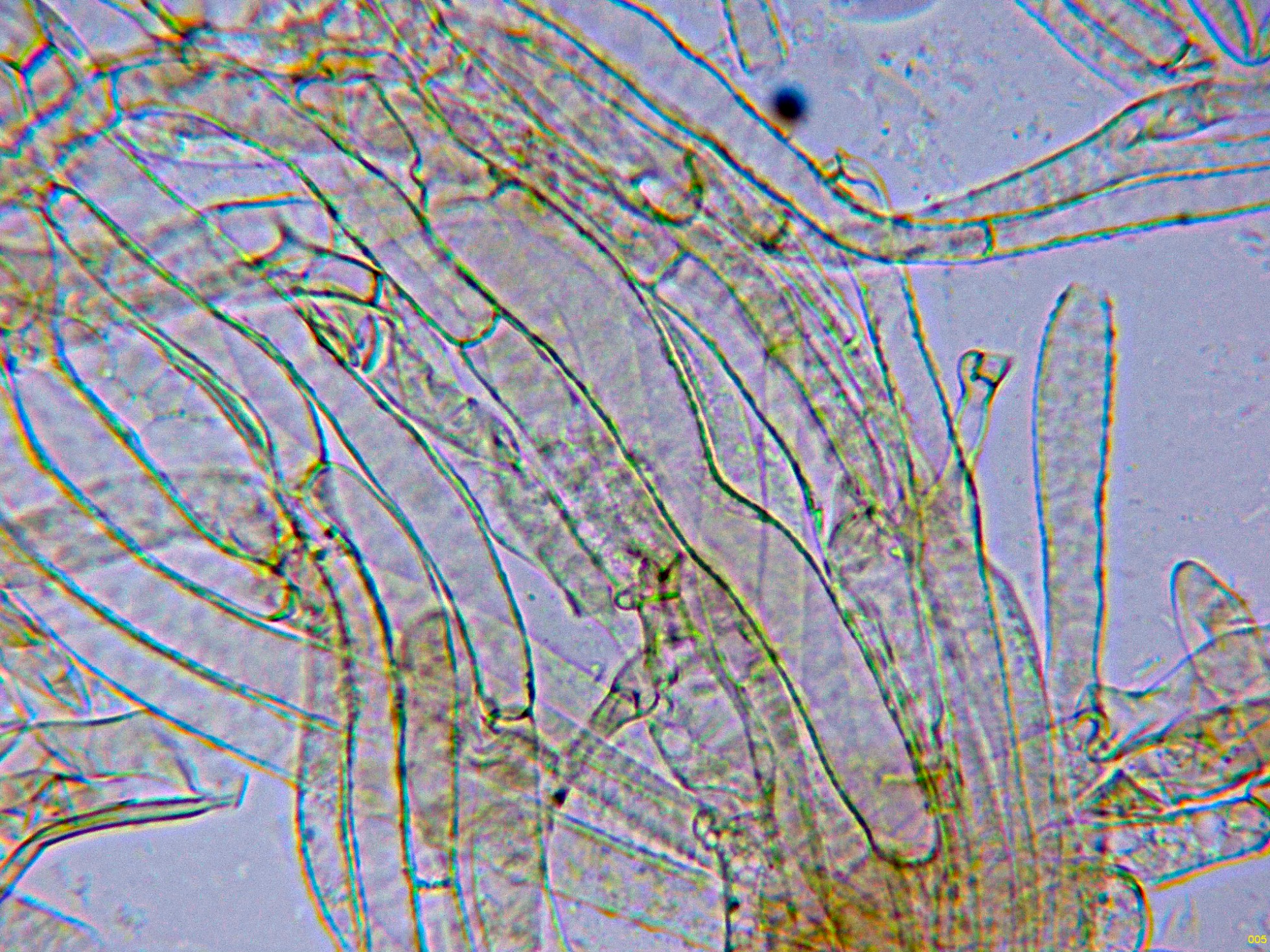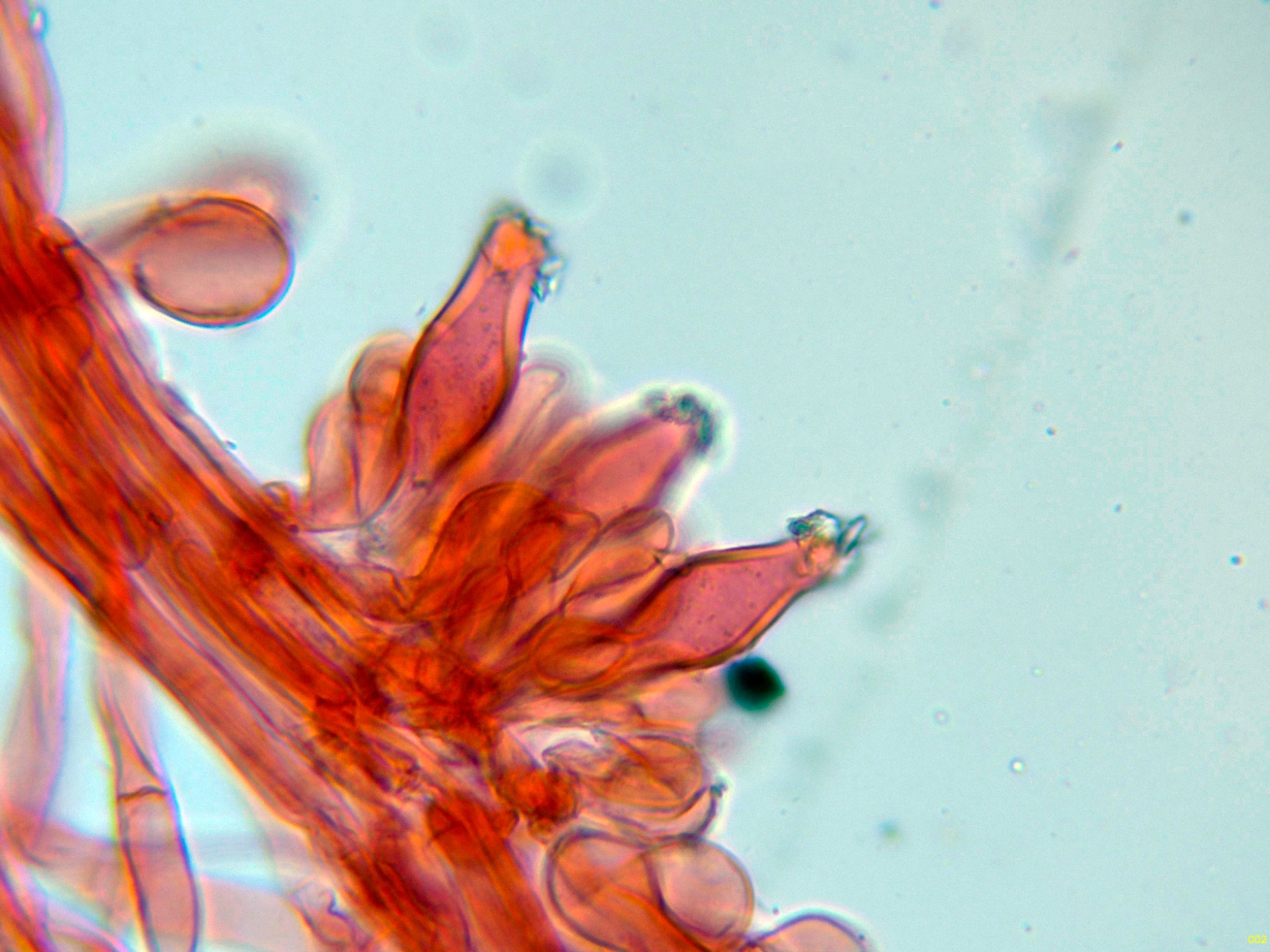 Pleurocistidios abundantes en la cara laminar, con una morfología parecida a los queilocistidios y con un tamaño ligeramente mayor: