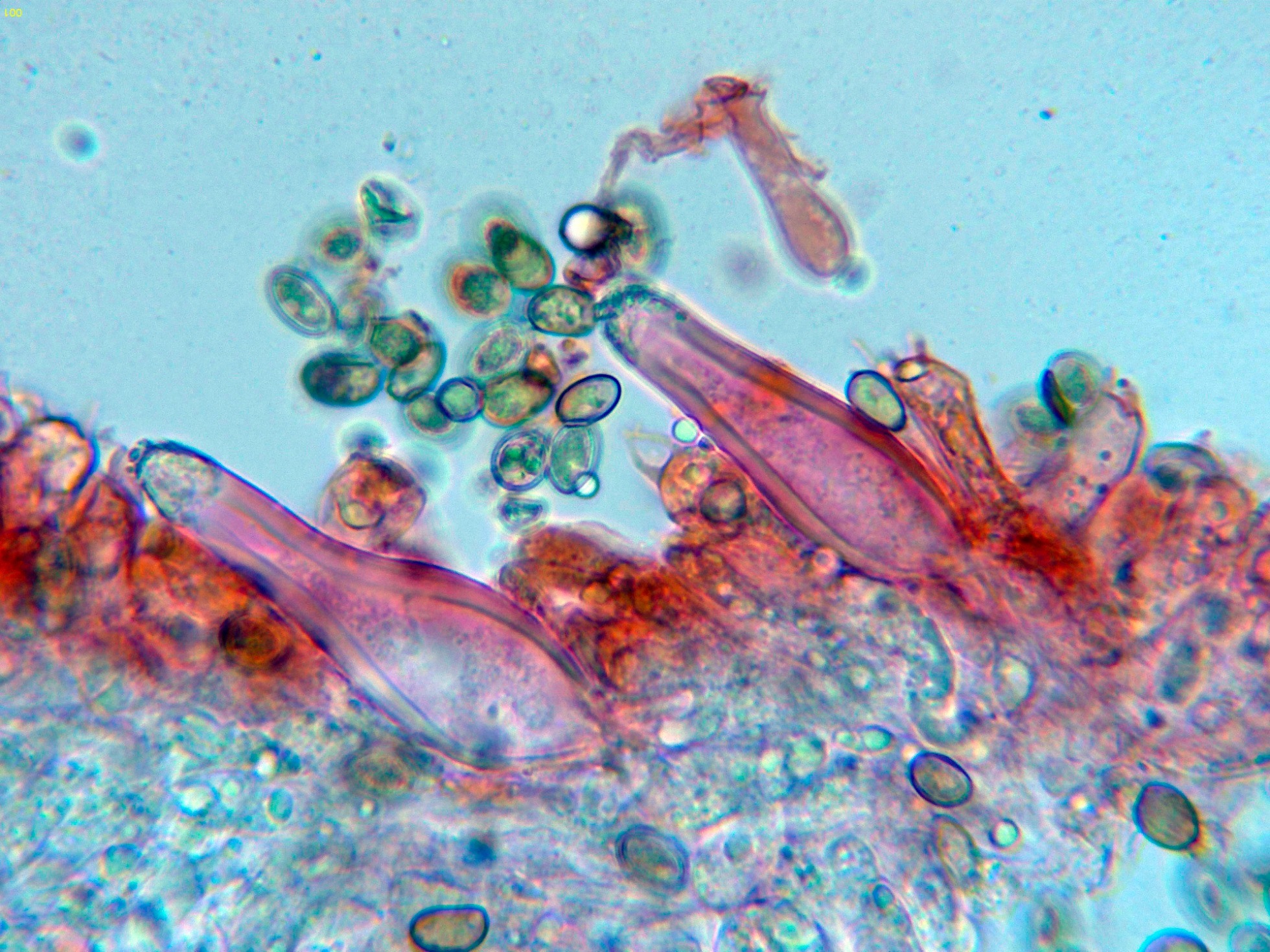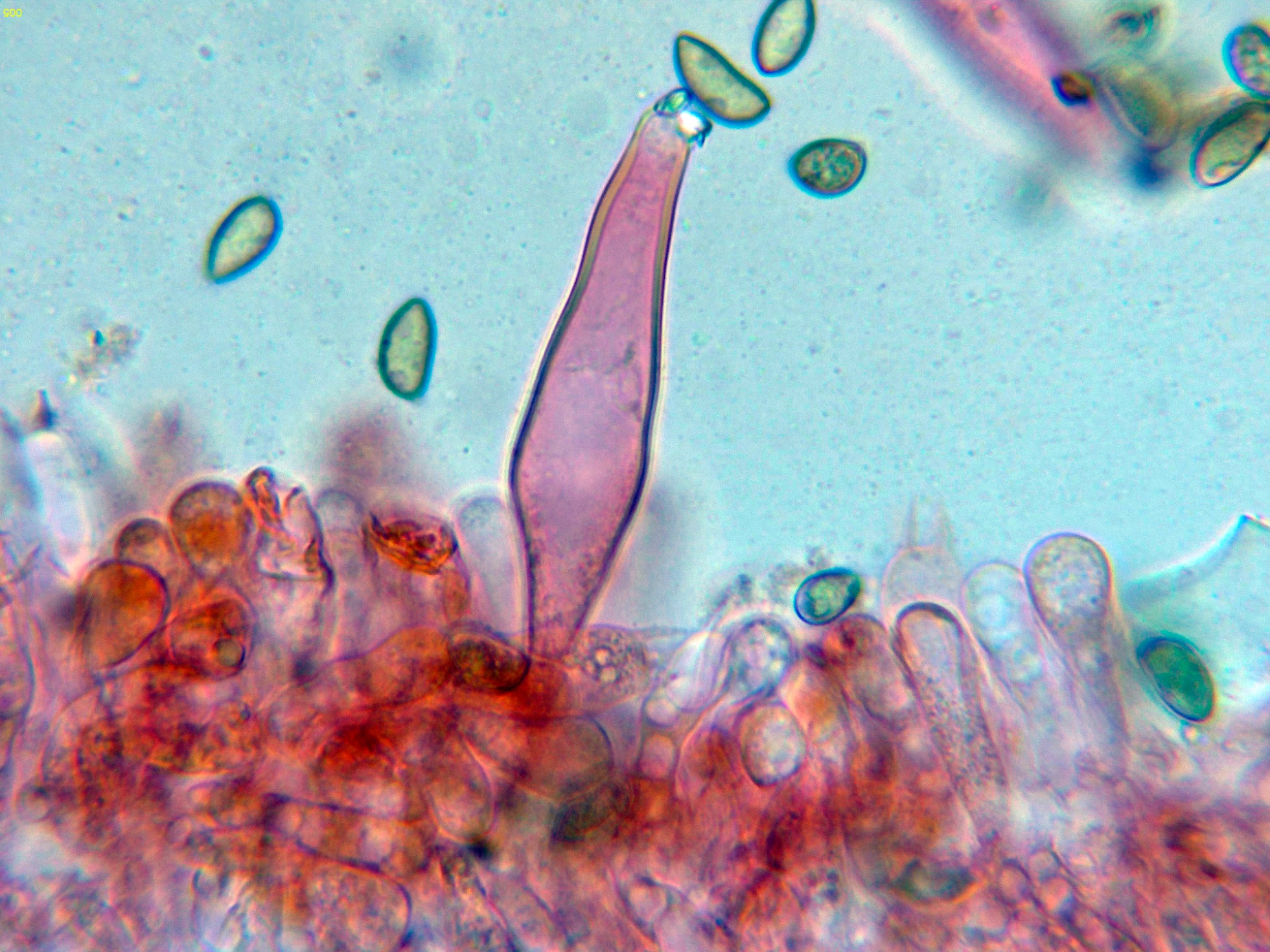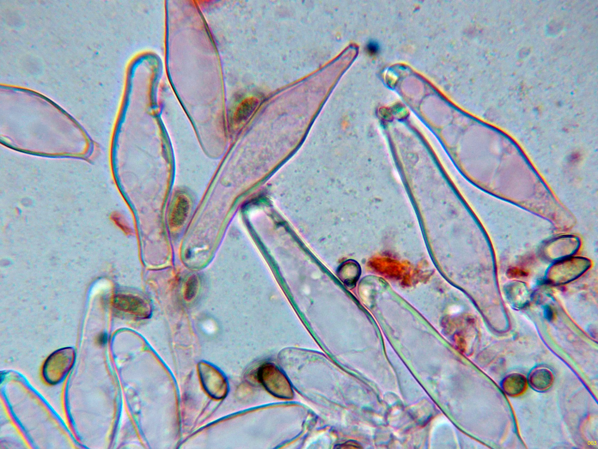 Queilocistidios con cristalizaciones en el ápice y unas medidas de (44.2) 49 - 62.8 (70) × (10.2) 11.3 - 15.2 (15.6) µm.
