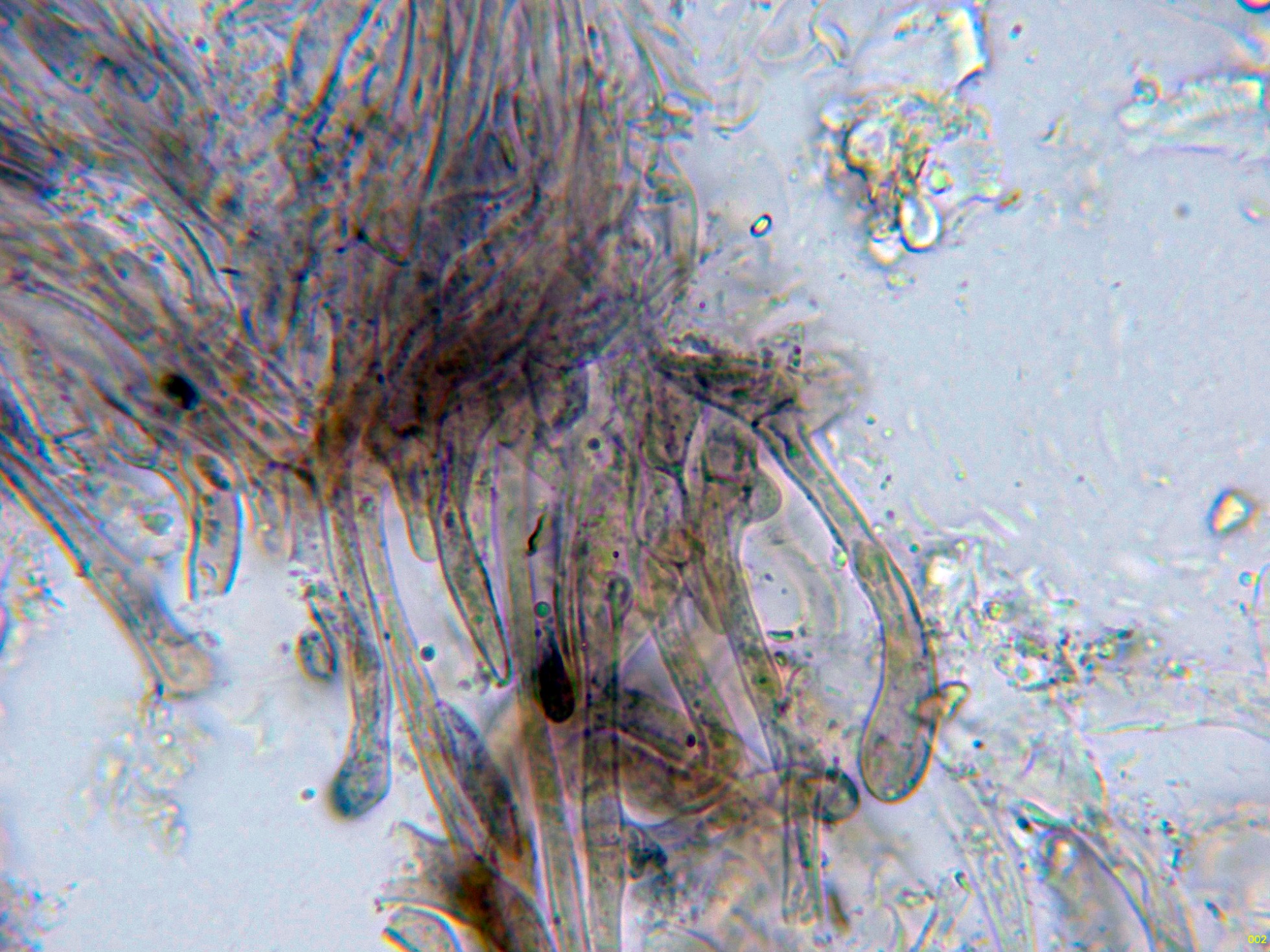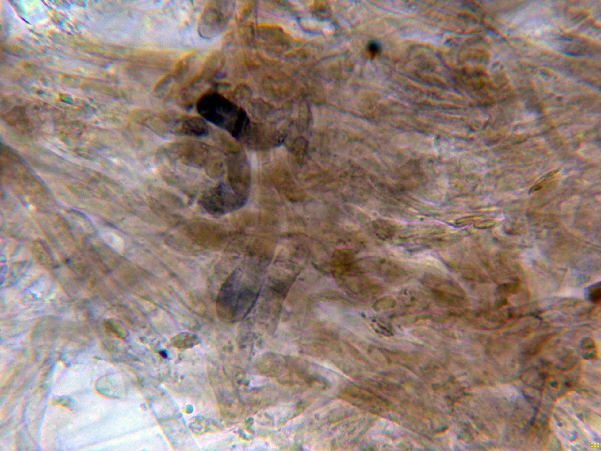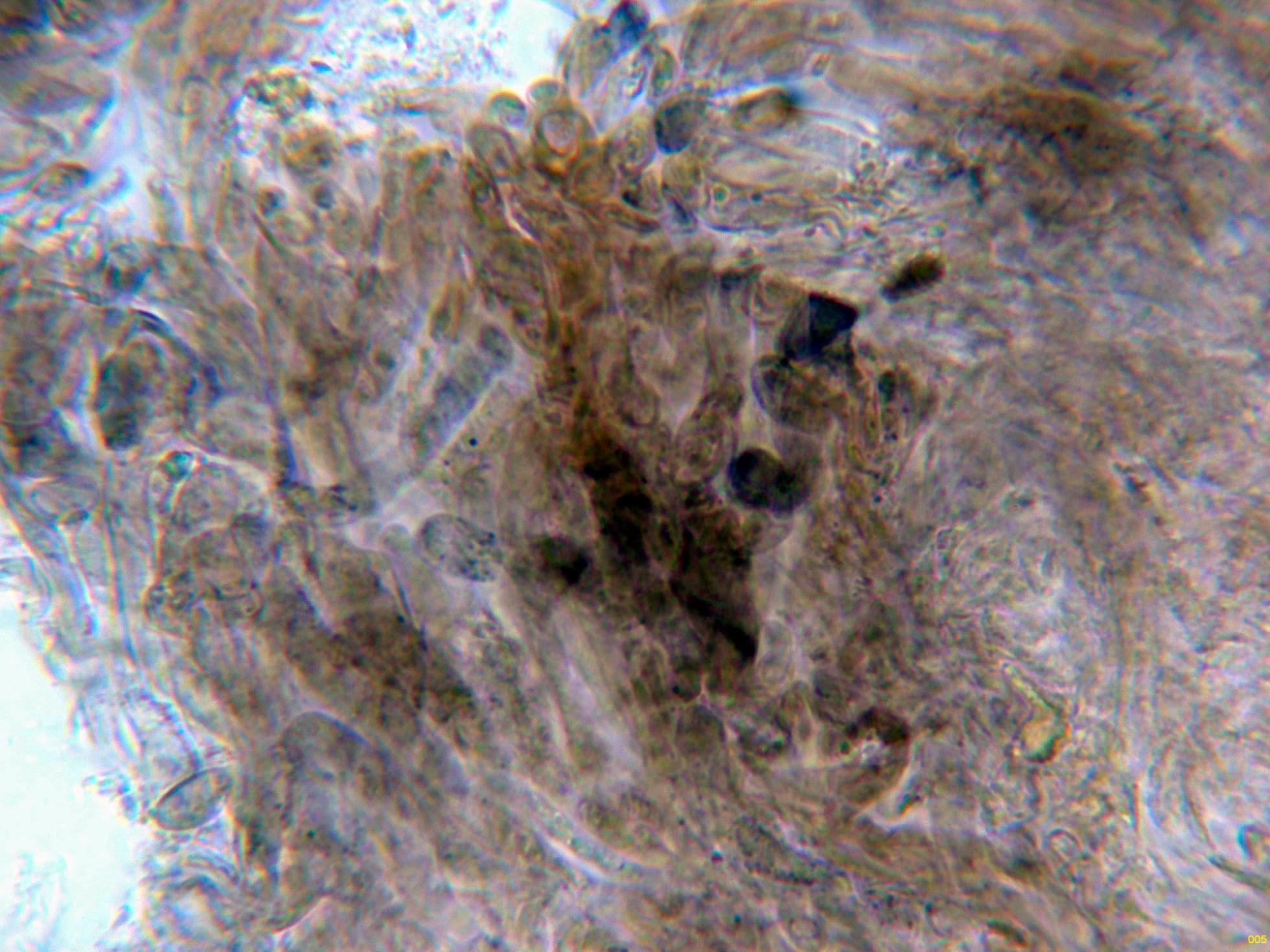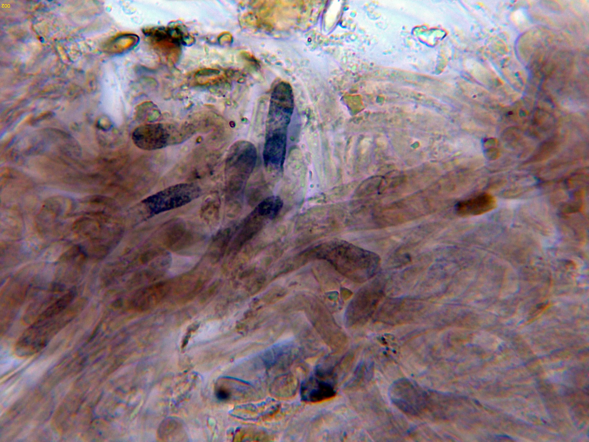 Hifas de la suprapellis en agua, con numerosas hifas terminales con formas redondeadas, fuertemente pigmentadas: