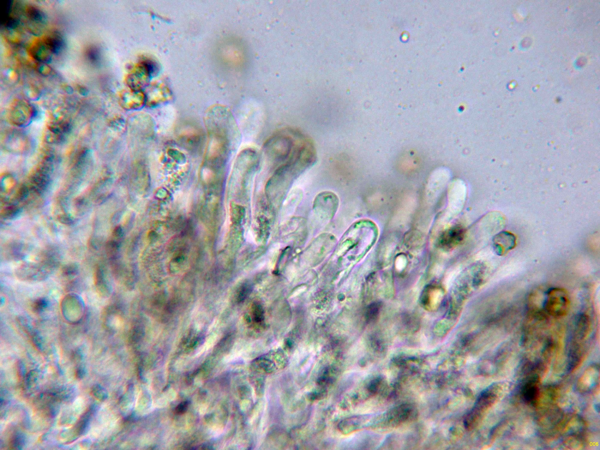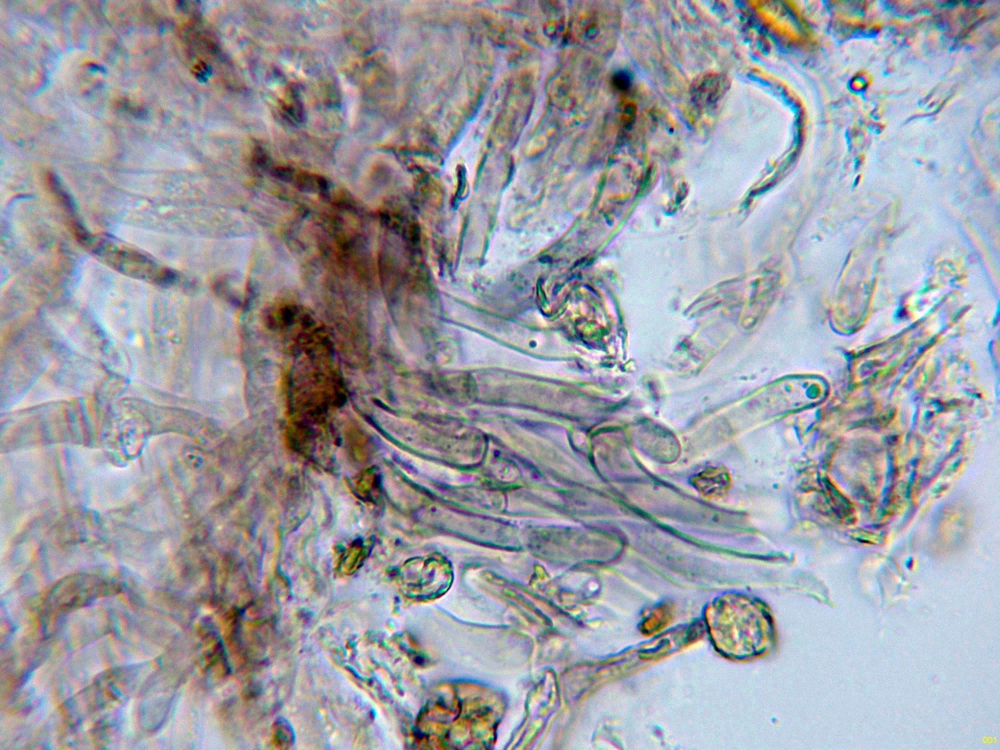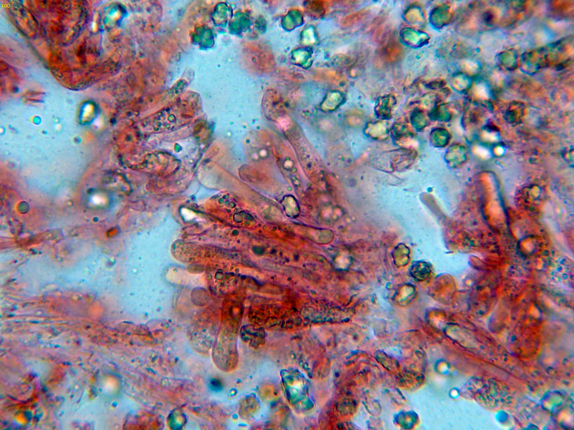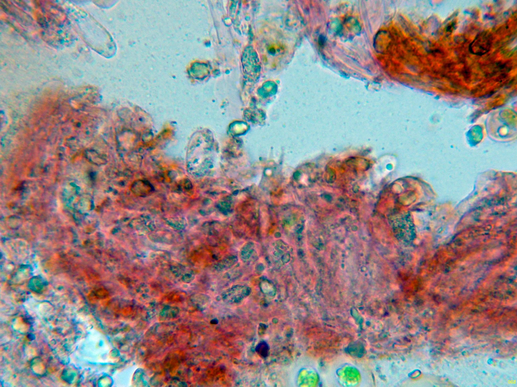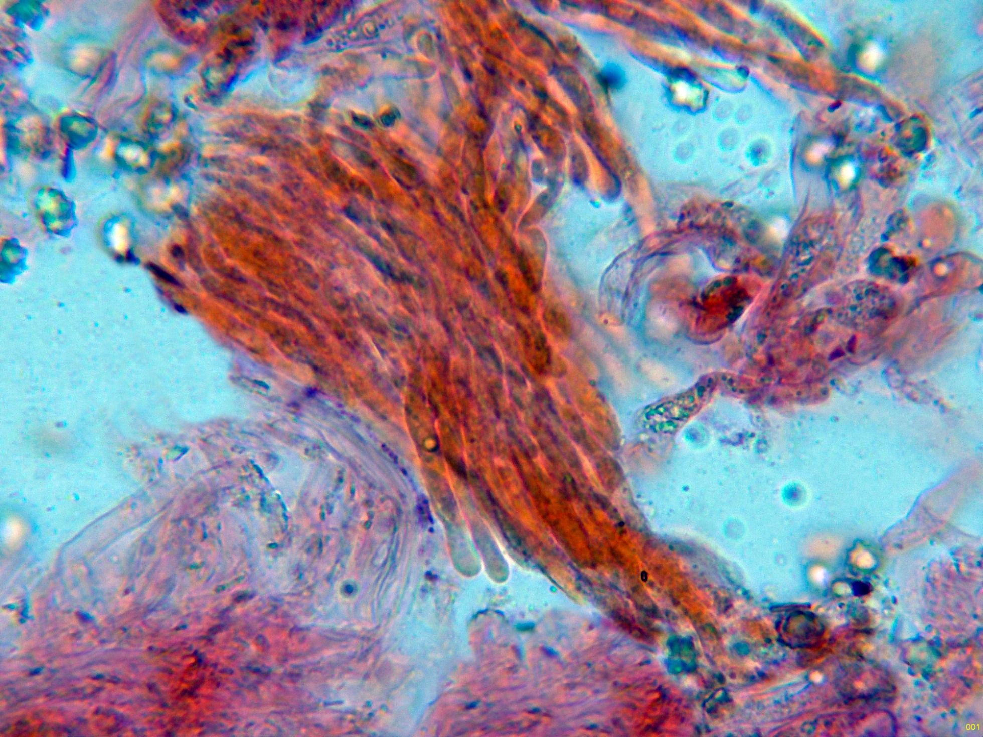 Hifas de la suprapellis en agua, con numerosas hifas terminales con formas redondeadas, fuertemente pigmentadas:
