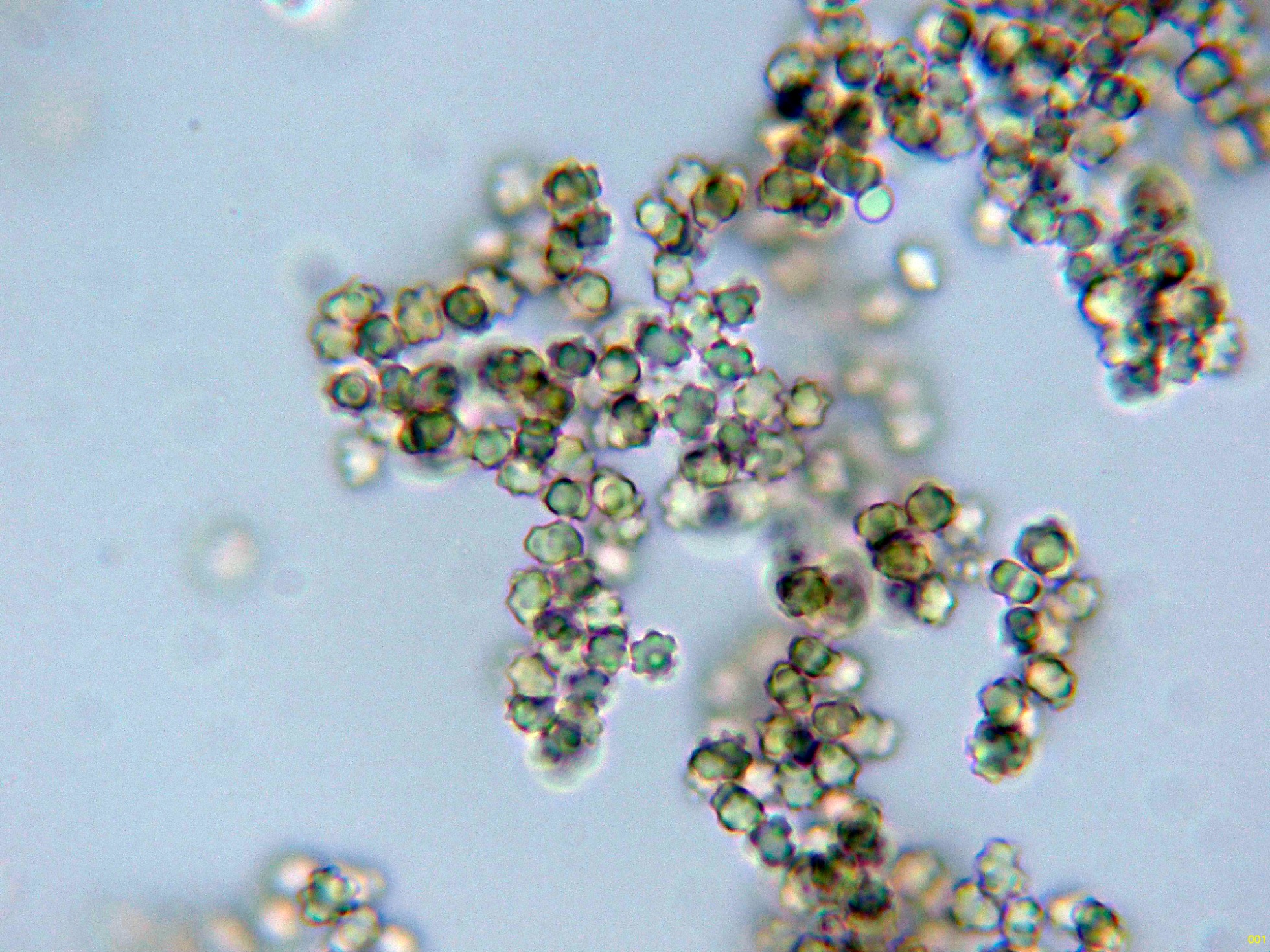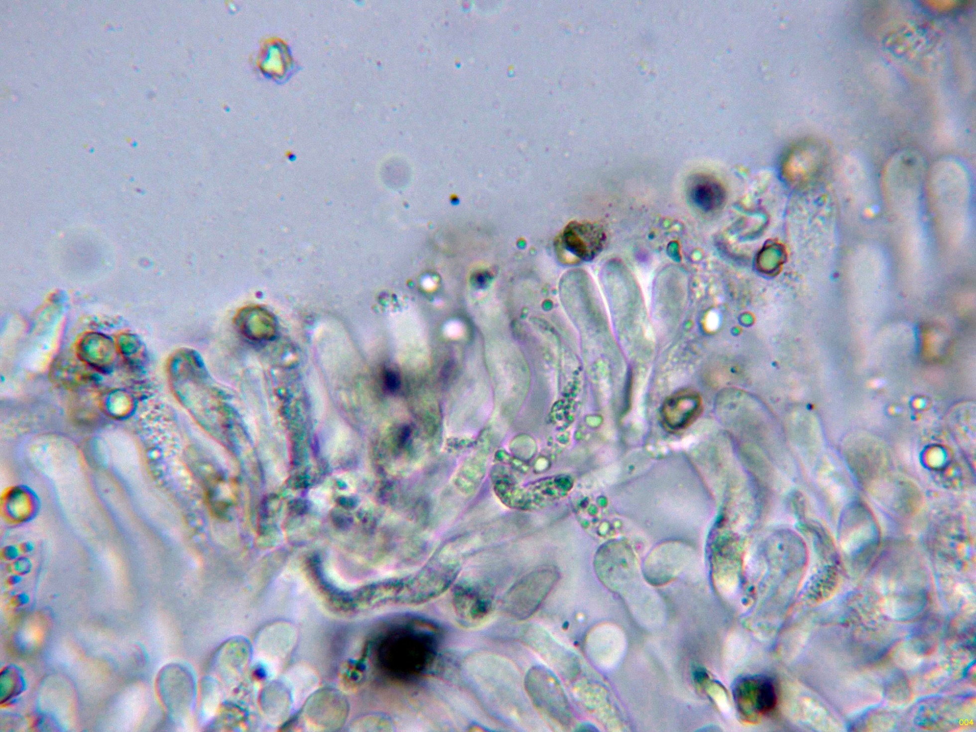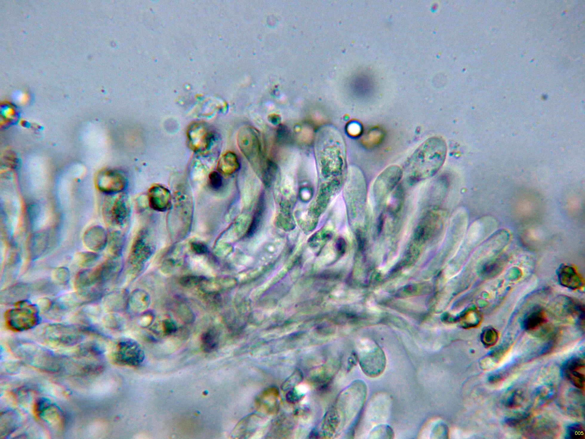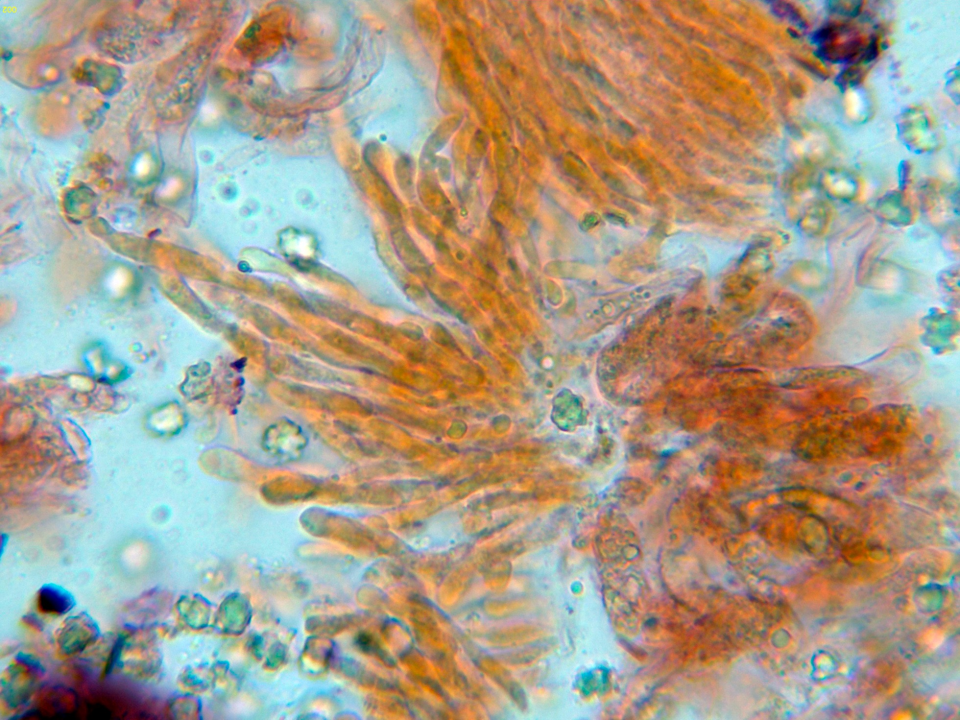 Las esporas en reactivo de Melzer, con un comportamiento amiloide por la presencia de almidón: