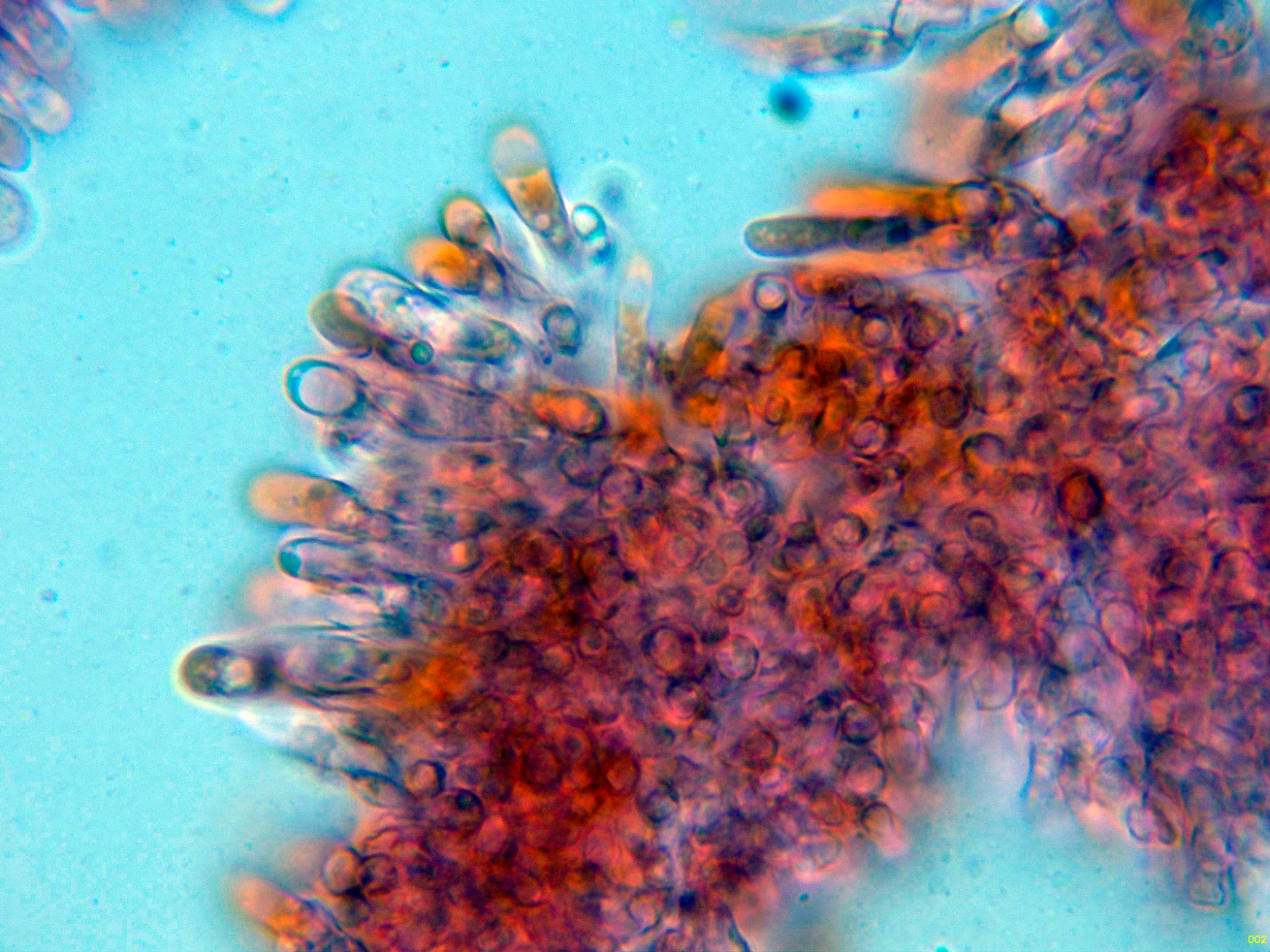 Detalle de las láminas de color marrón por el efecto de la esporada: