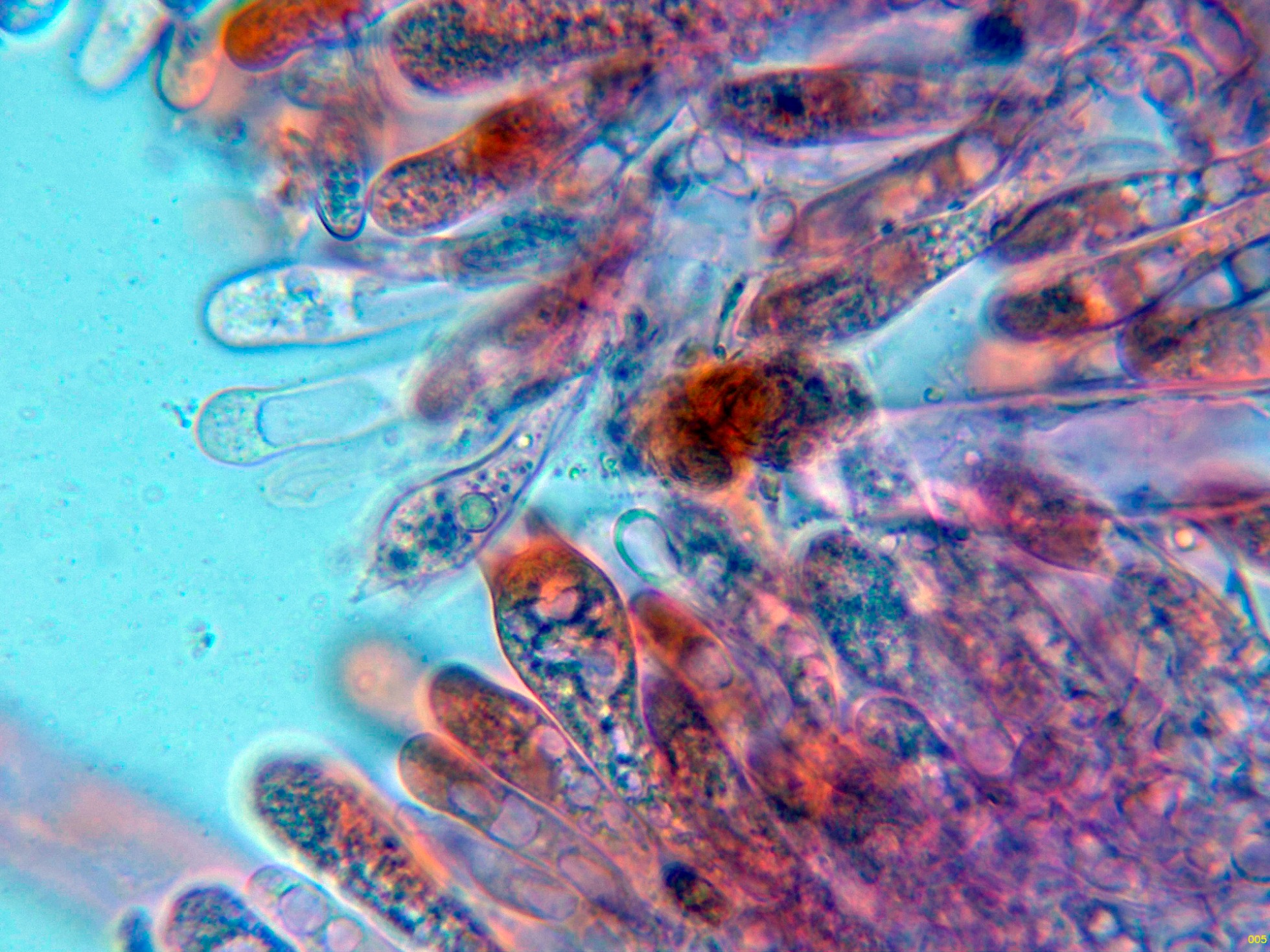 Pleurocistidios presentes en la cara laminar, con una morfología y medidas muy parecidas a los queilocistidios: