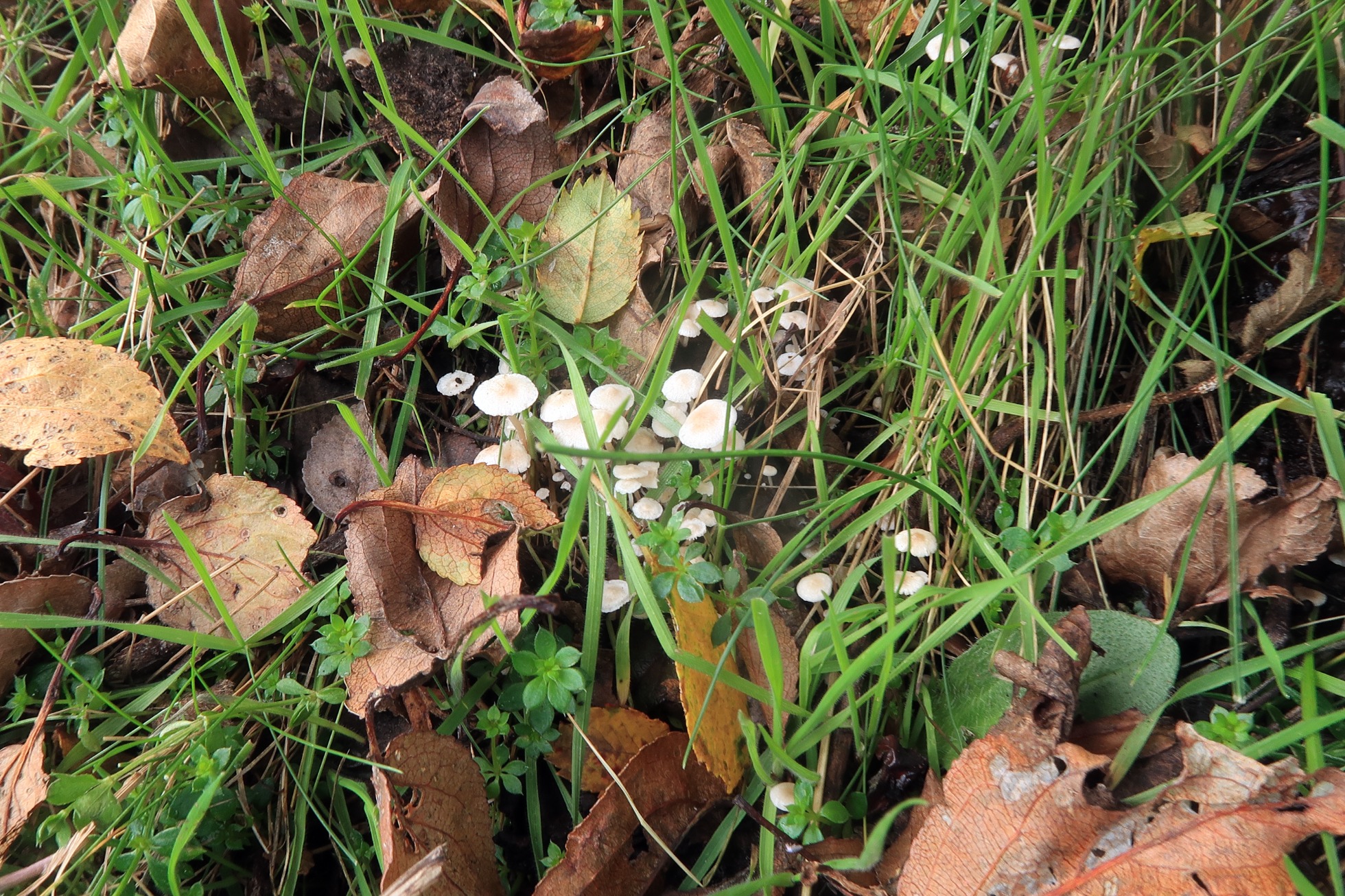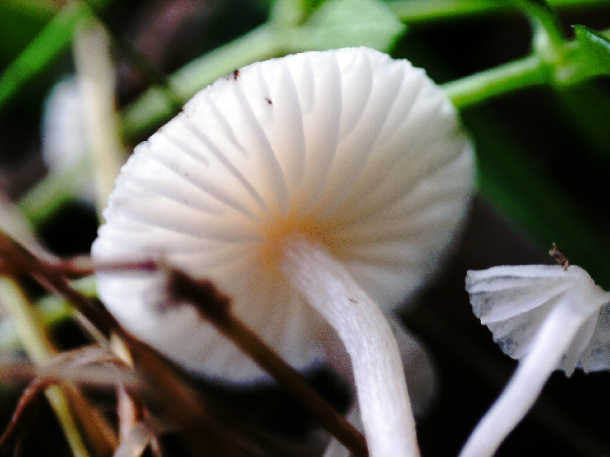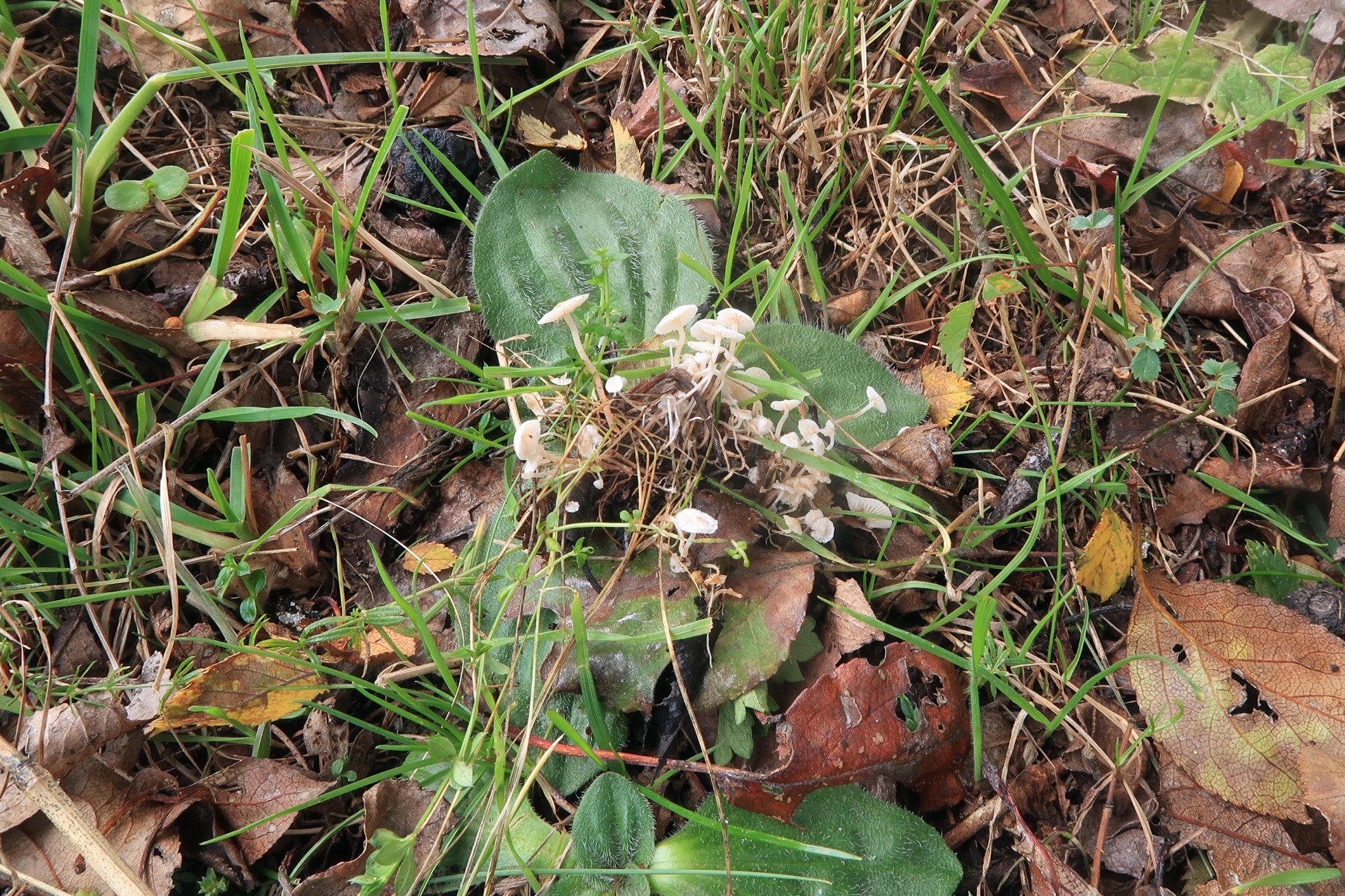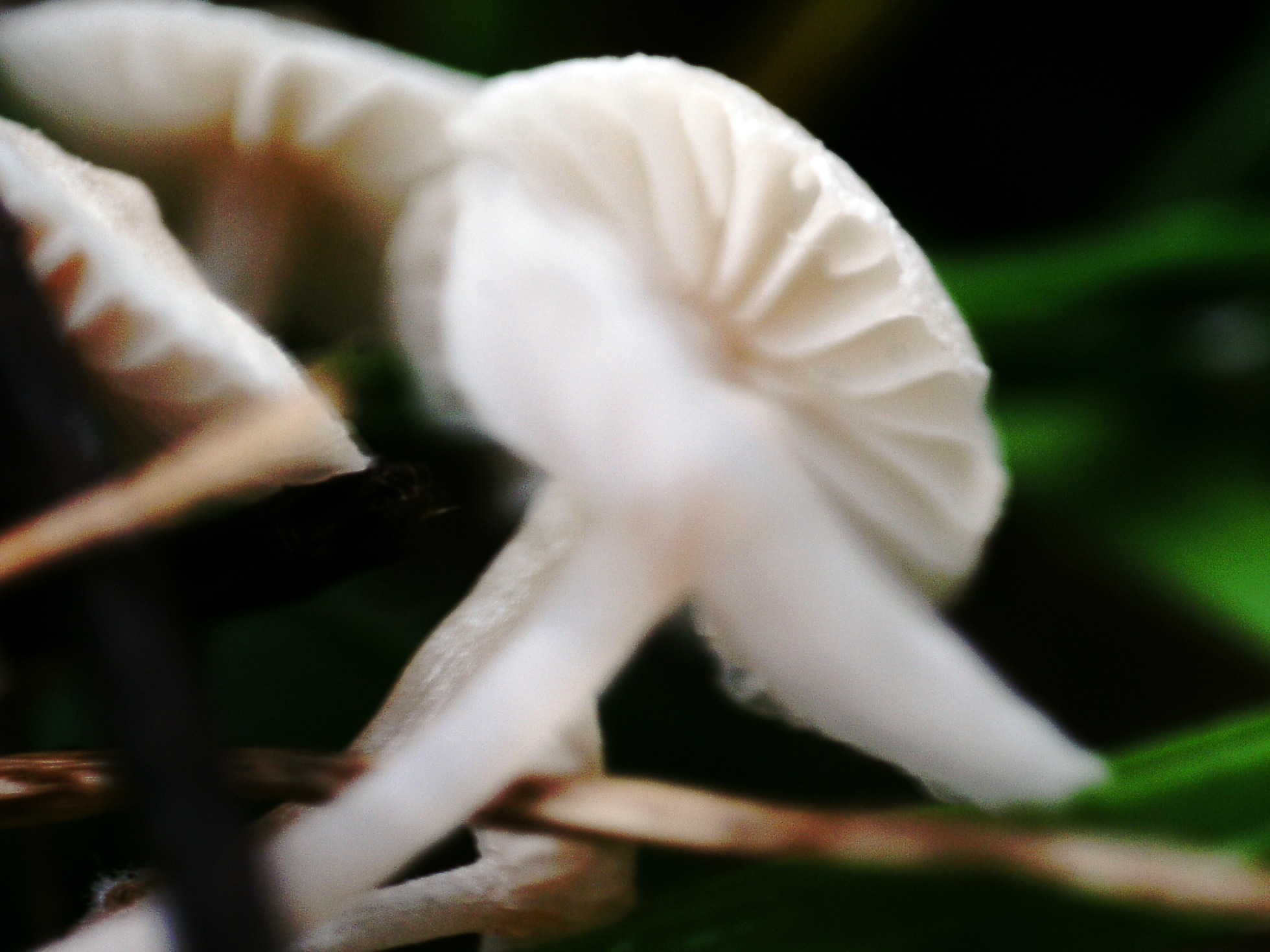Justo por debajo de la Pholiota squarrosa que he presentado recientemente, brotaban una buena cantidad de pequeñas setillas de color blanco, en un primer momento creí que brotaban sobre restos de otros hongos, aunque lo hacían sobre restos vegetales en descomposición, al llegar a casa pude comprobar que por la presencia de esclerocios de color anaranjado, estaba ante la: