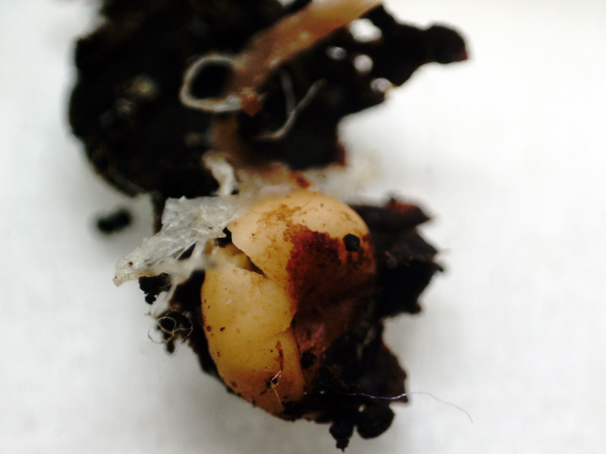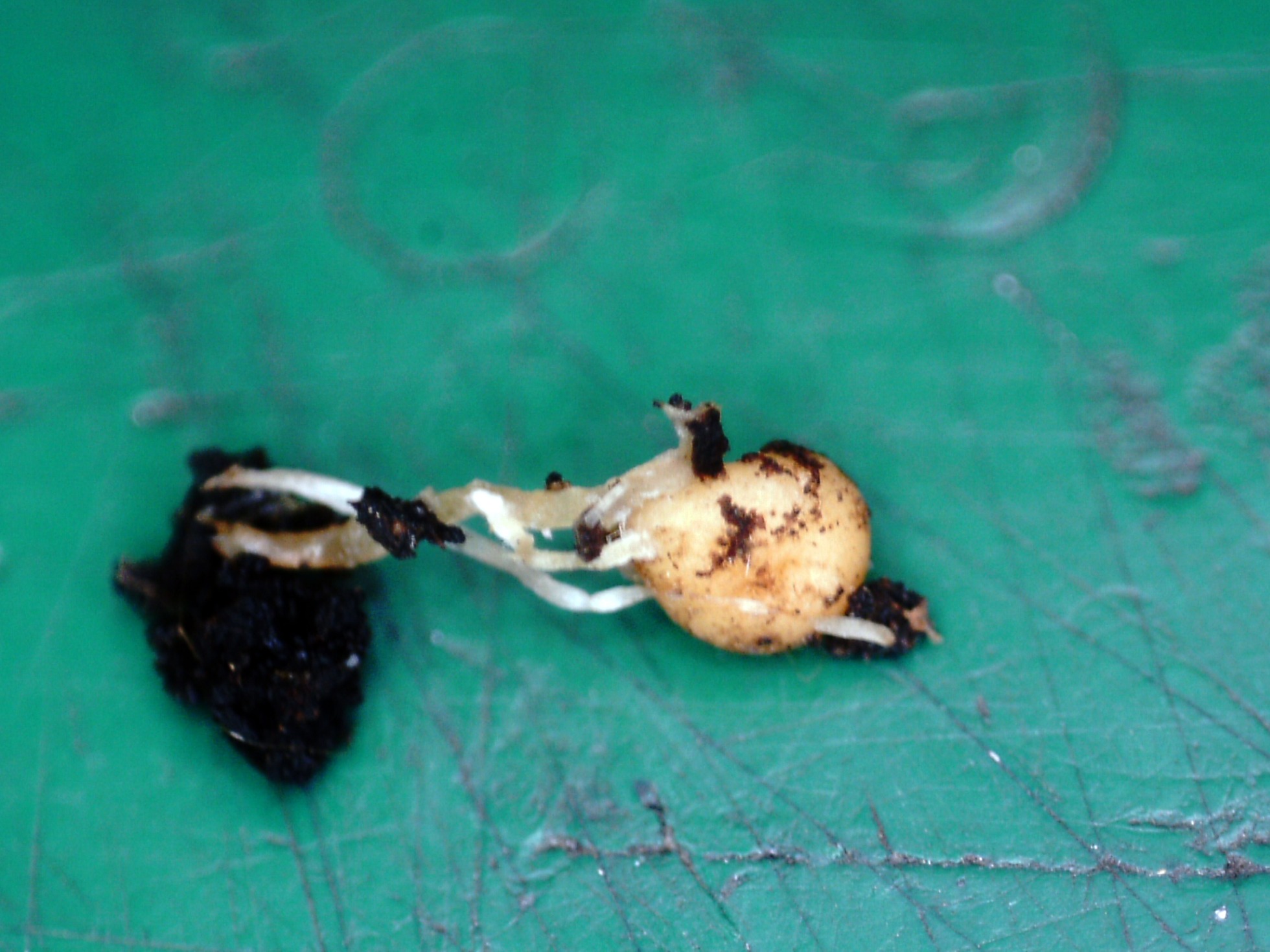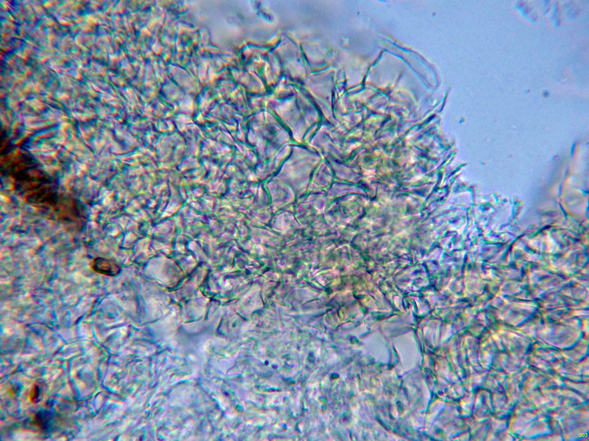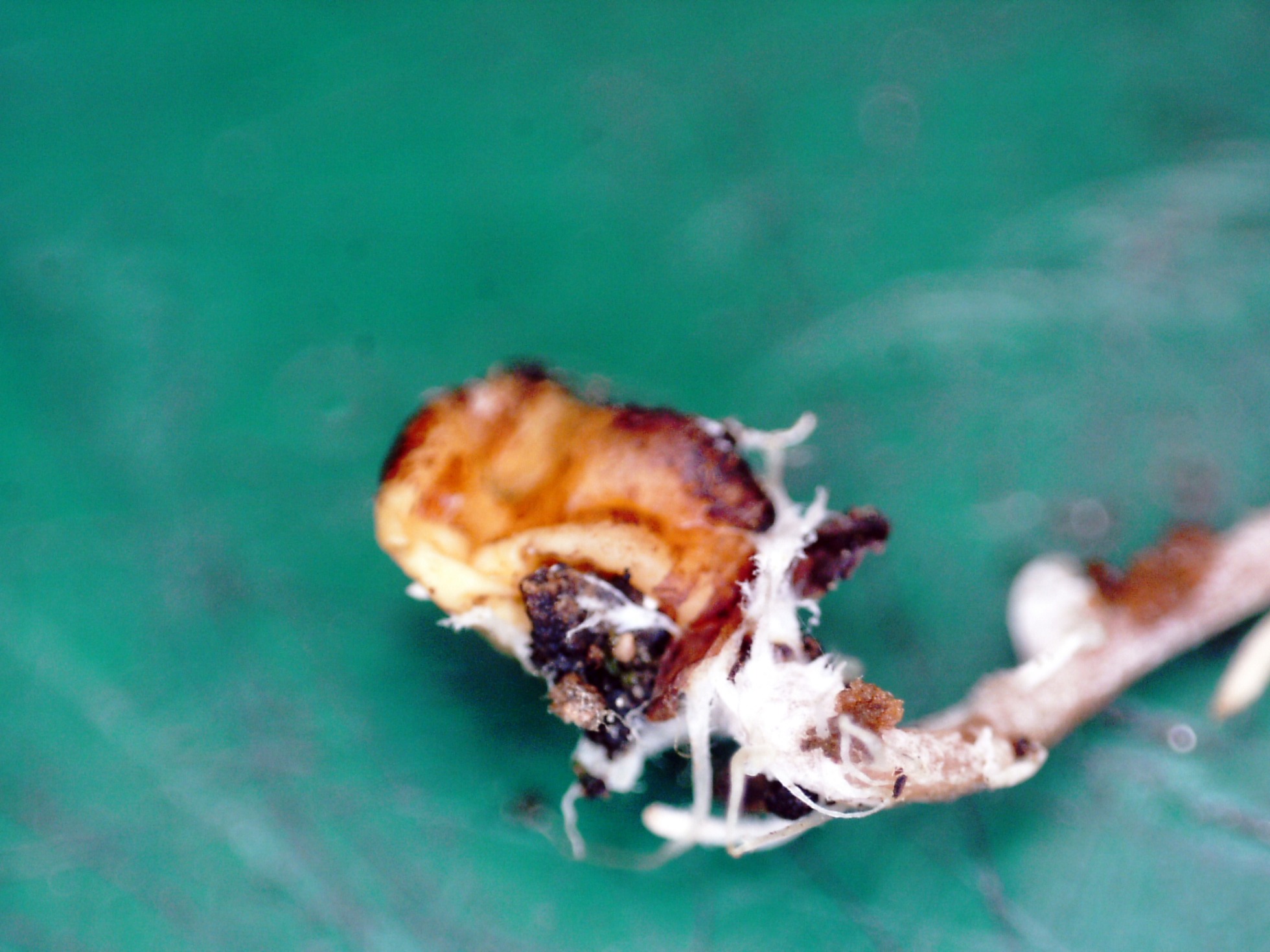 Justo por debajo de la Pholiota squarrosa que he presentado recientemente, brotaban una buena cantidad de pequeñas setillas de color blanco, en un primer momento creí que brotaban sobre restos de otros hongos, aunque lo hacían sobre restos vegetales en descomposición, al llegar a casa pude comprobar que por la presencia de esclerocios de color anaranjado, estaba ante la: