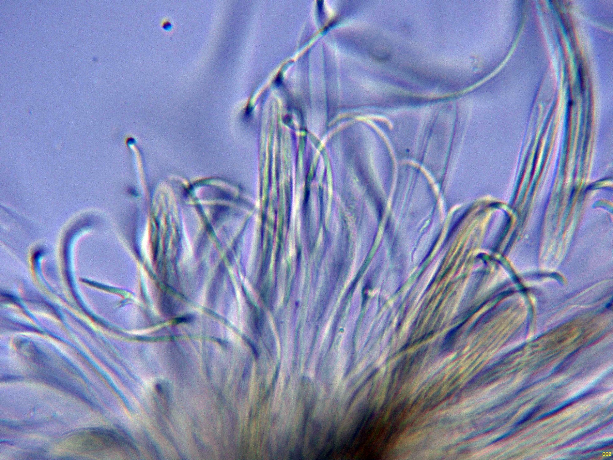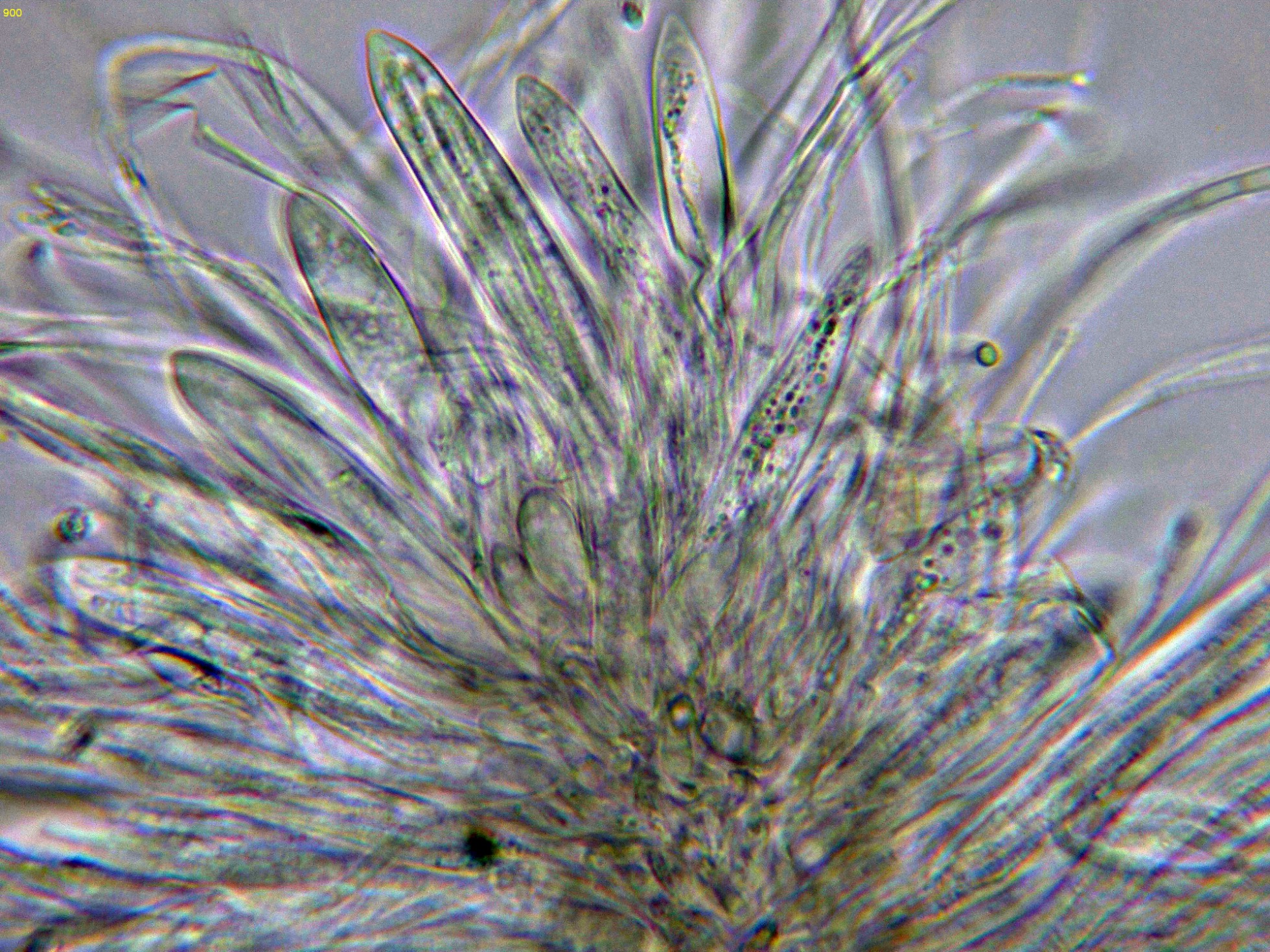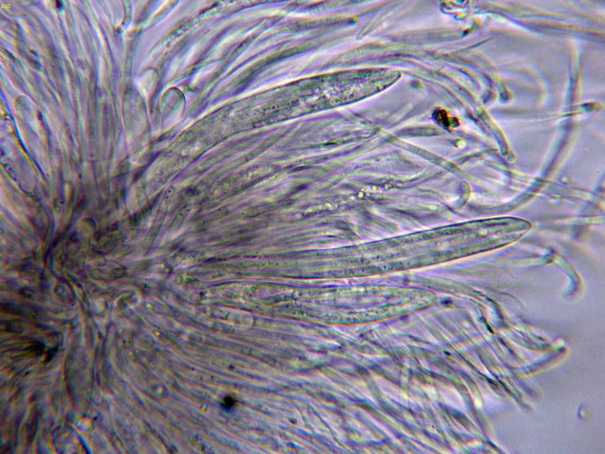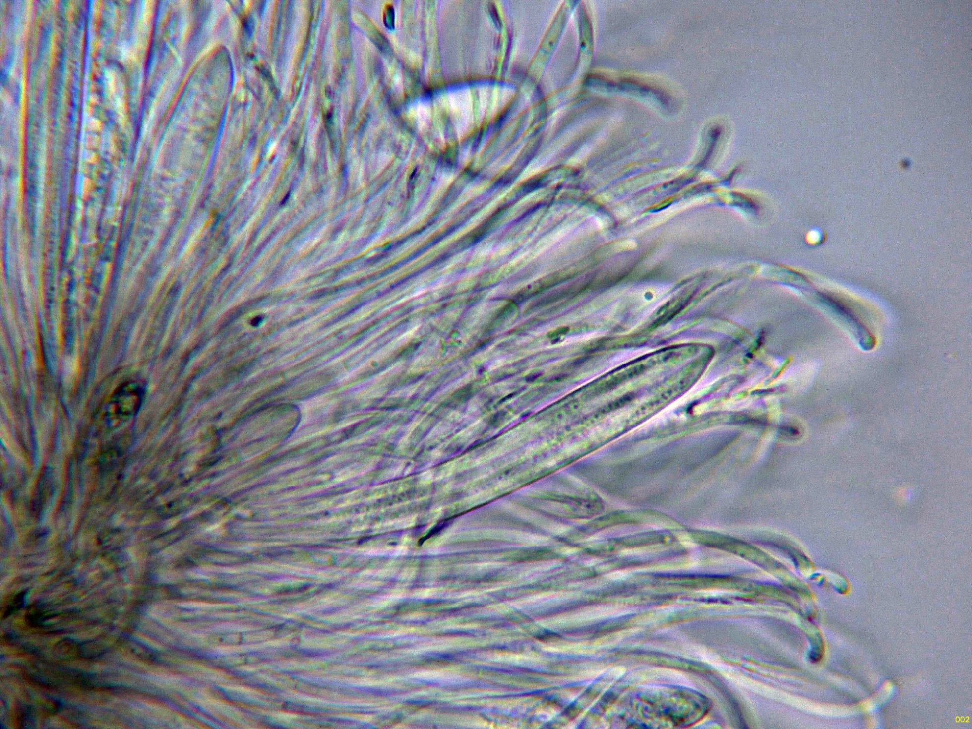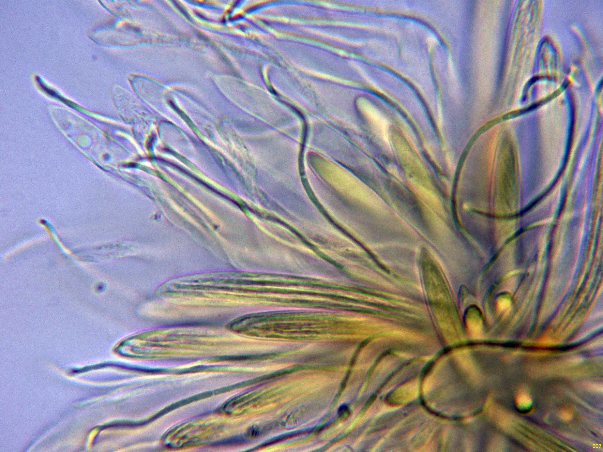 Los ascos en agua, estos ascos con unas medidas de (56.9) 71.3 - 85.2 (86.2) × (6.4) 7.3 - 9.9 (11) µm, Me = 77.5 × 8.6 µm.: