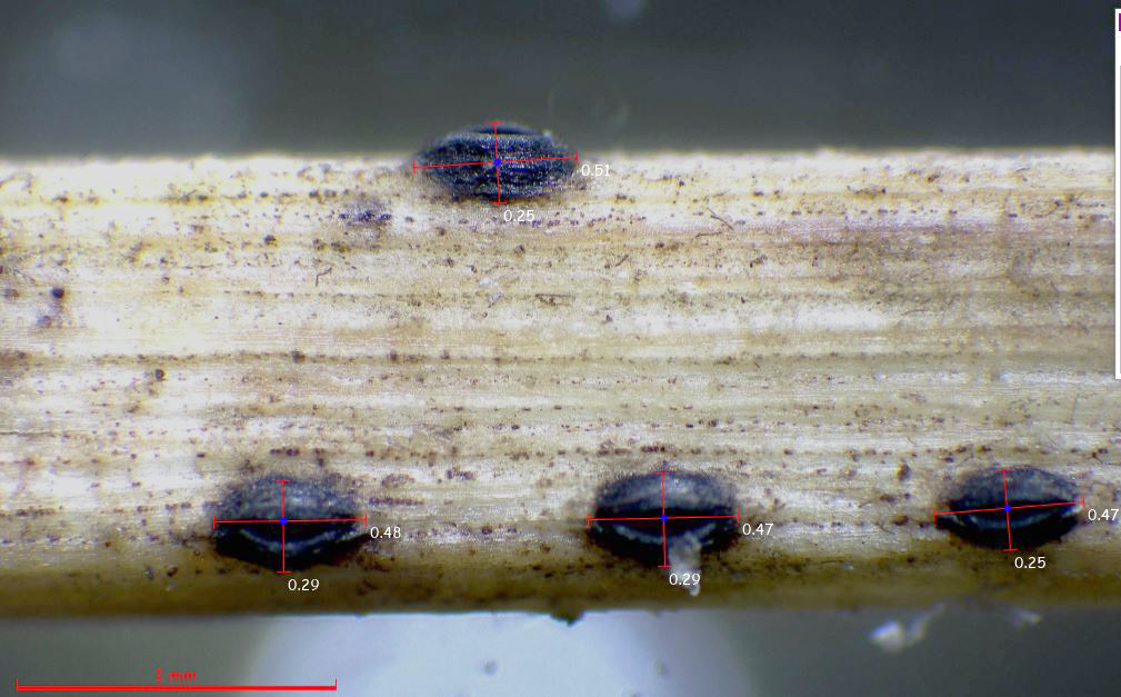 Las esporas presentan una longitud moderadamente inferior a la longitud de los ascos, y se atribuyen unas medidas esporales para el Lophodermium gramineum de 30-60 x 1.5-2.0 μm., muy acordes con las esporas observadas dentro de los ascos del presente estudio.