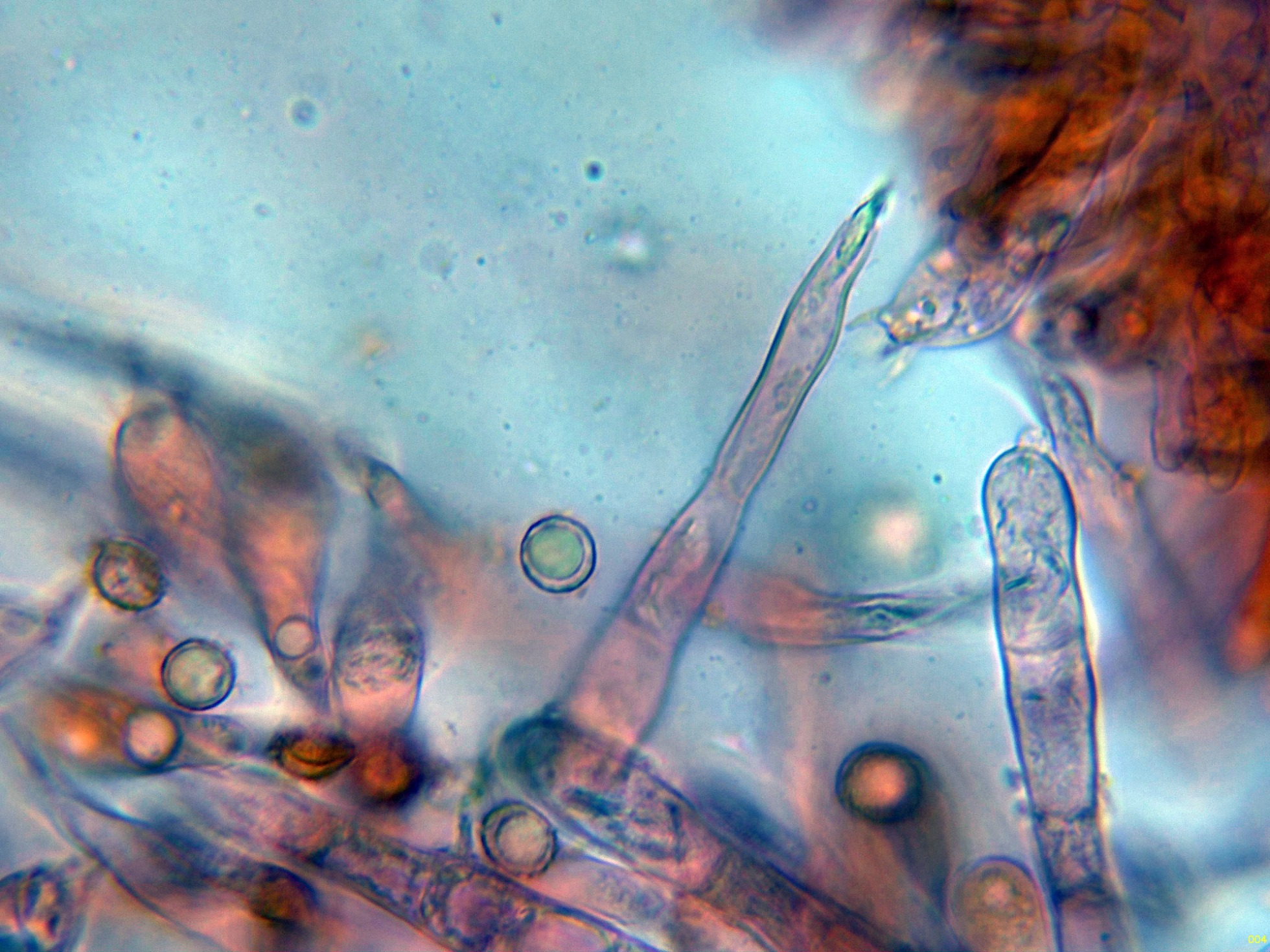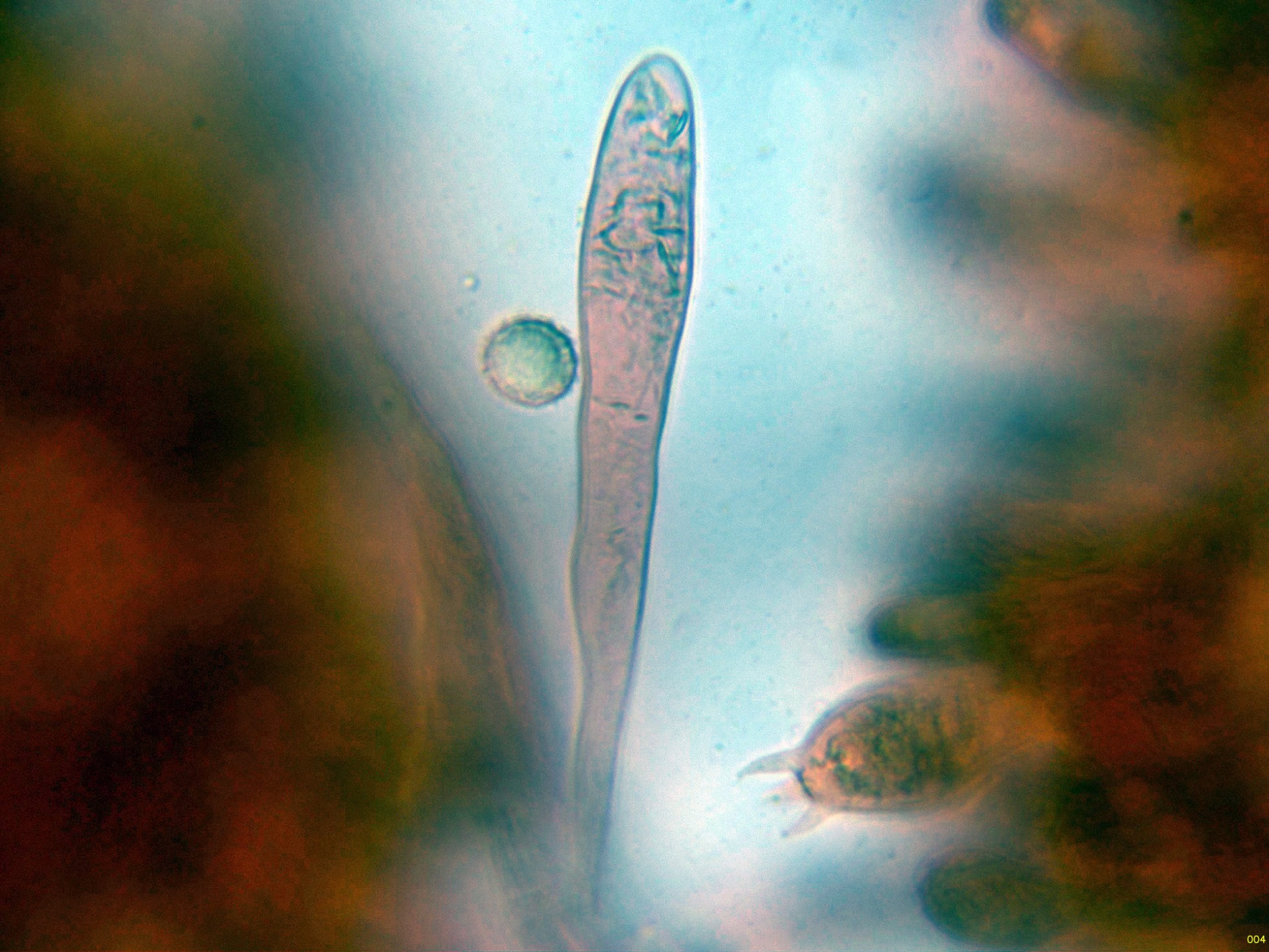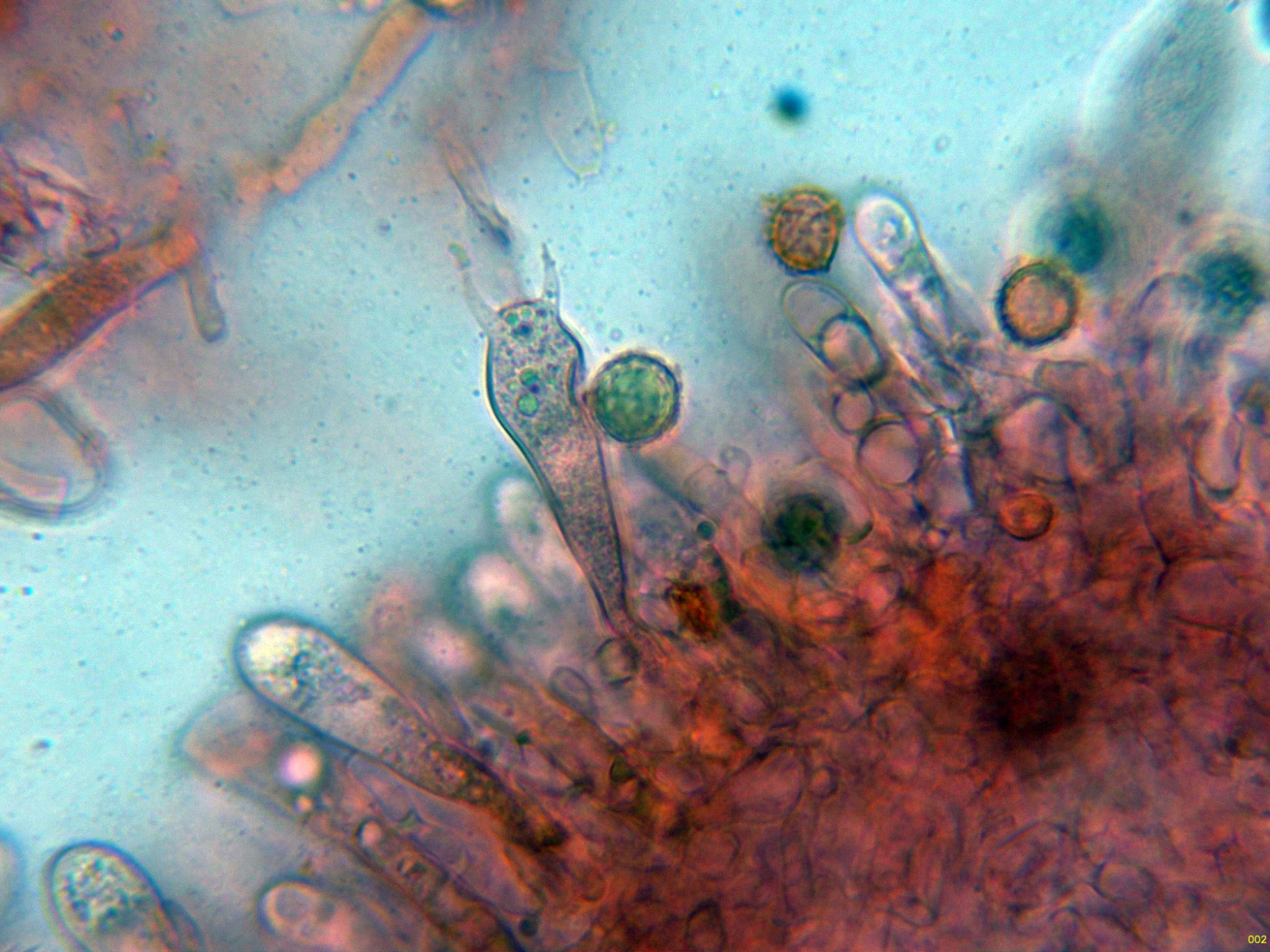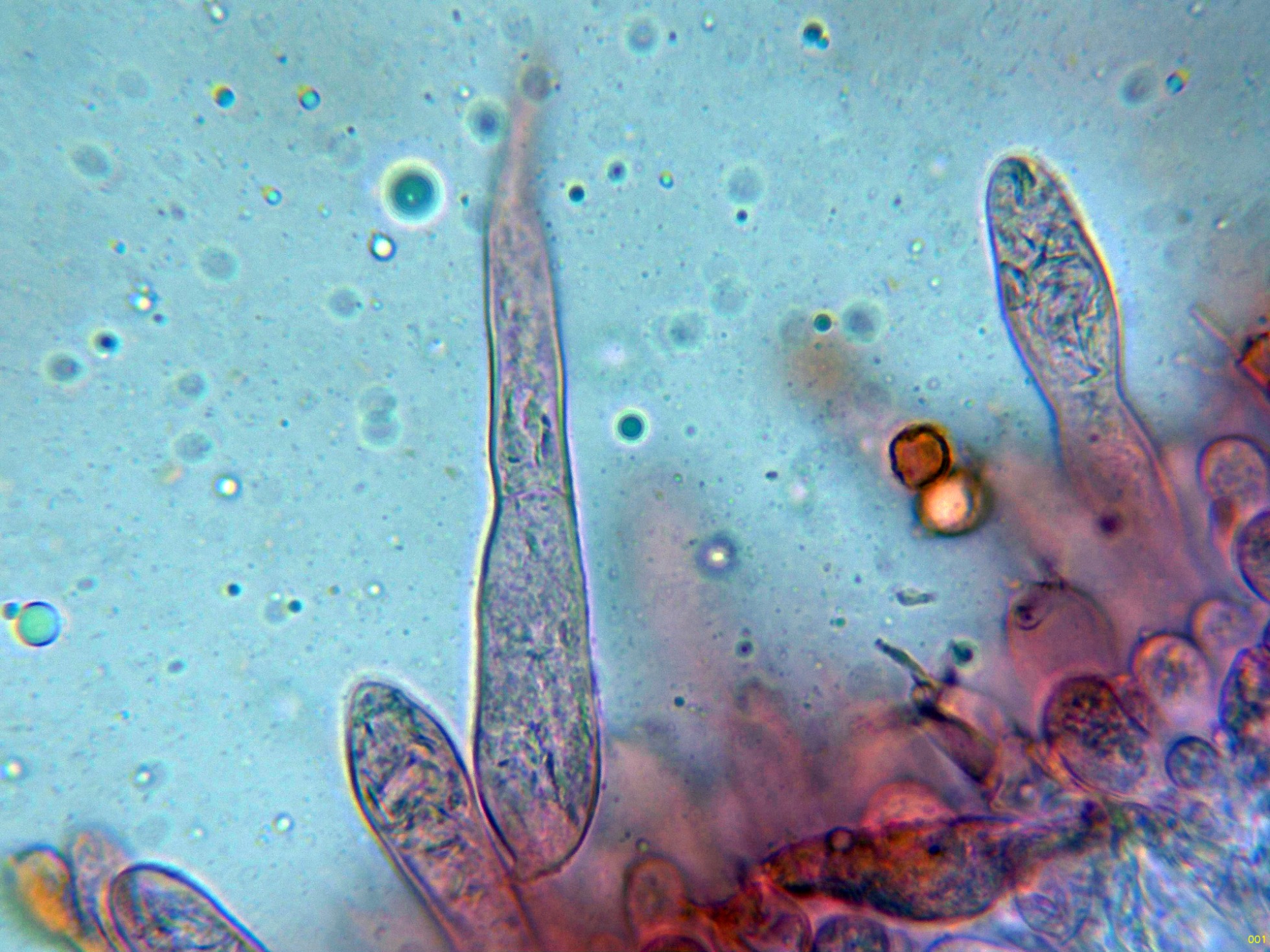 Pleurocistidios asimismo escasos con una morfología parecida: