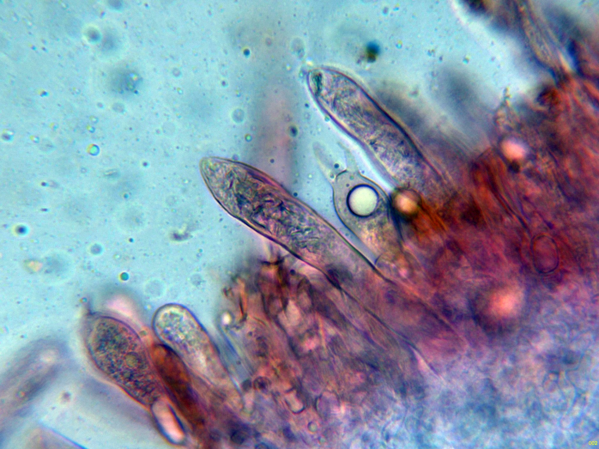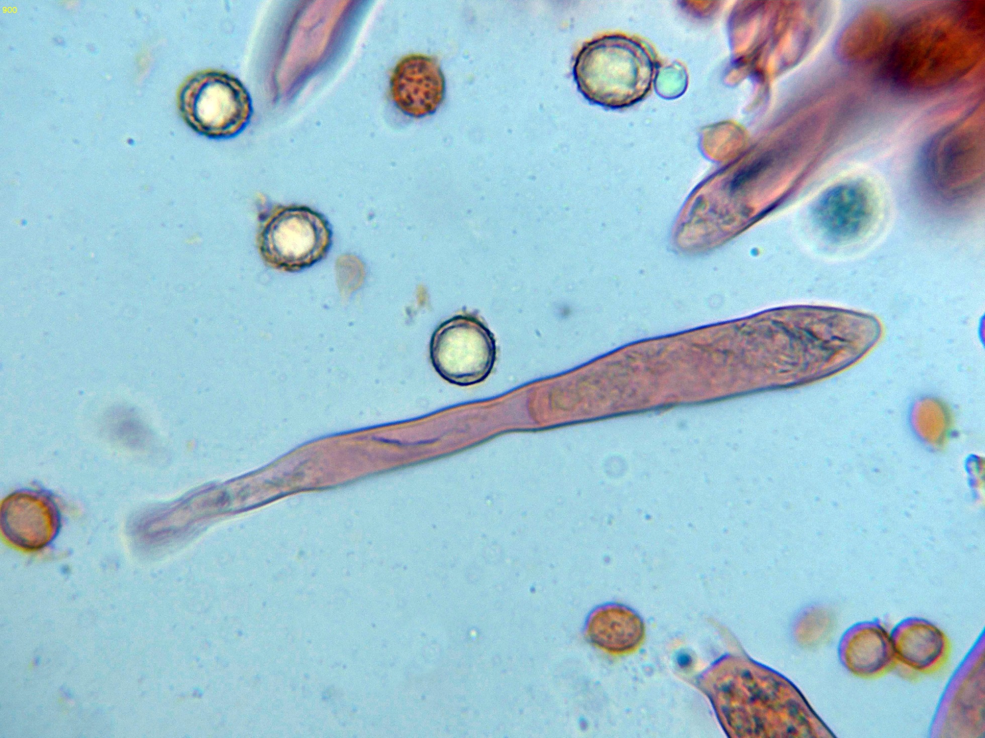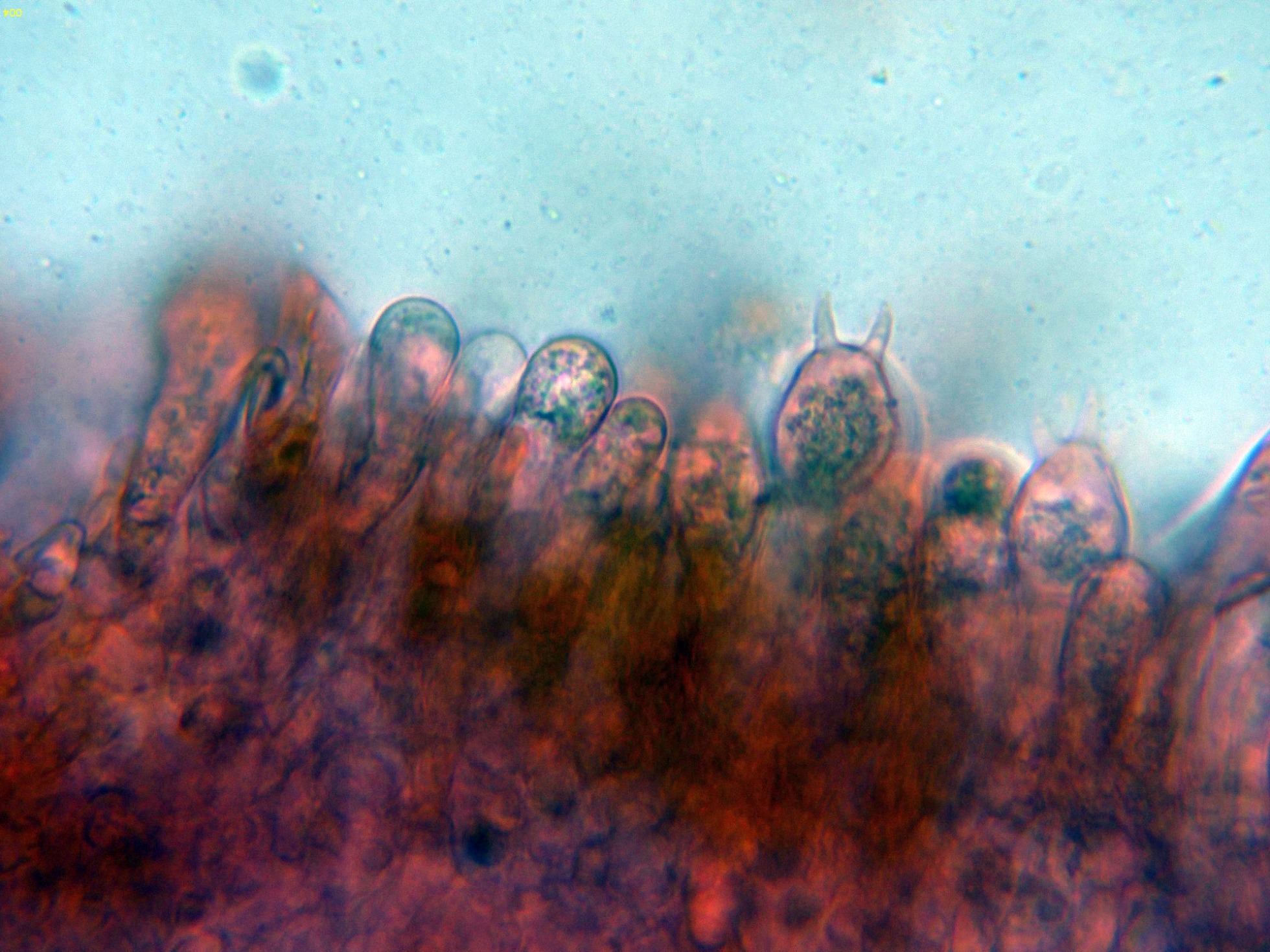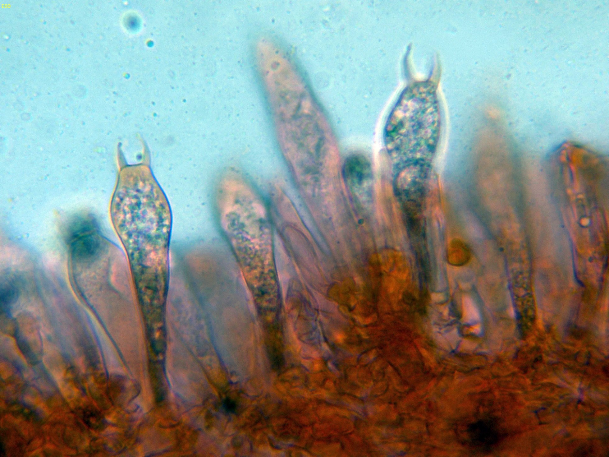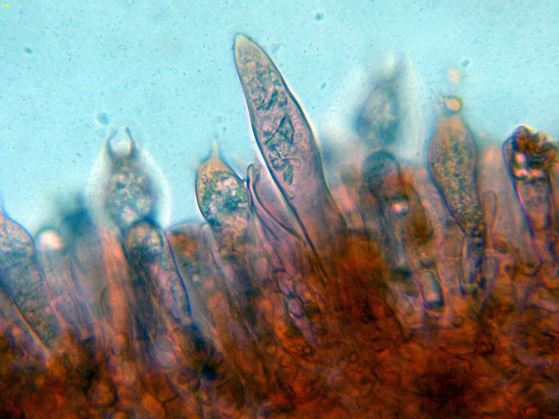 Queilocistidios dispersos escasos, entre fusiformes y lageniformes, algunos de ellos con un cuello prolongado: