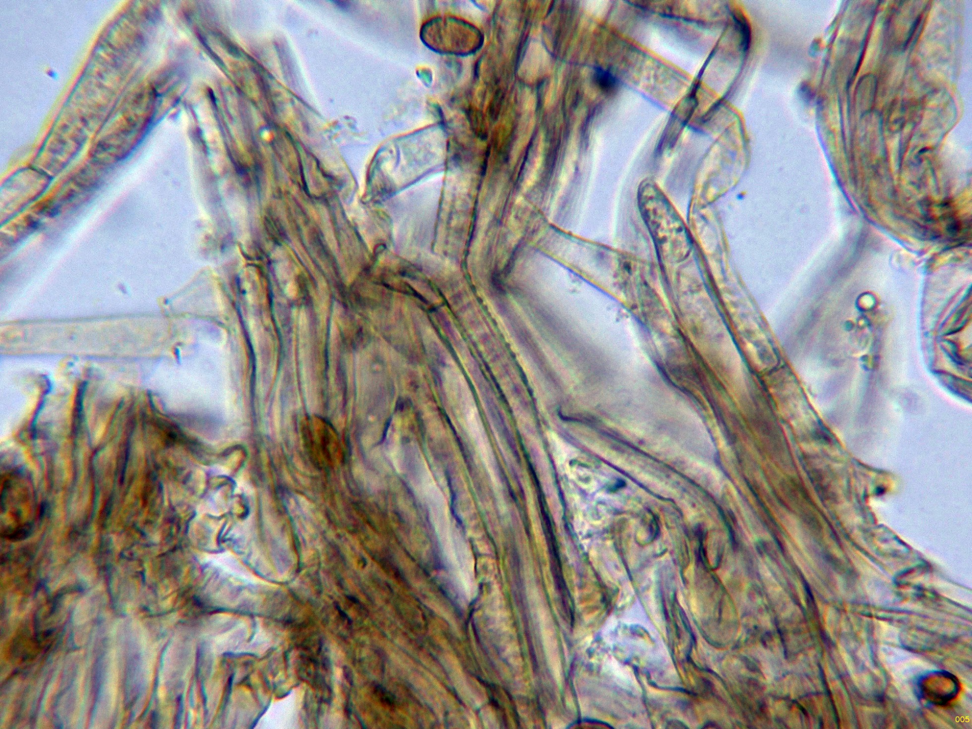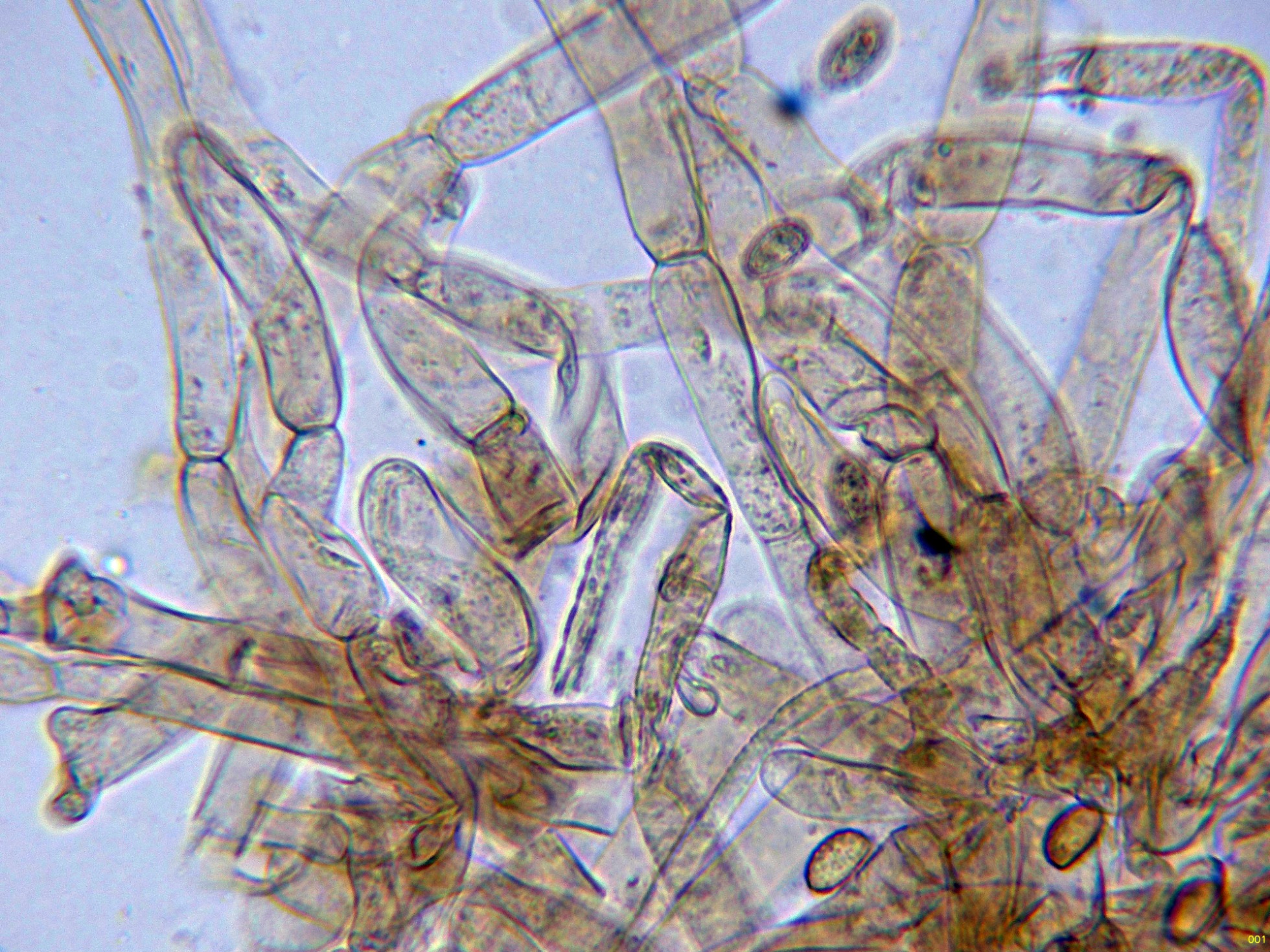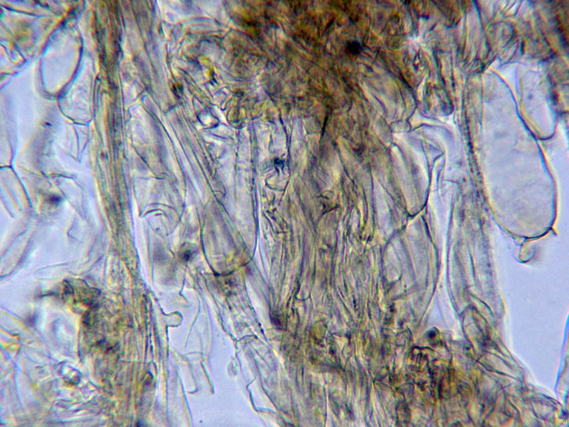 Las hifas de la suprapellis en agua, con pigmento marrón ocráceo y fibuladas: