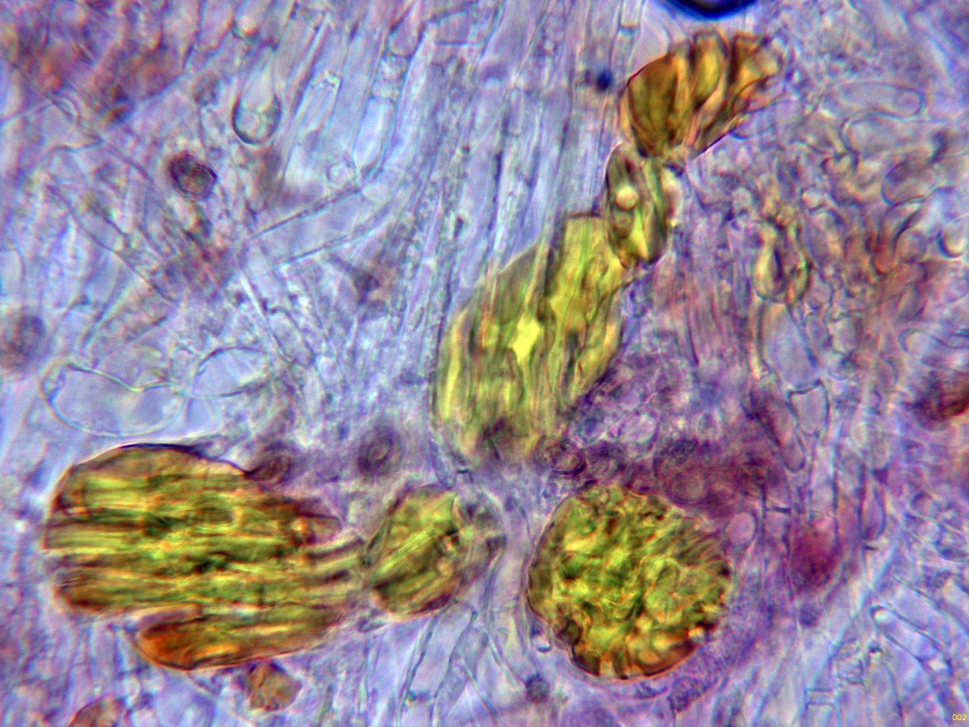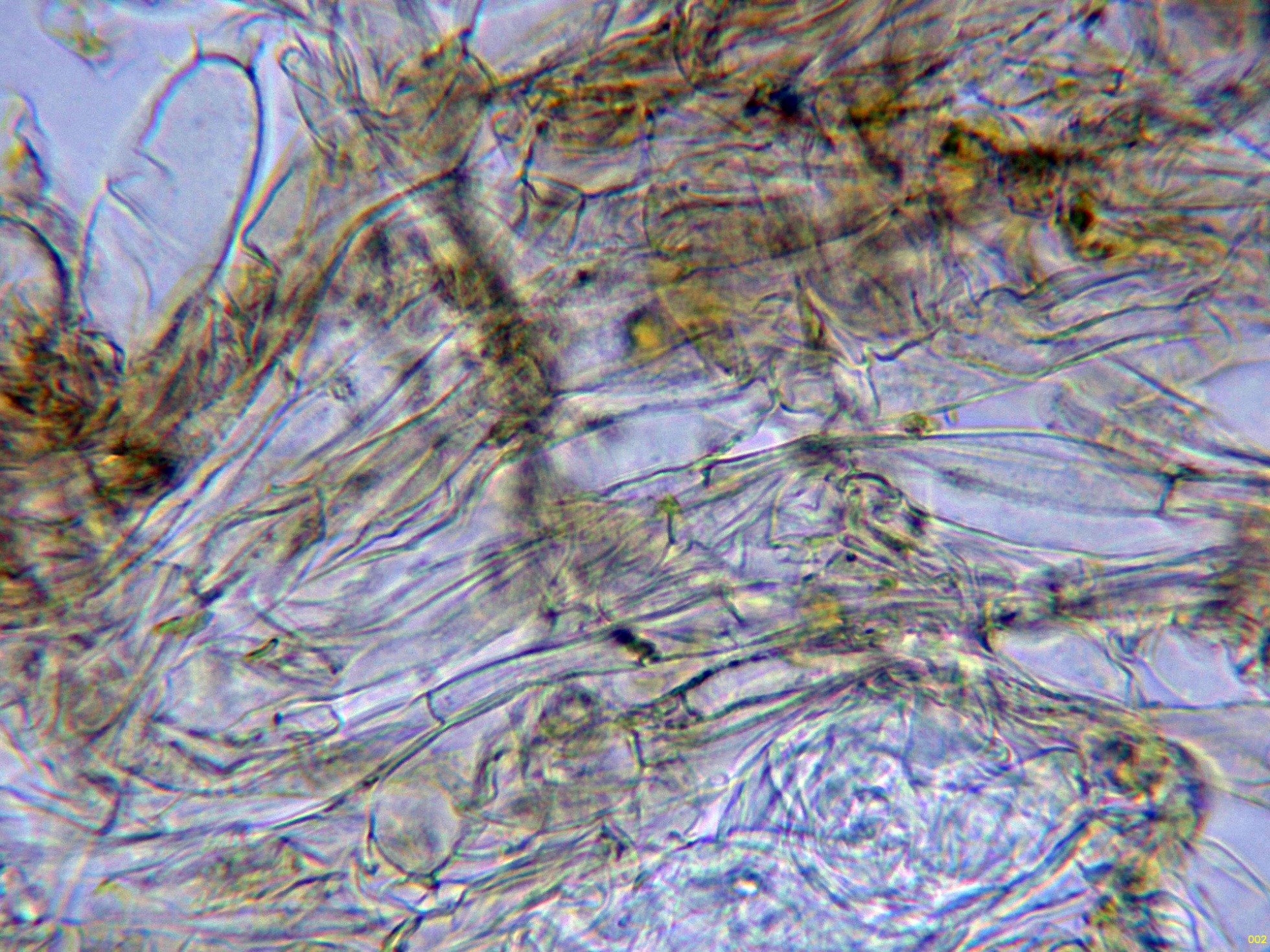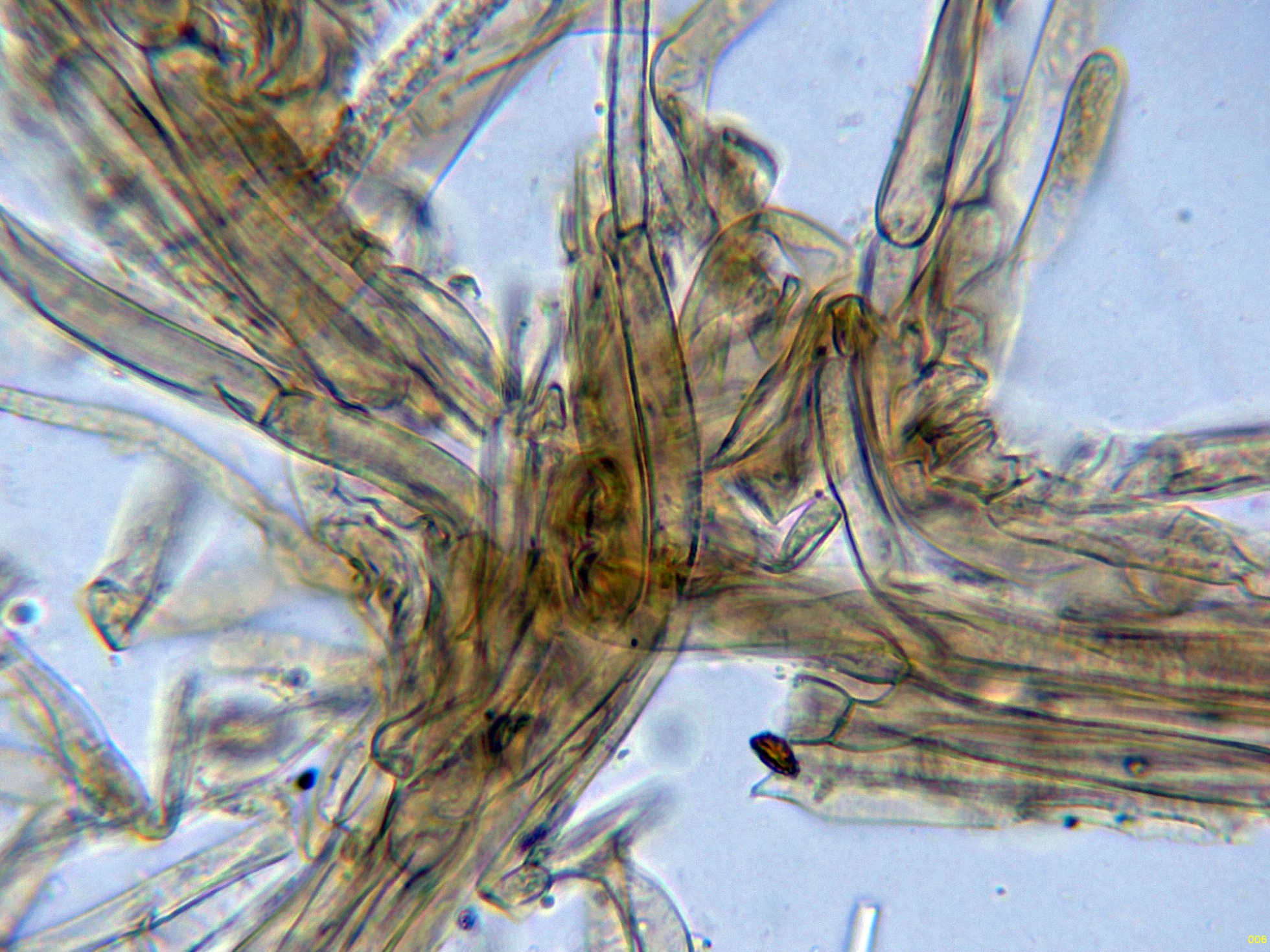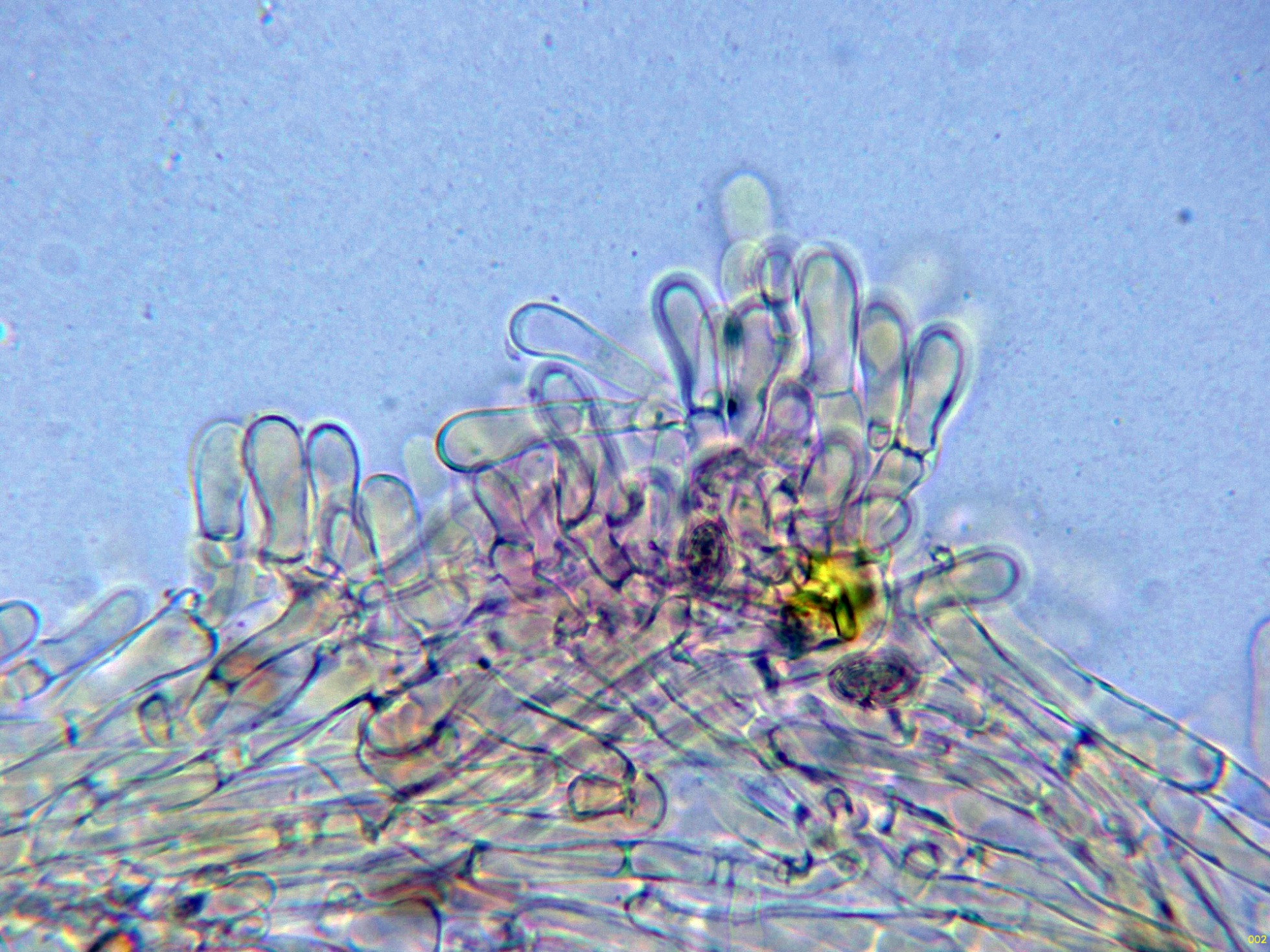 Las hifas de la suprapellis en agua, con pigmento marrón ocráceo y fibuladas: