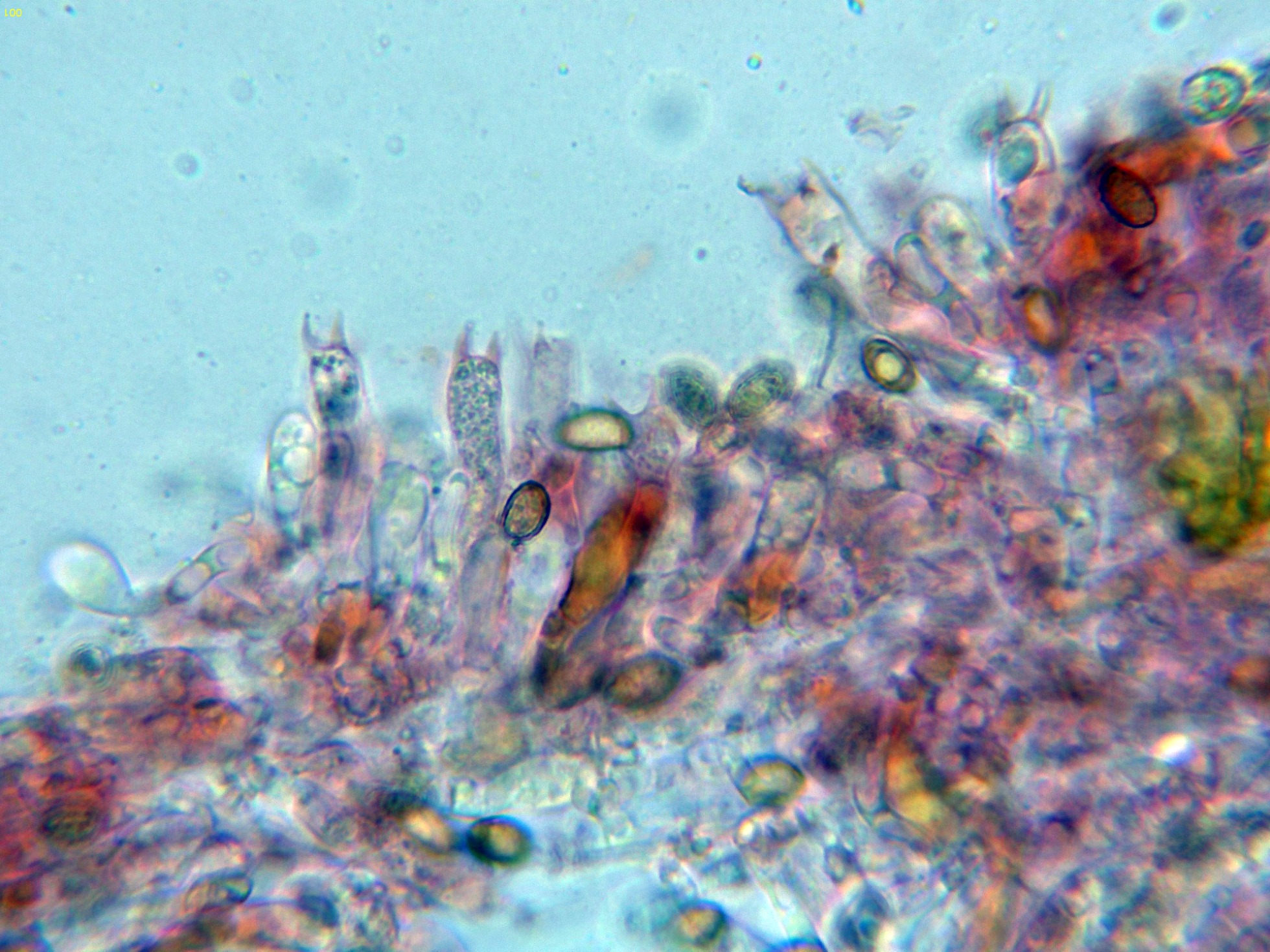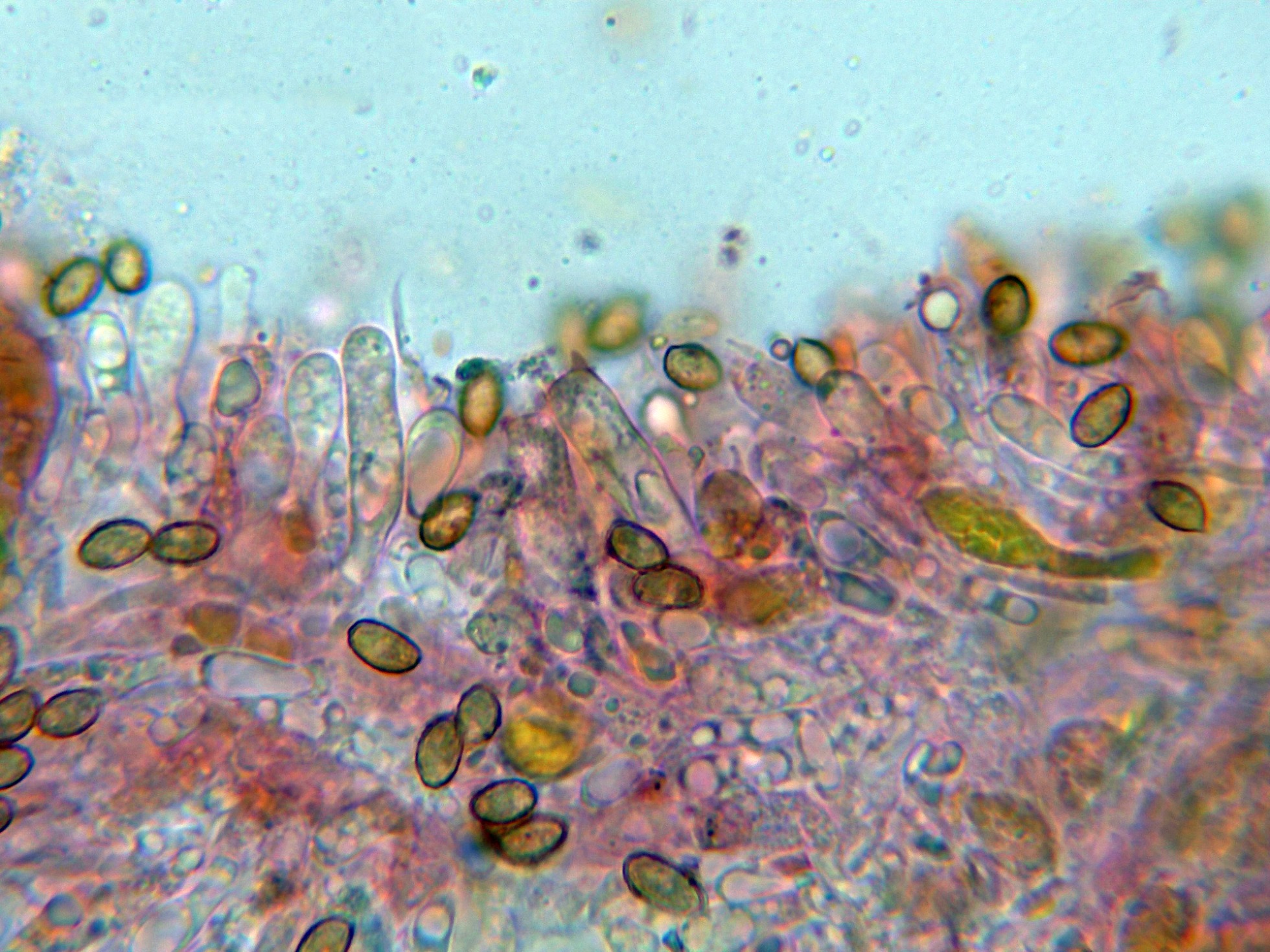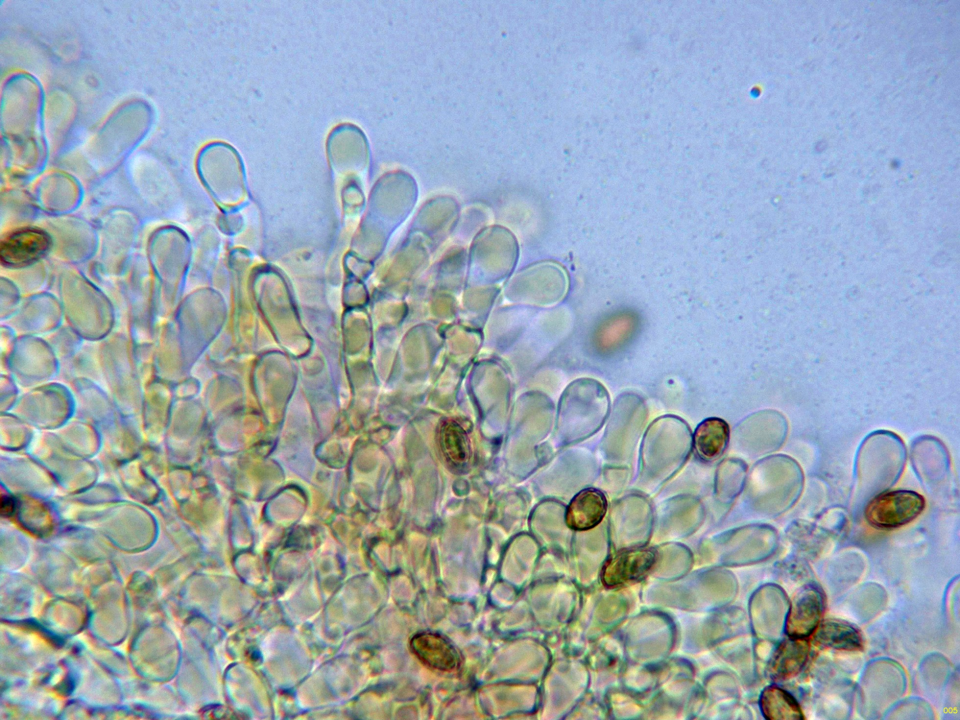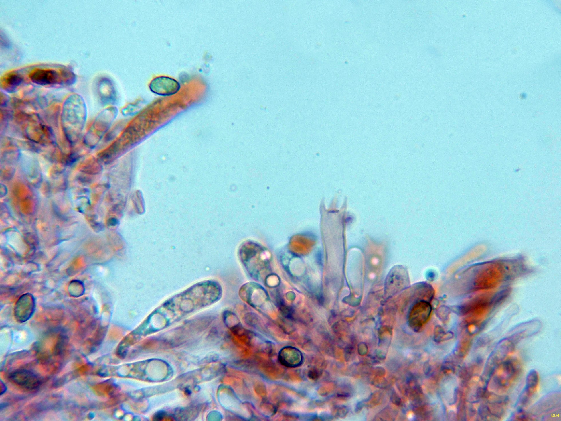 En la arista laminar a destacar una gran cantidad de hifas estériles, con un tamaño muy parecido a los basidios: