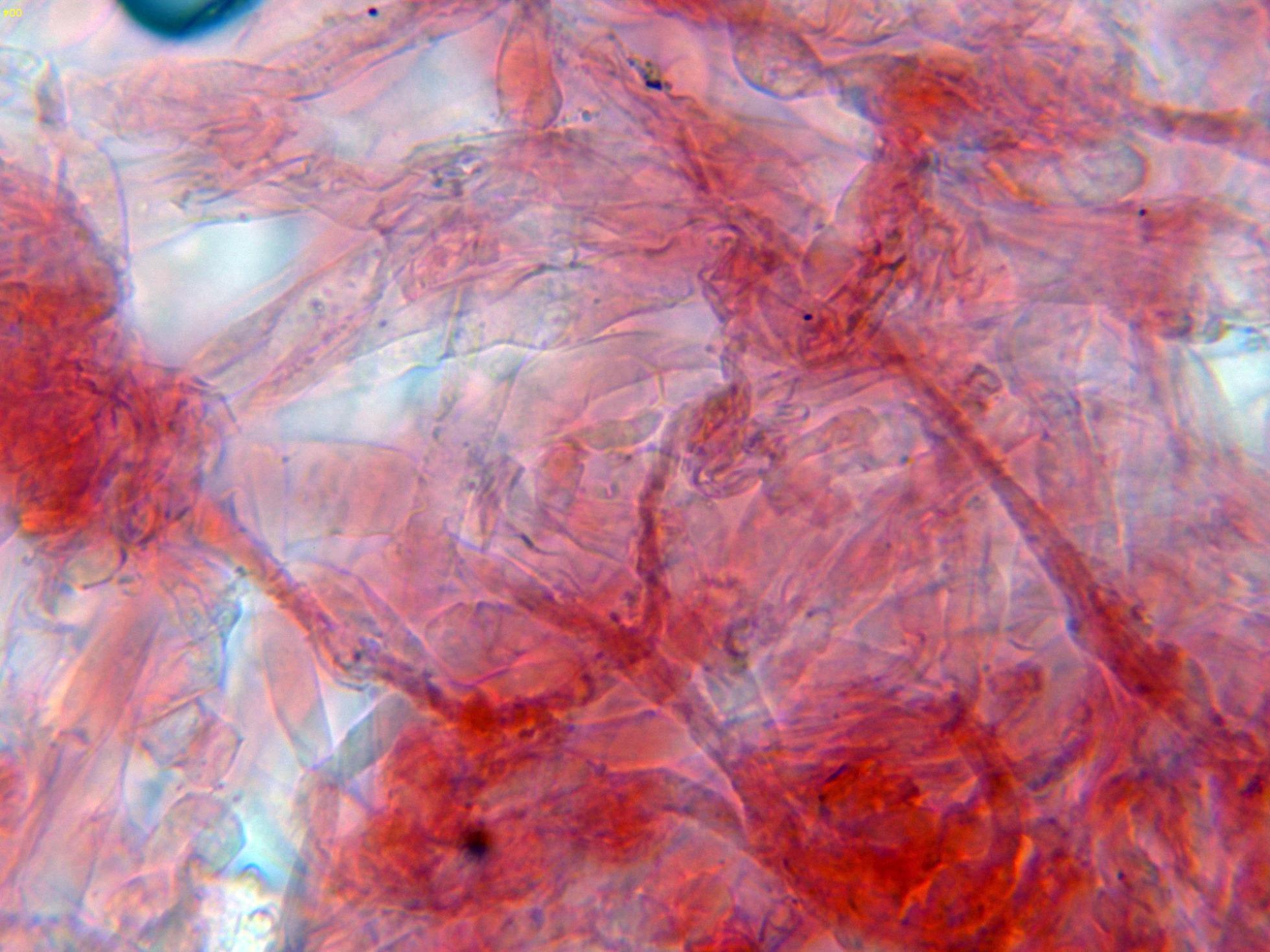 Las clamidosporas inmaduras de los ejemplares jóvenes con algunas de estas hifas terminales en solución de Rojo Congo: