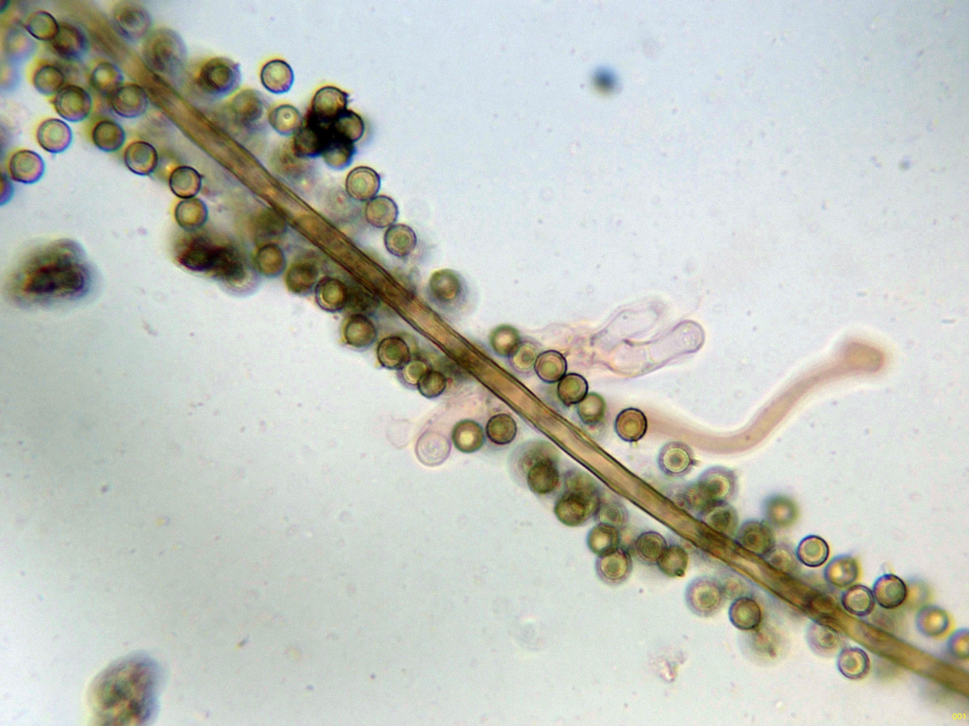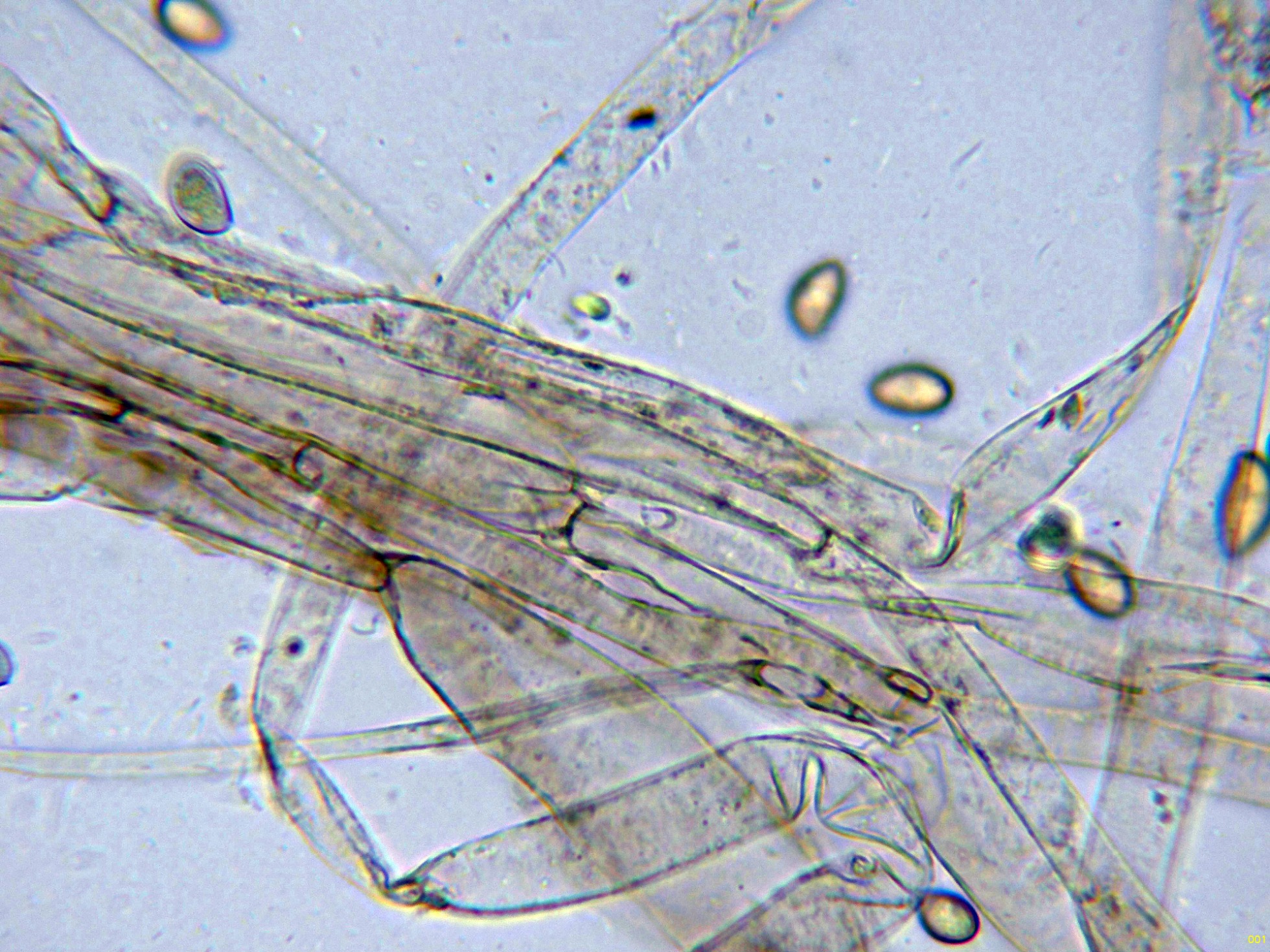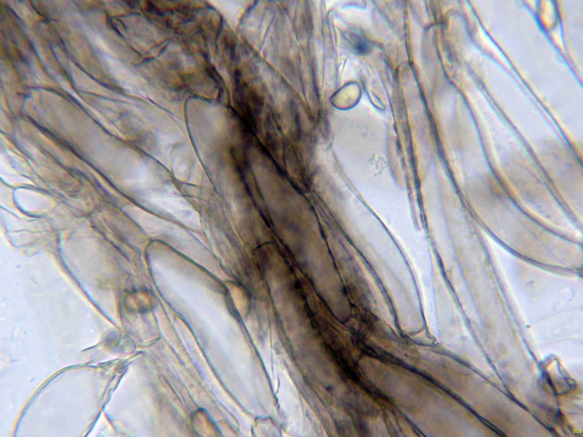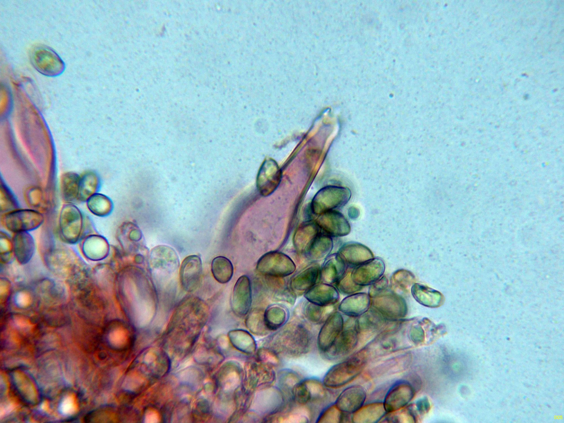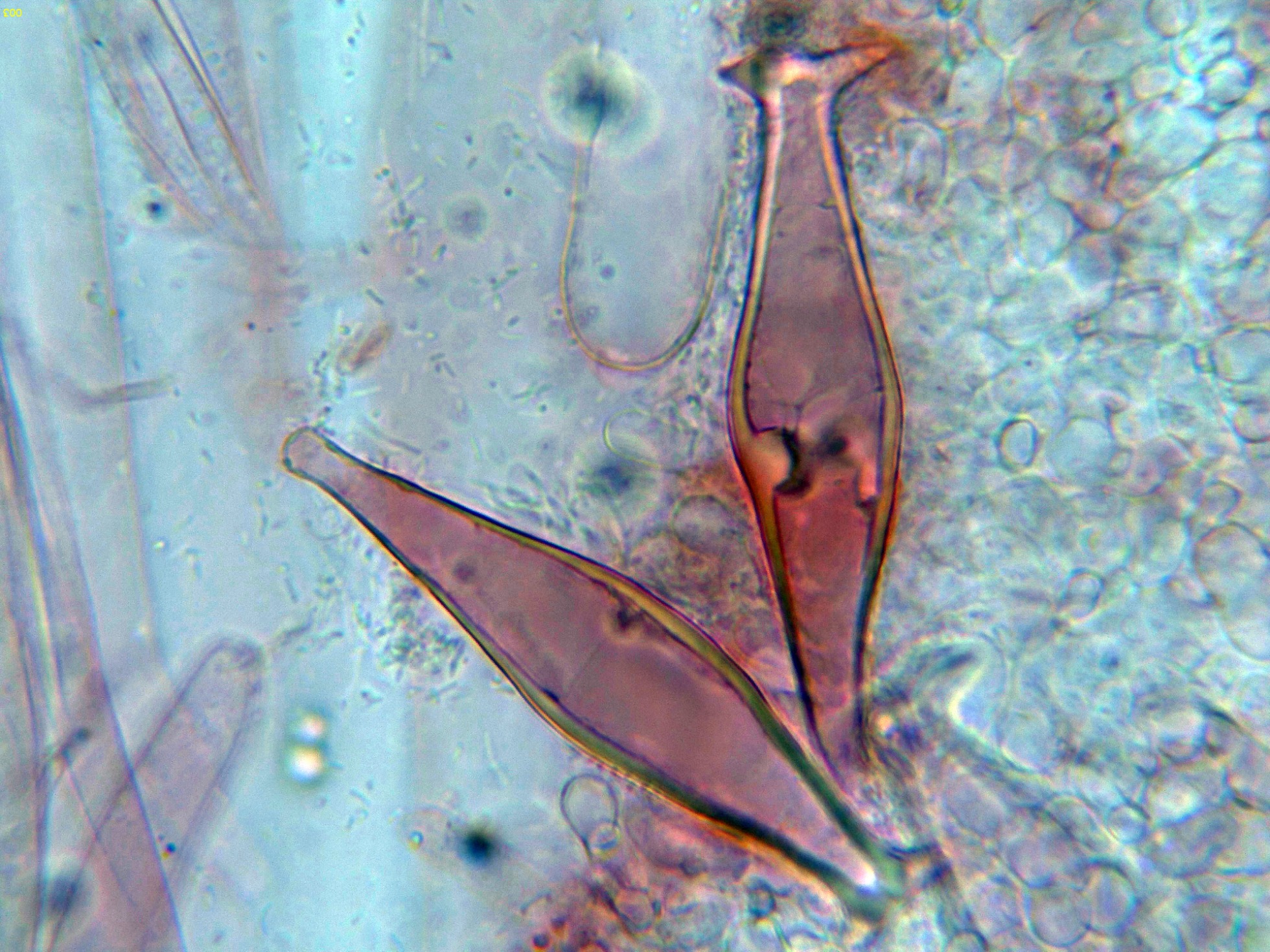 Un Pluteus, que a pesar de estar contaminado por bacterias, teniendo en cuenta su arista laminar que parece coloreada y sus queilocistidios con 3 cuernos, todo apunta al Pluteus tricuspidatus, actualmente Pluteus atromarginatus.