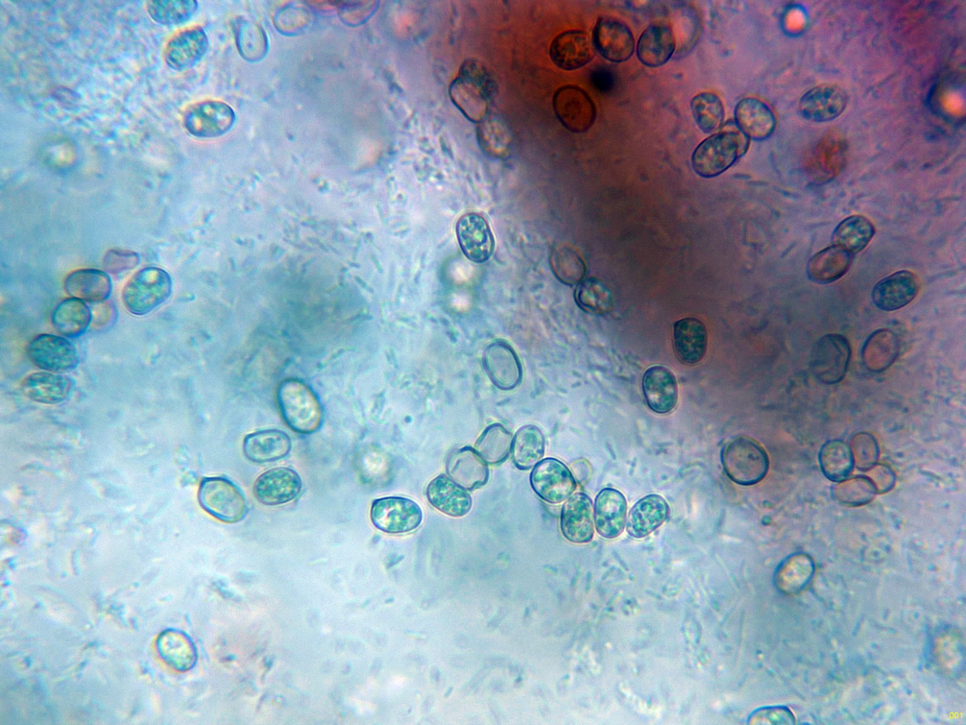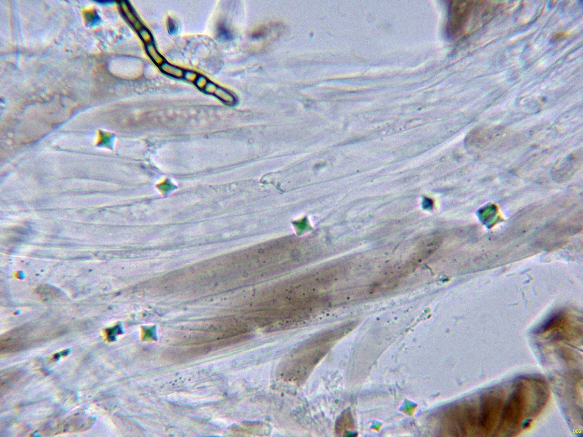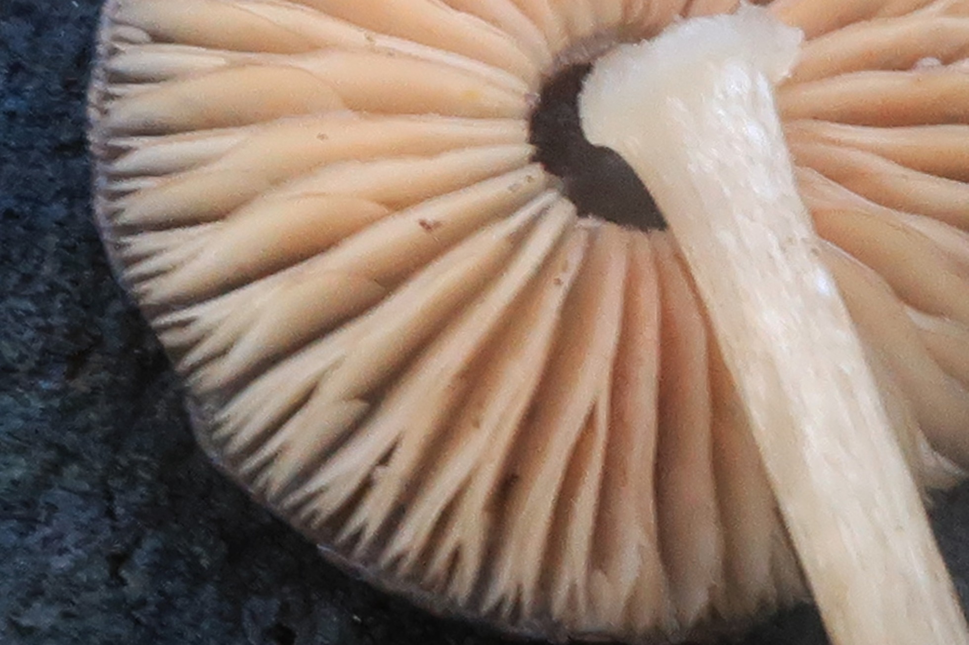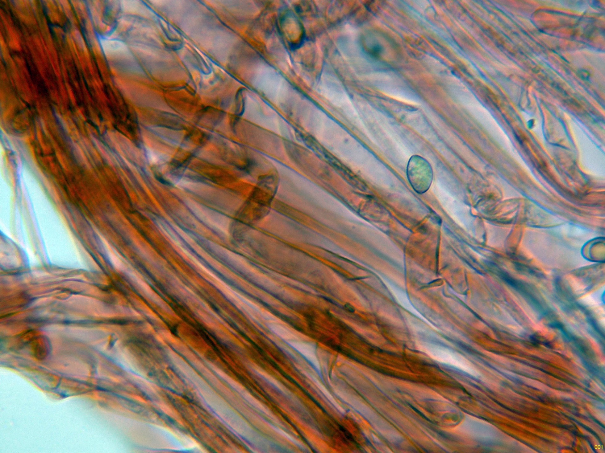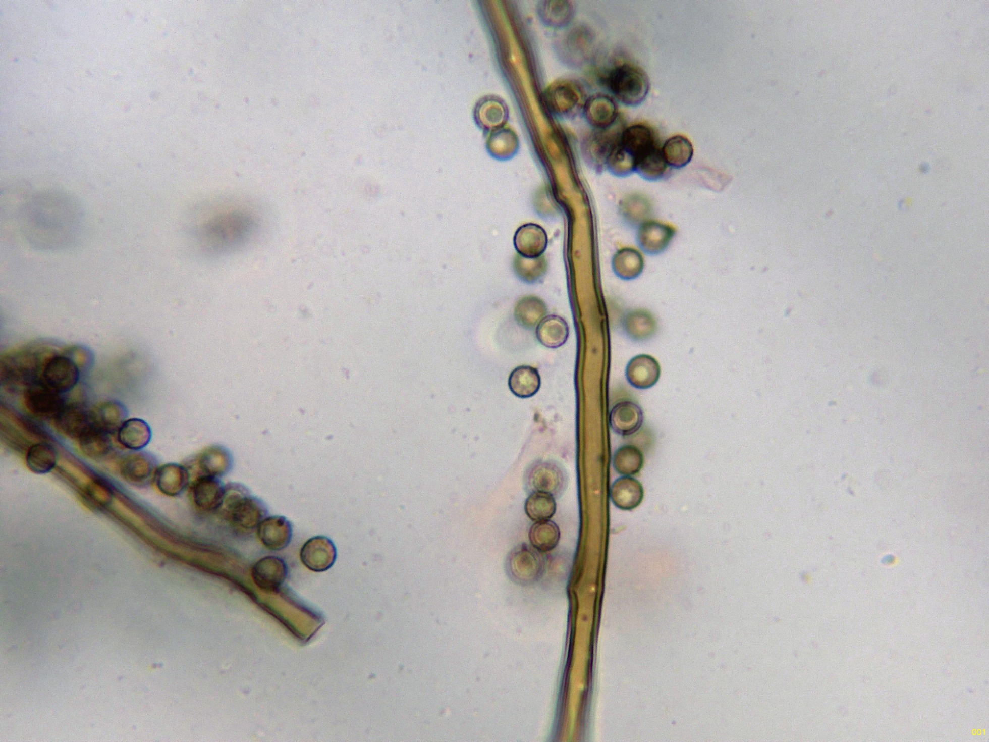 Un Pluteus, que a pesar de estar contaminado por bacterias, teniendo en cuenta su arista laminar que parece coloreada y sus queilocistidios con 3 cuernos, todo apunta al Pluteus tricuspidatus, actualmente Pluteus atromarginatus.