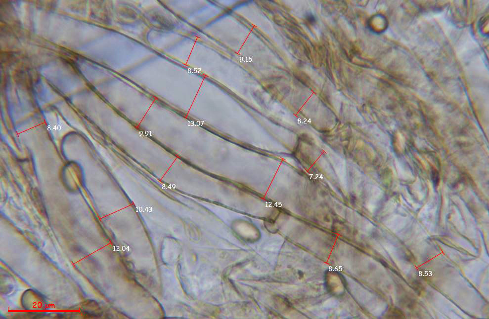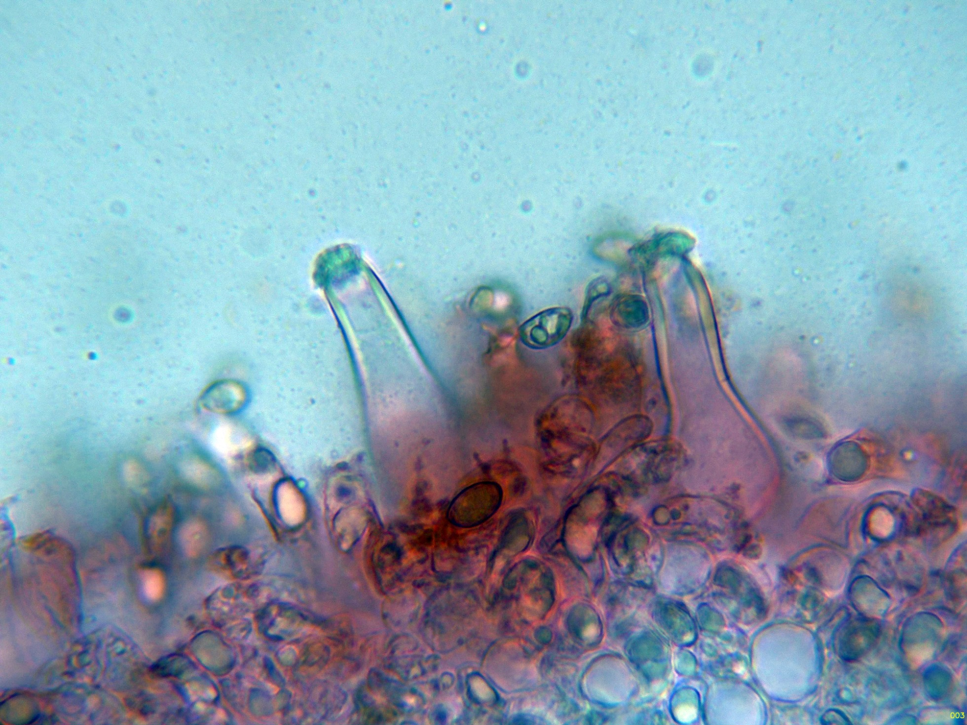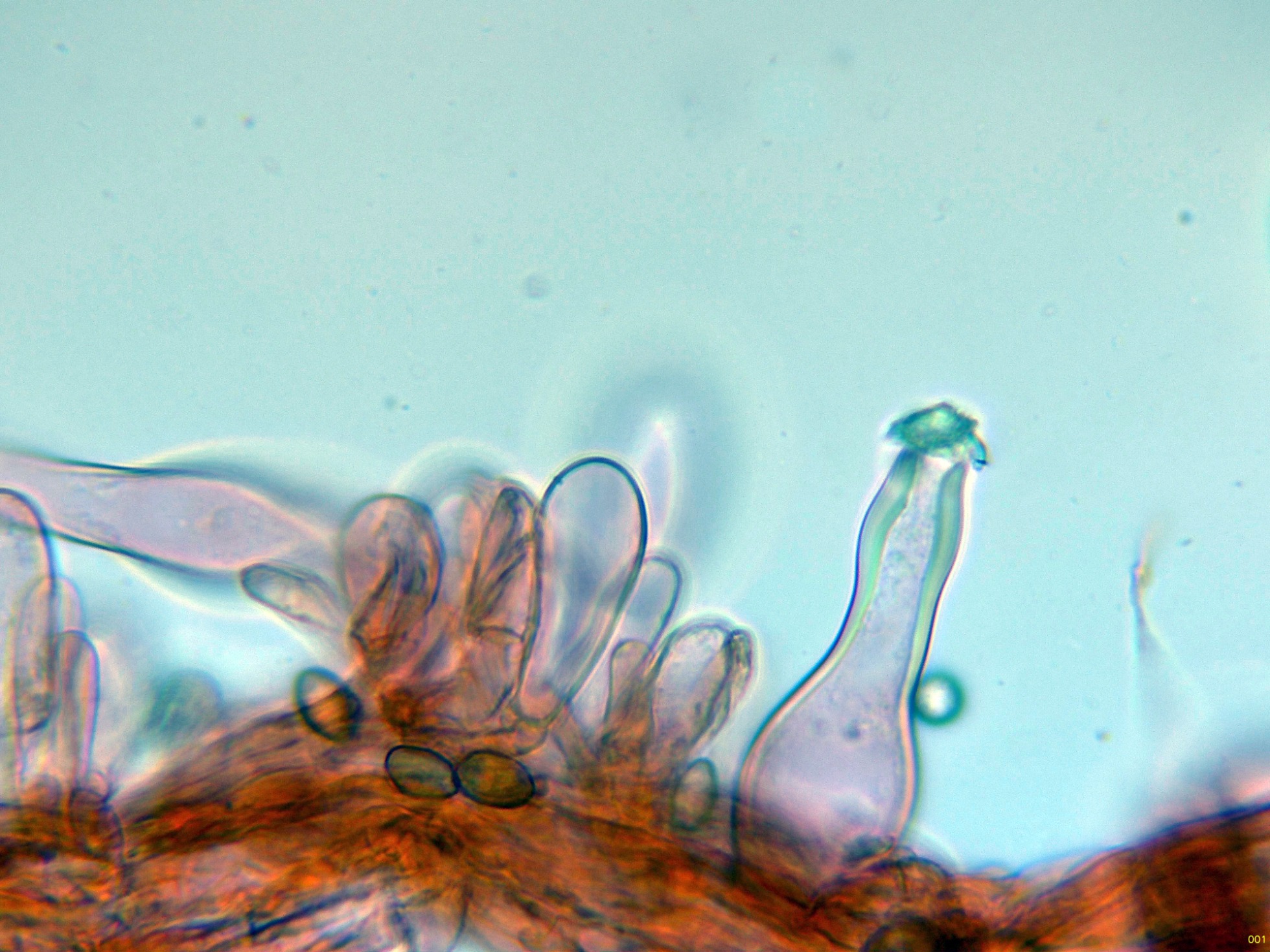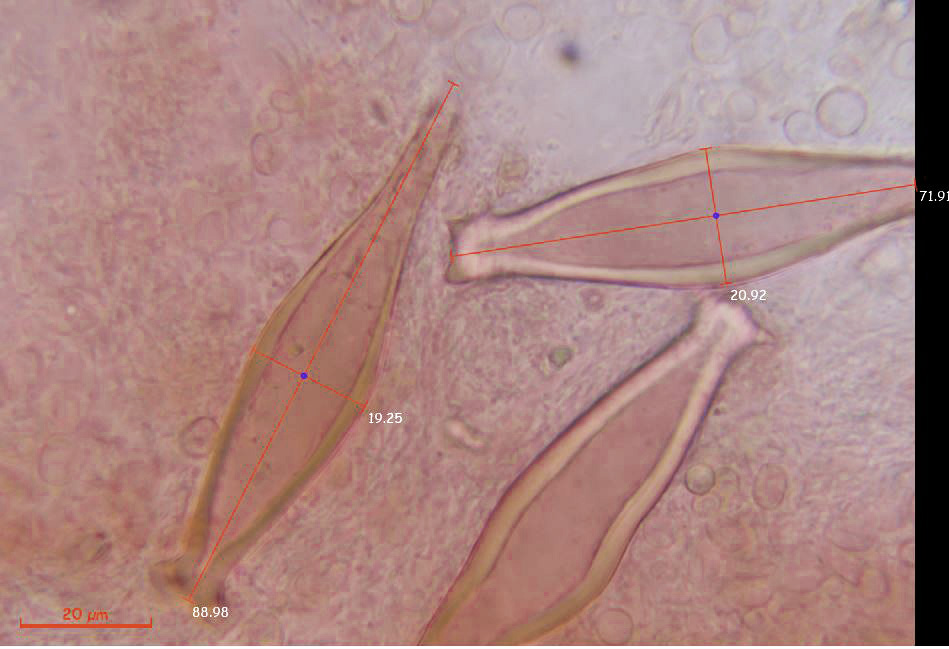 Queilocistidios con cristalizaciones, con unas medidas de (44.2) 49.5 - 54.5 (55) × (14) 14.8 - 18.7 (19.8) µm.