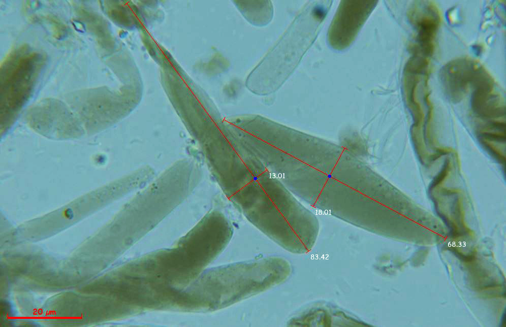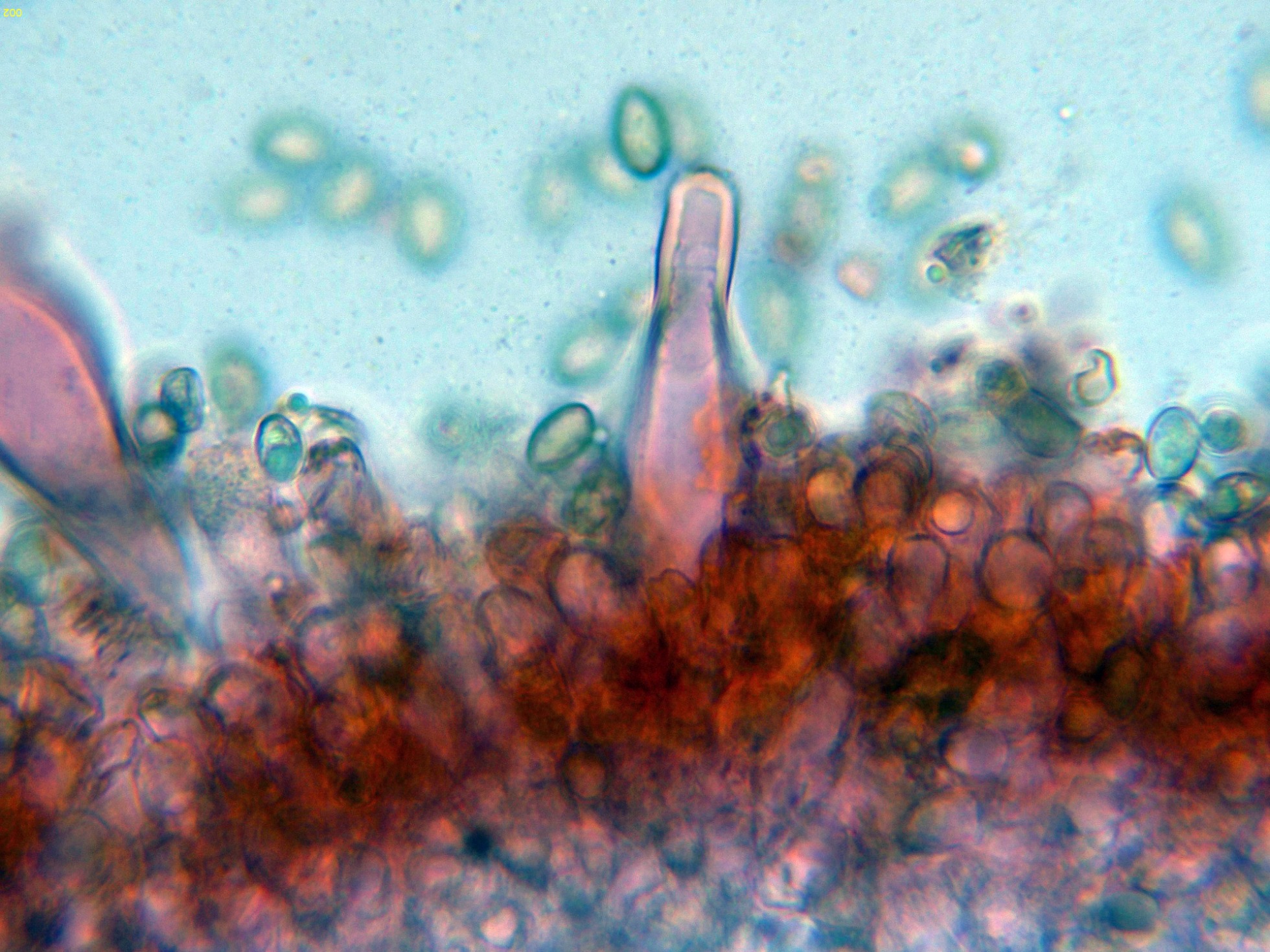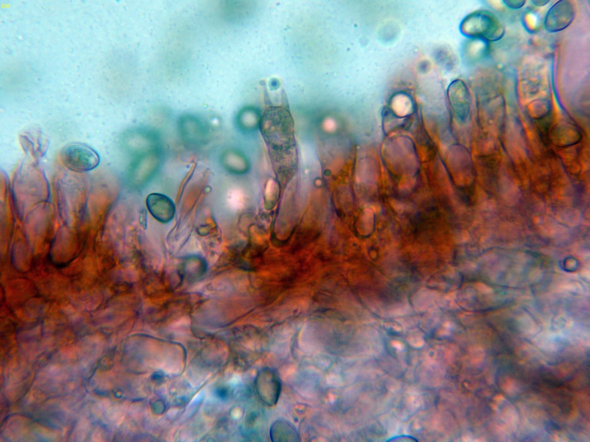 Queilocistidios con cristalizaciones, con unas medidas de (44.2) 49.5 - 54.5 (55) × (14) 14.8 - 18.7 (19.8) µm.