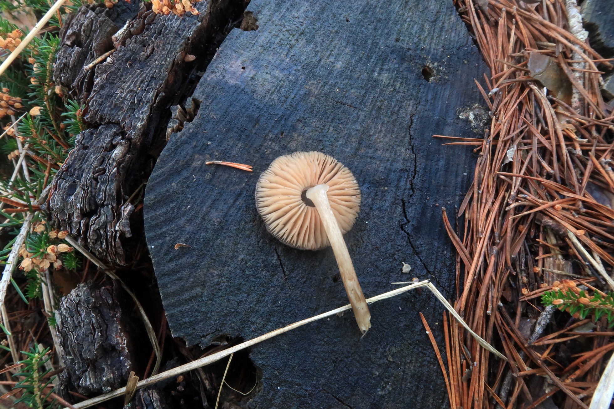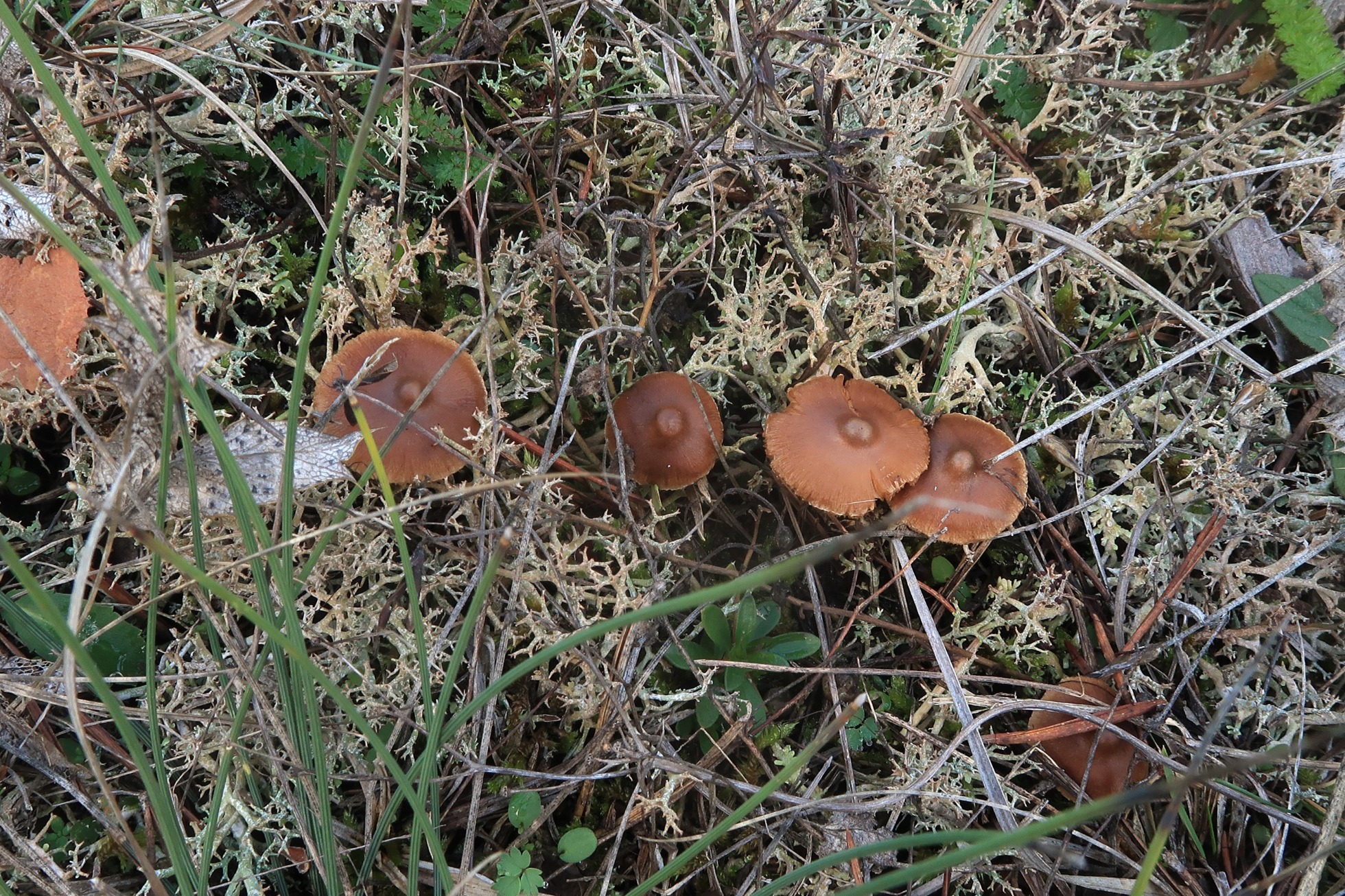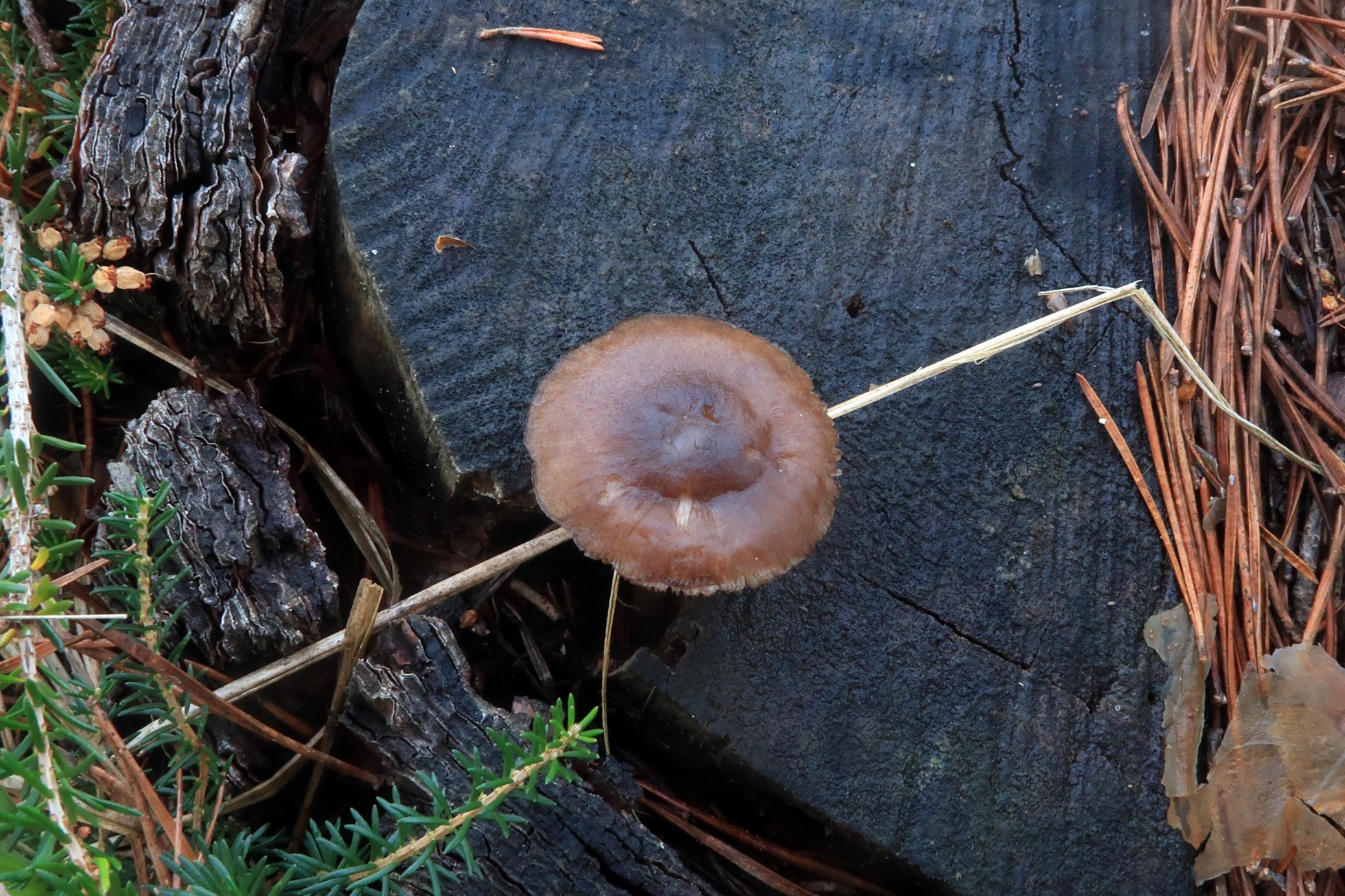 Un Inocybe propio de pinares, con caulocistidios solo en la parte alta del pie, con sombrero mamelonado, la Inocybe fuscidula.