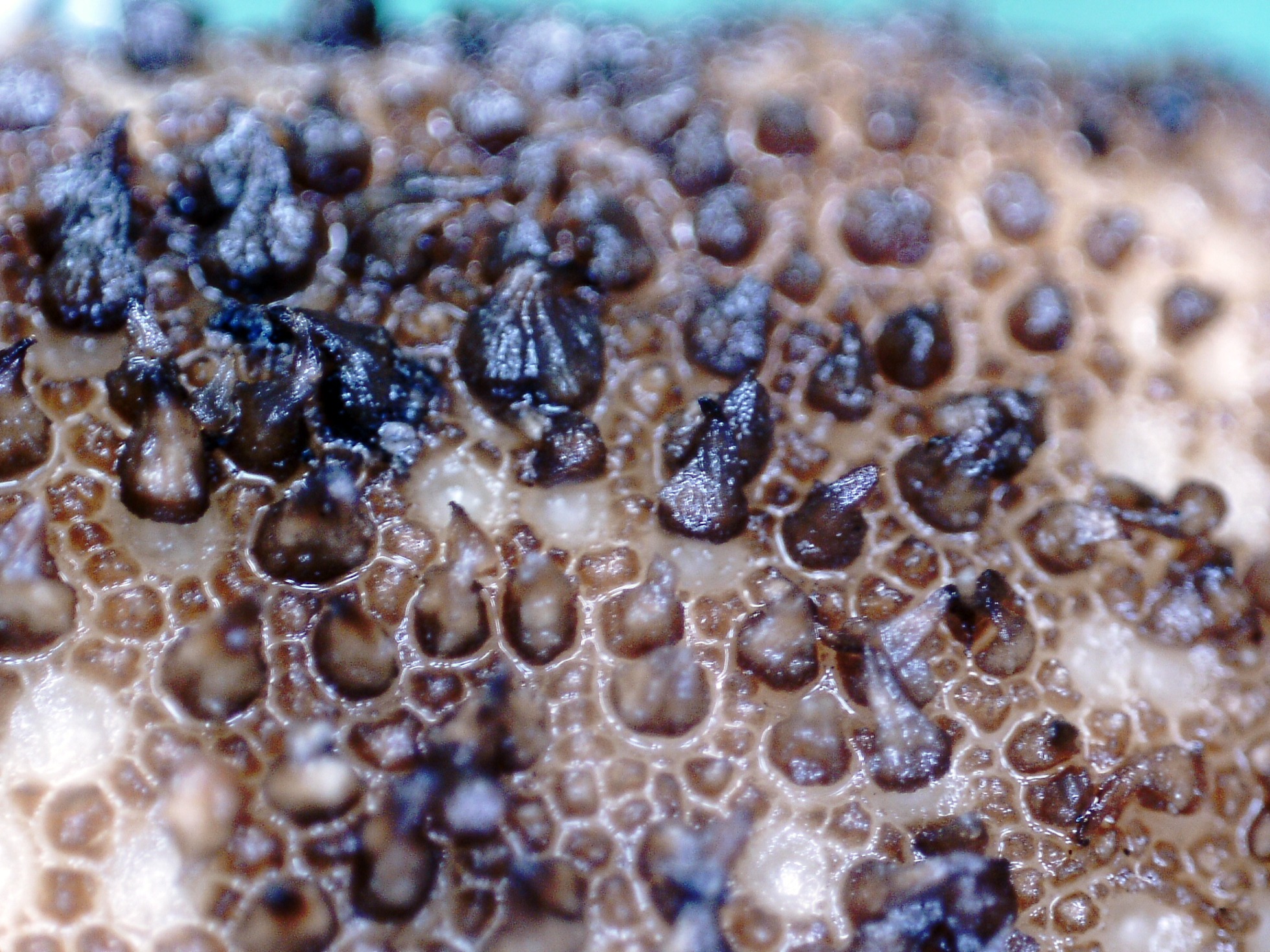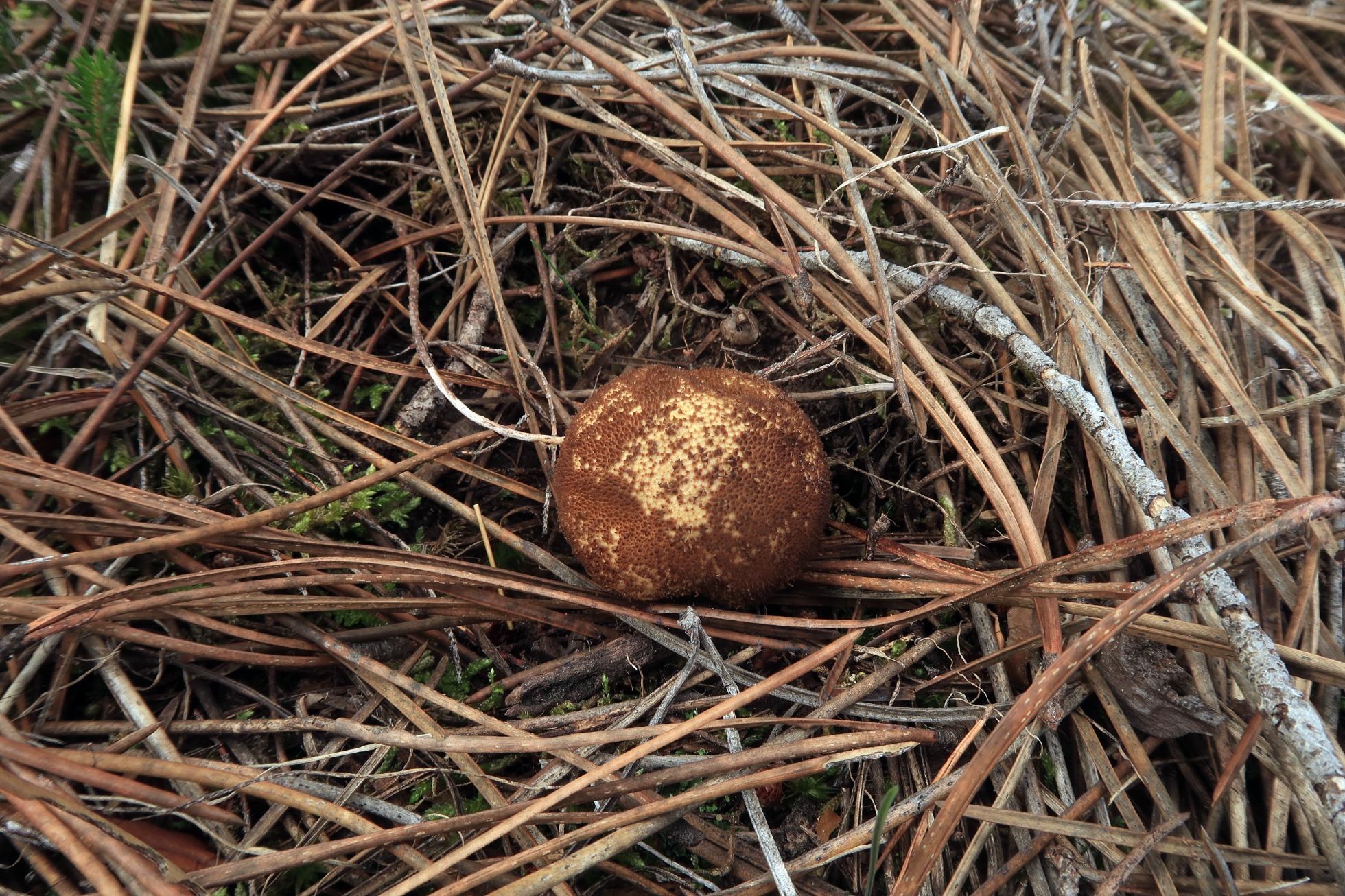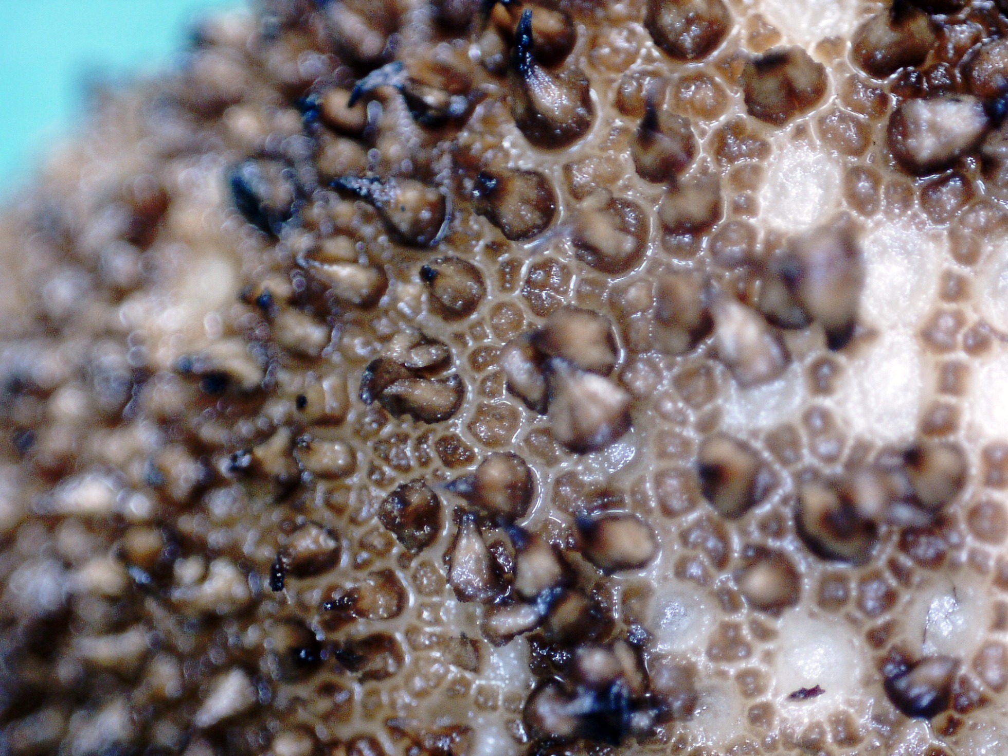 Un Lycoperdon, con aguijones agrupados en forma de pirámide que al desprenderse dejan entrever una retícula, el Lycoperdon foetidum, actualmente Lycoperdon nigrescens.