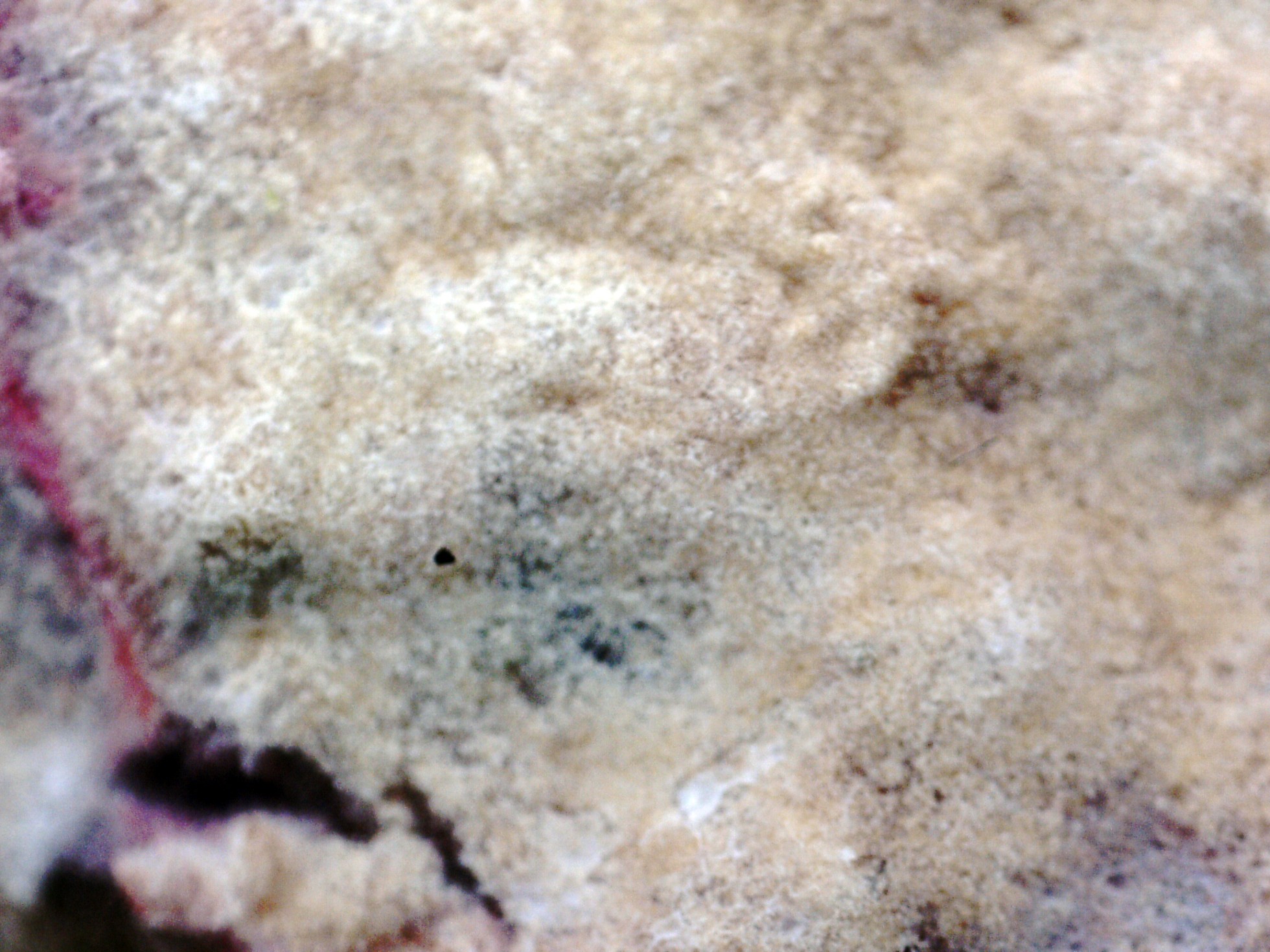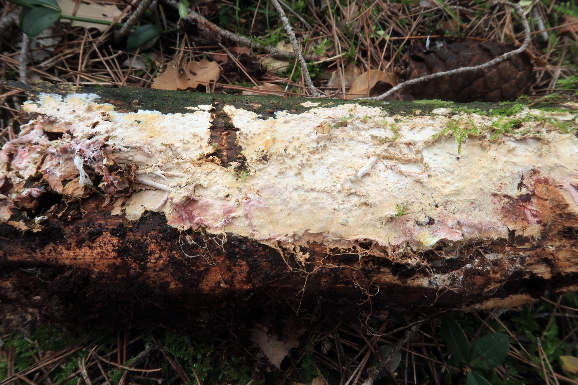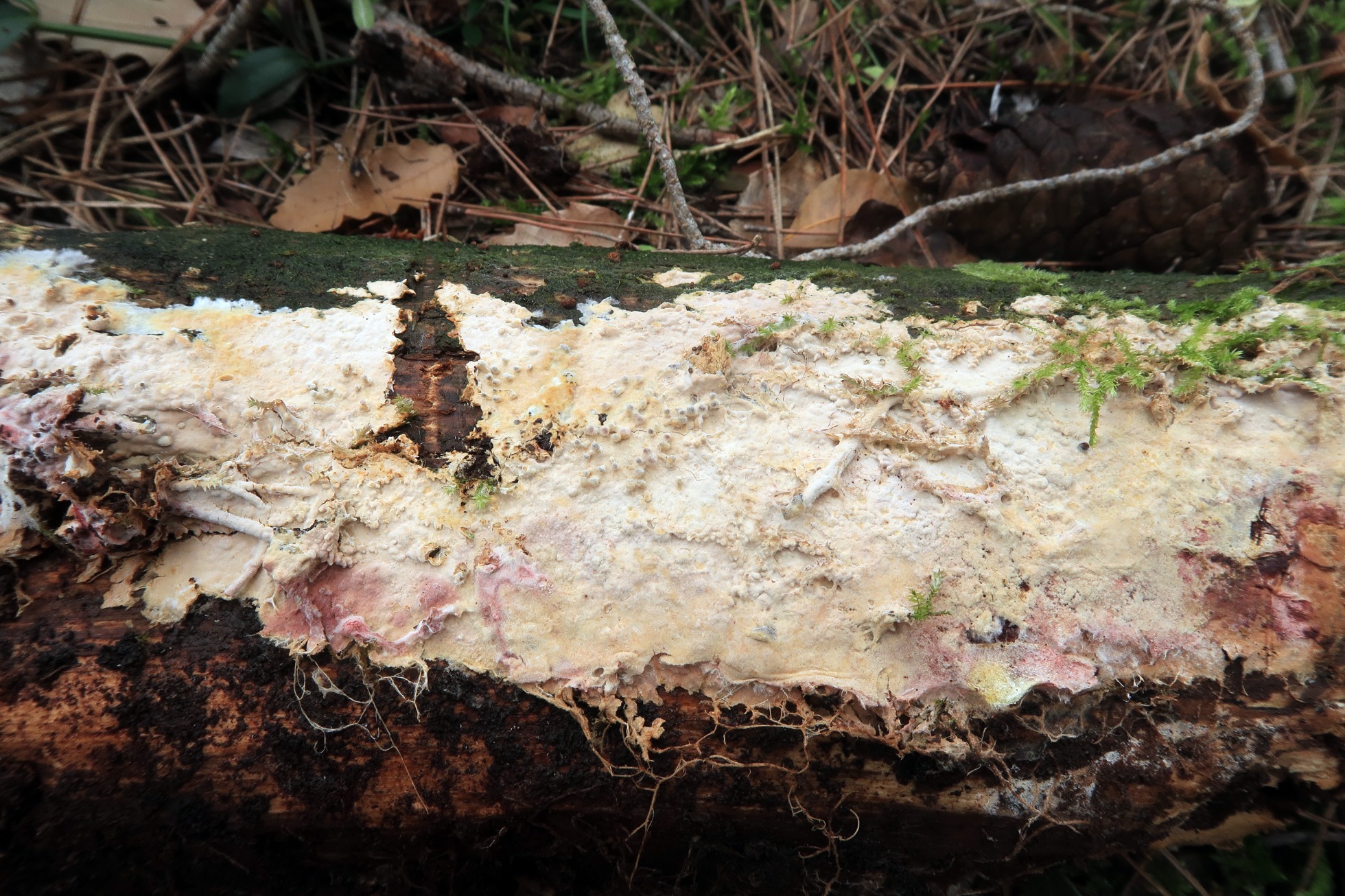 Un Asterostroma del pasado 24 de noviembre, brotando de forma completamente resupinada sobre un tronco tumbado de pino, por la parte que está en contacto con el suelo.