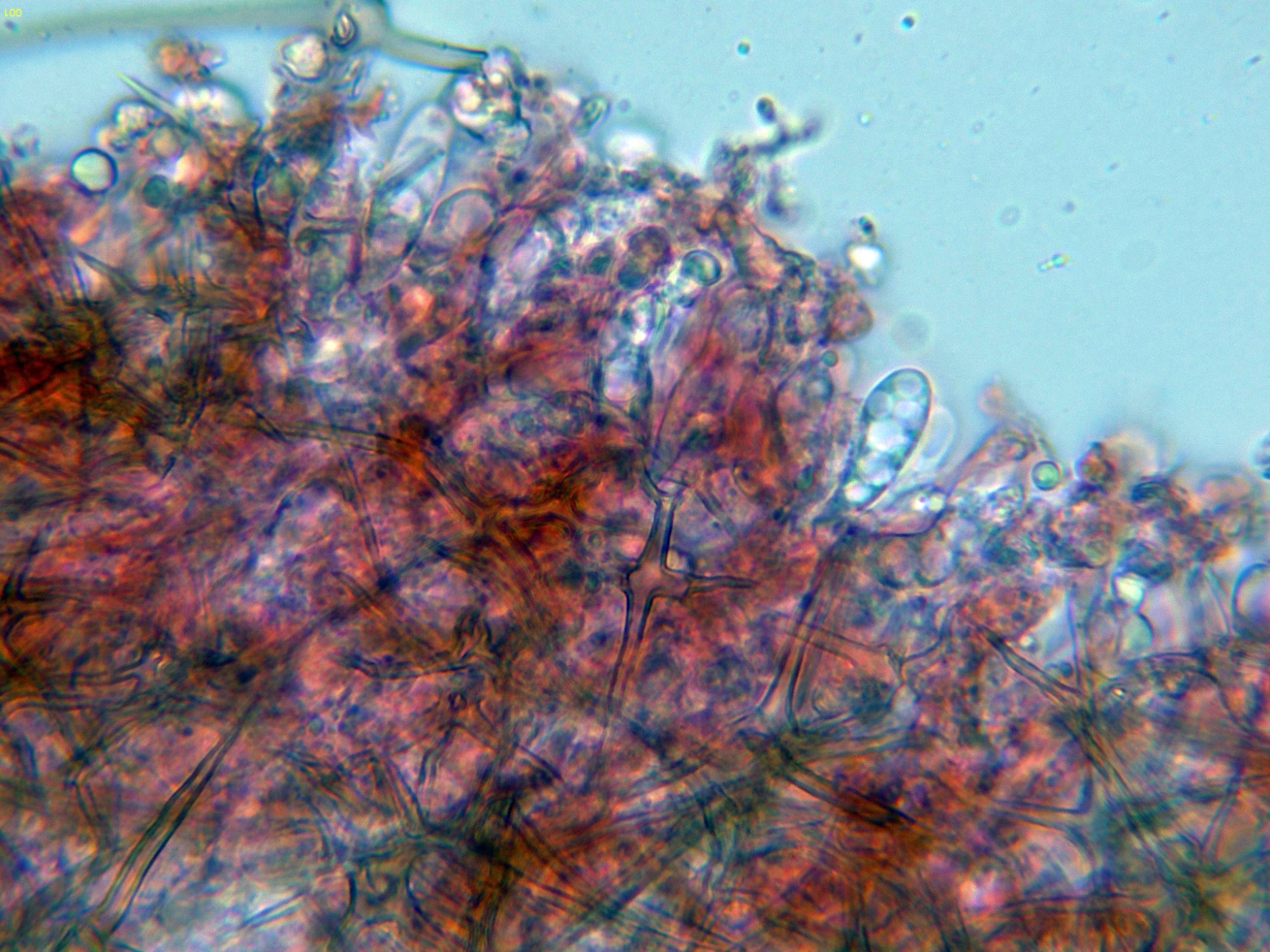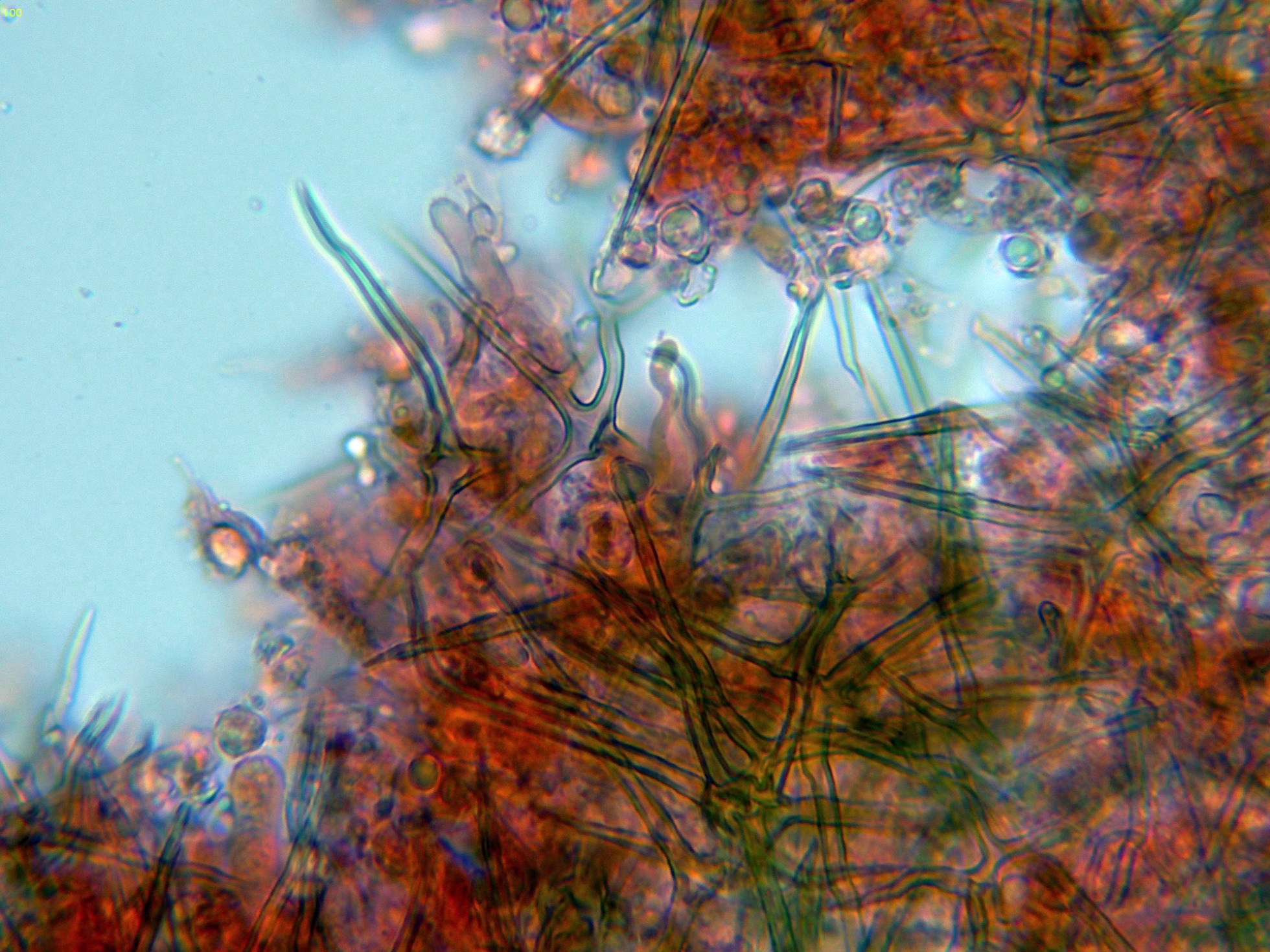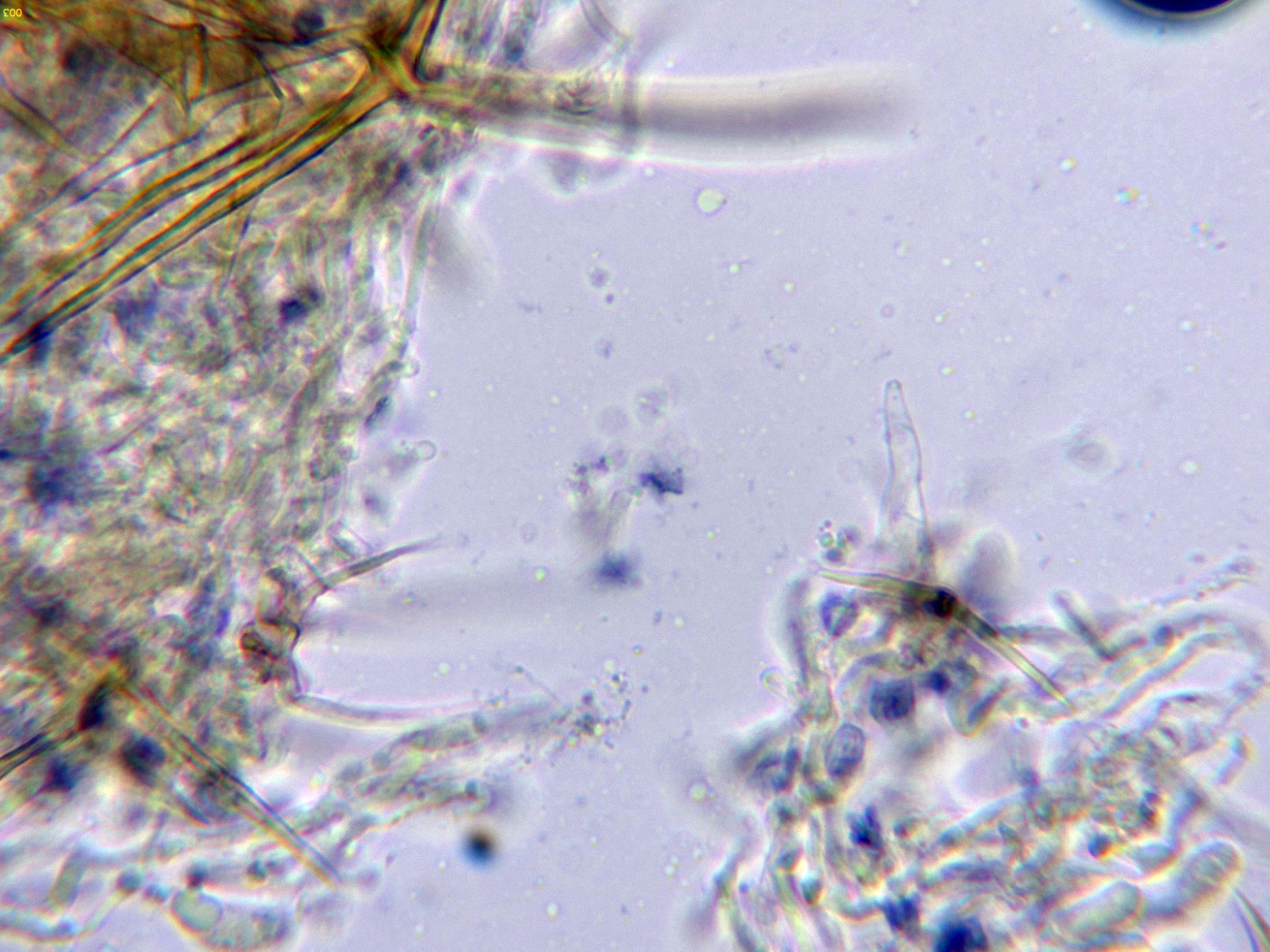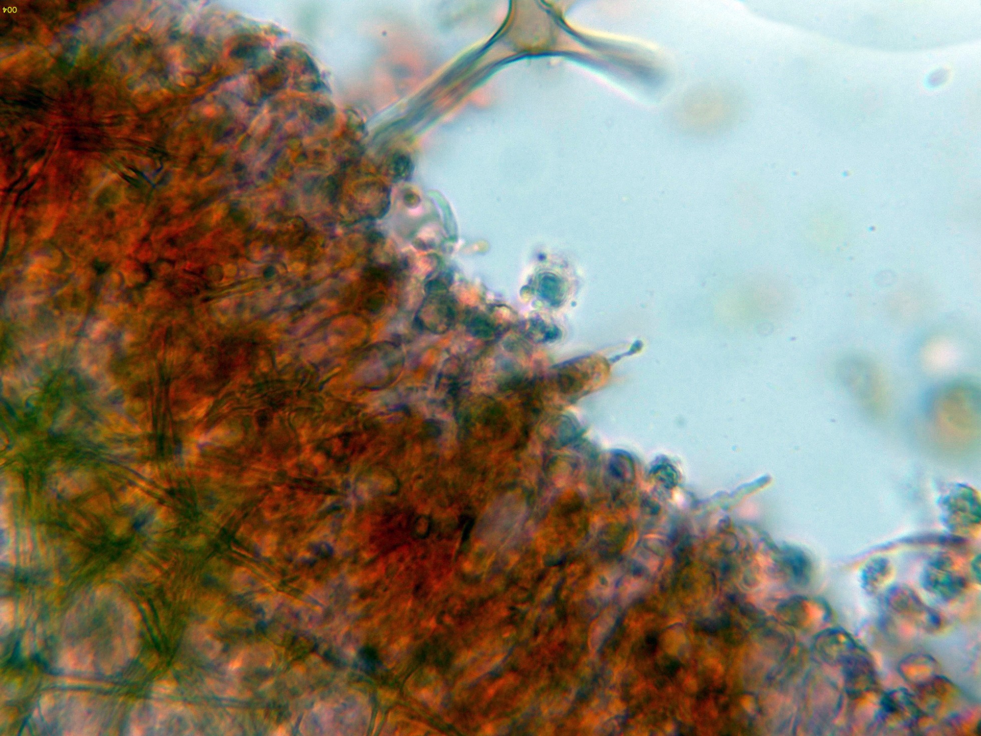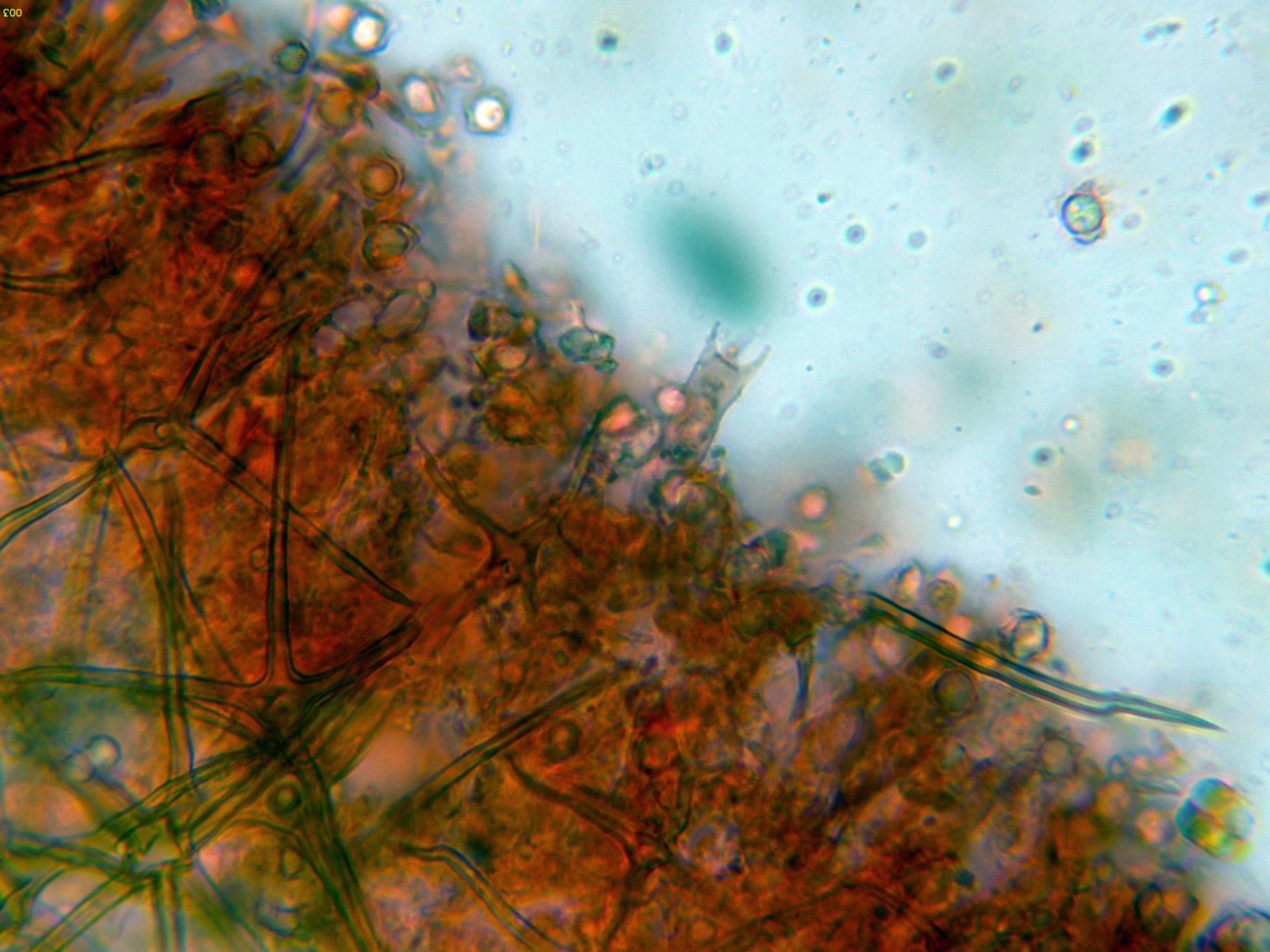 Pocas estructuras en el himenio distintas de los basidios, dejo una imágen de un posible cistidio en reactivo de Melzer: