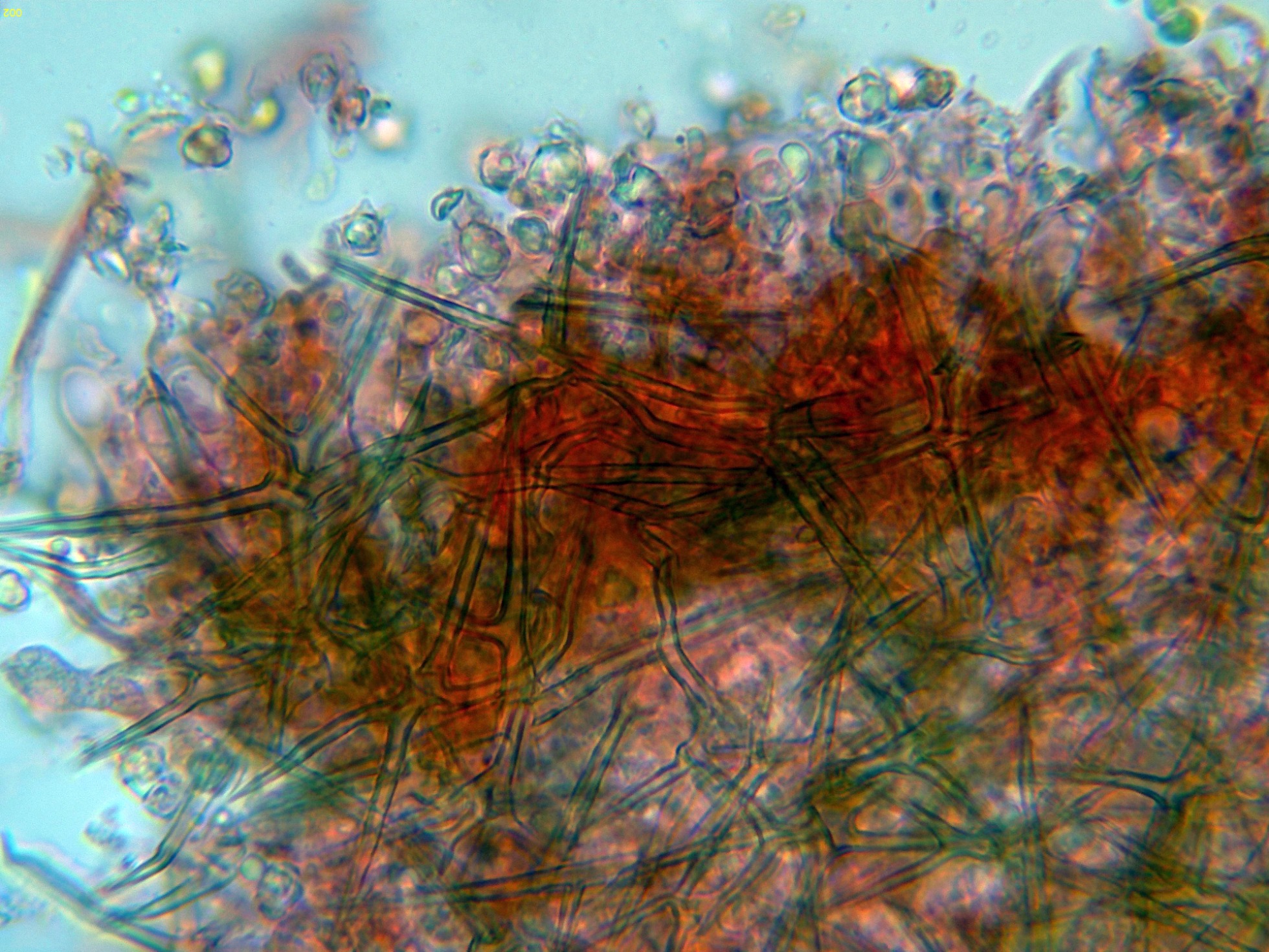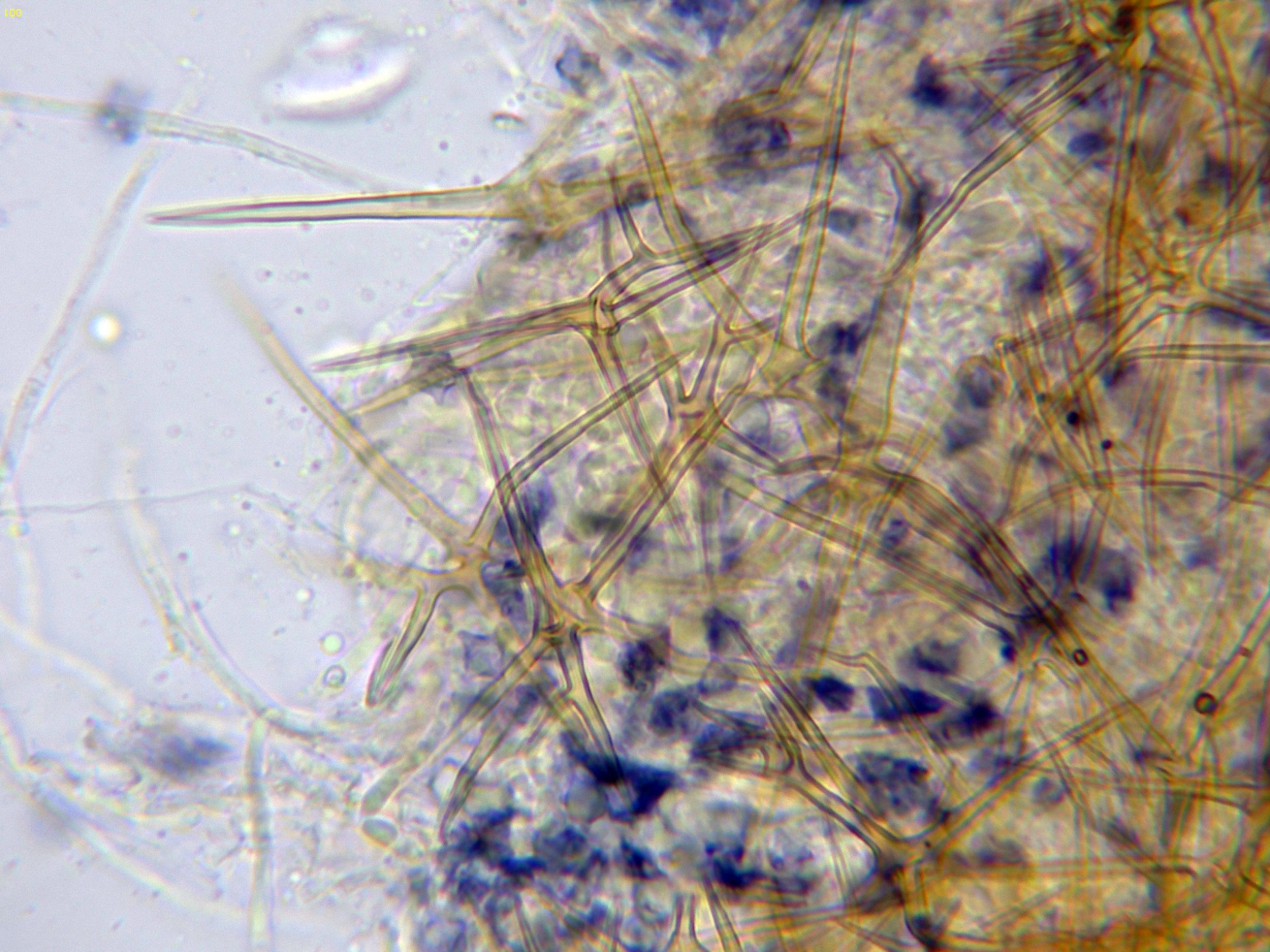 El himenio en reactivo de Melzer, con unas manchas de color azul que se corresponden con esporas: