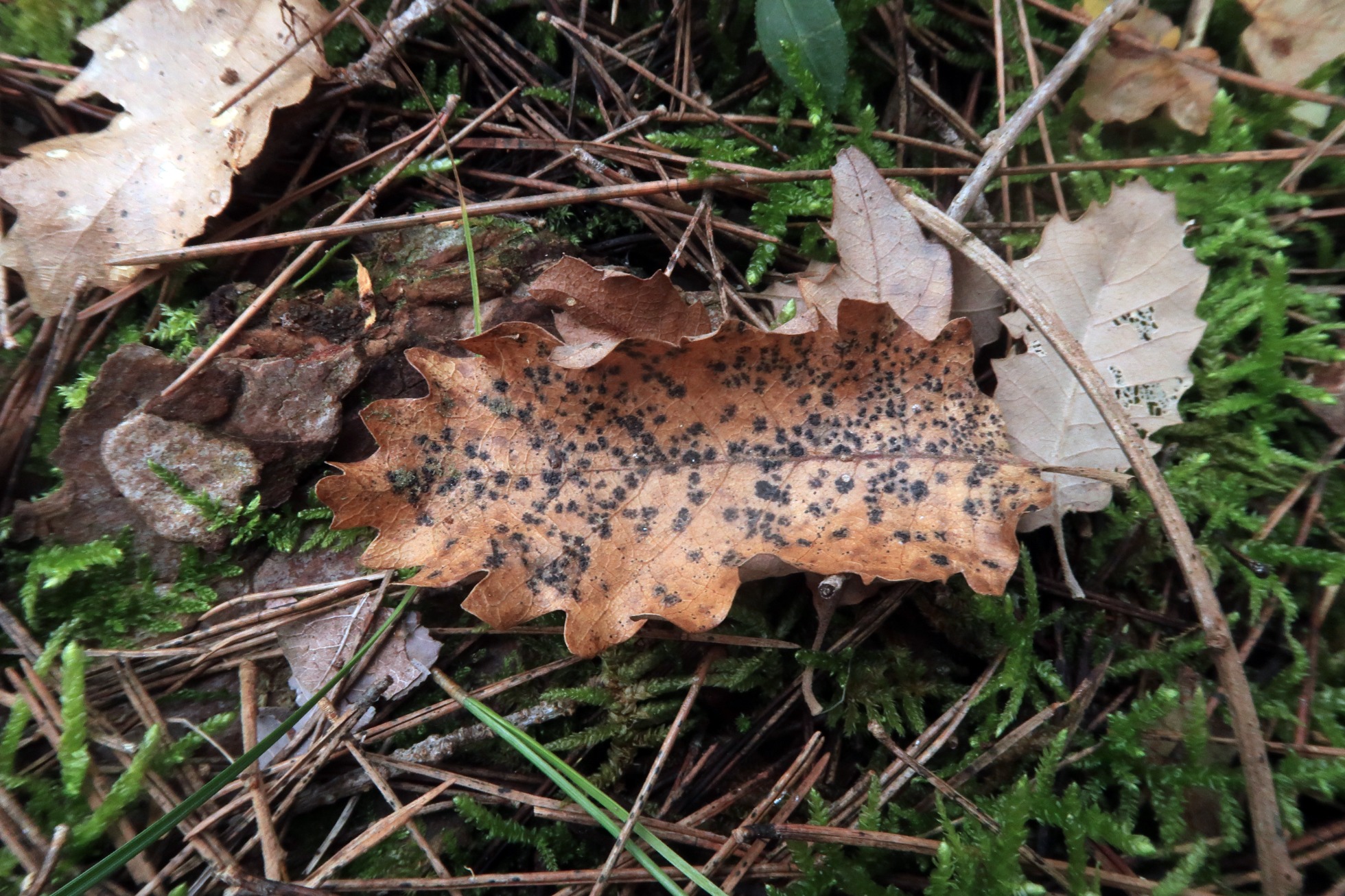 La hoja de roble con las cicatrices del pirenomiceto negro: