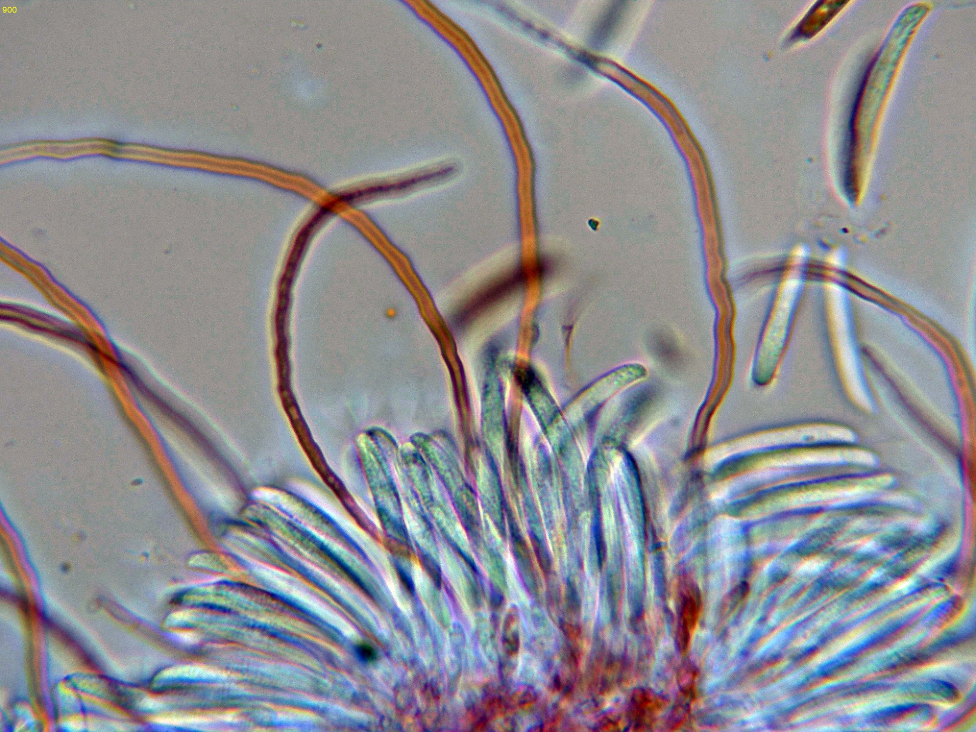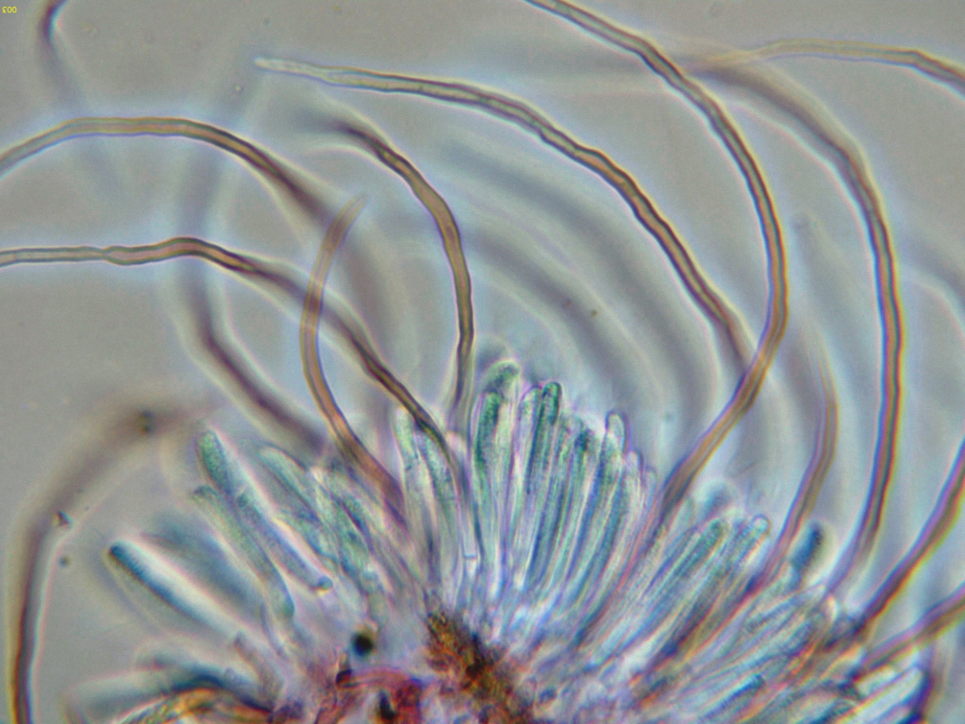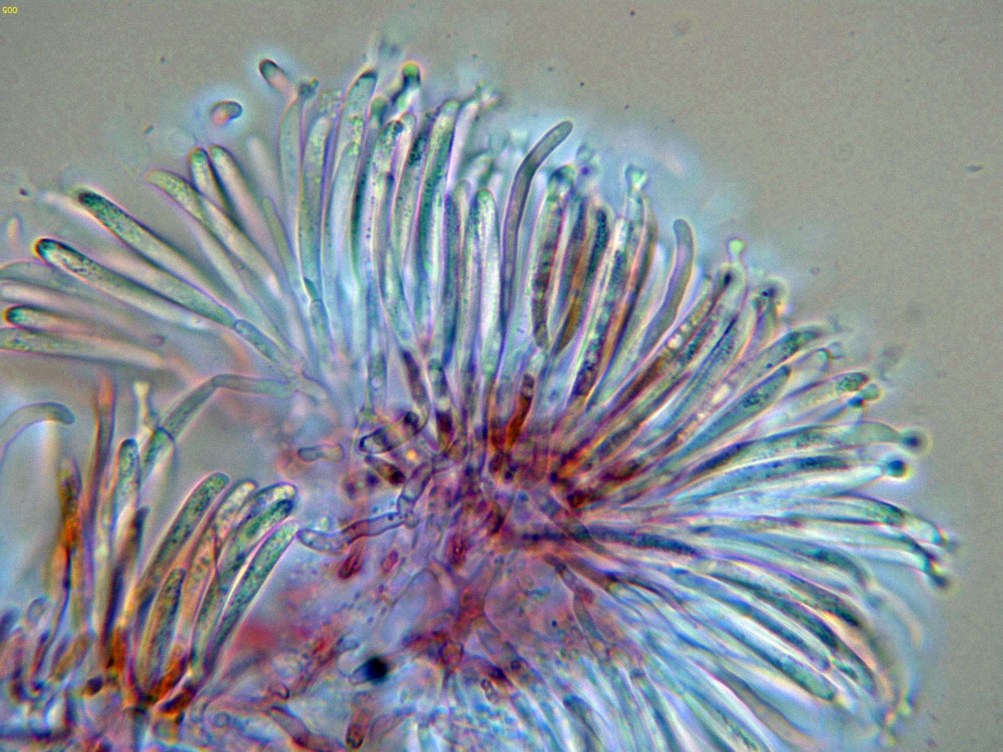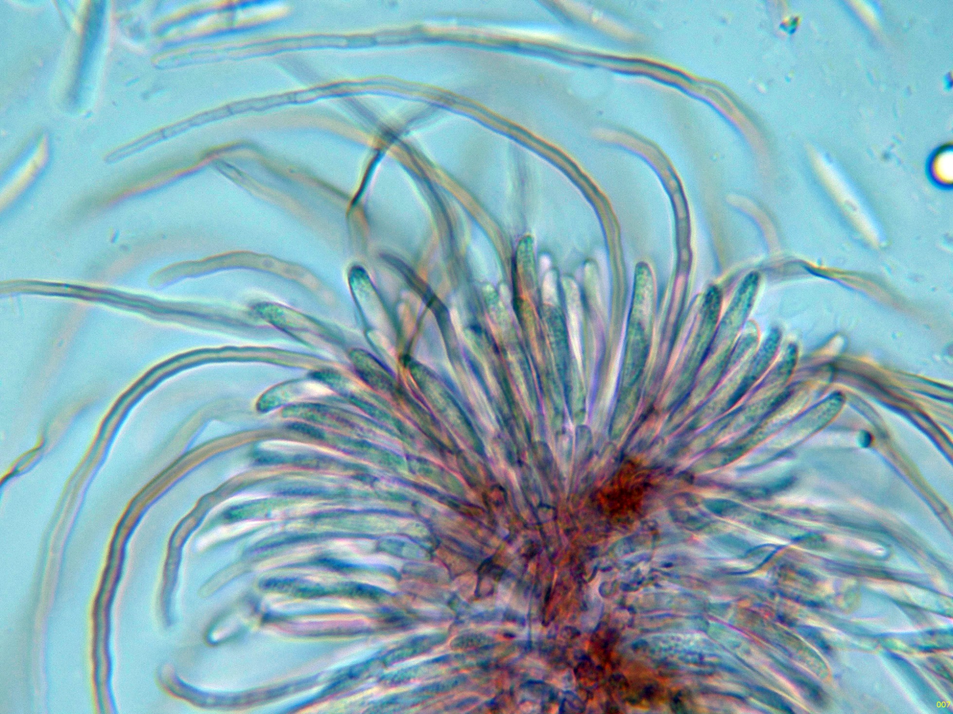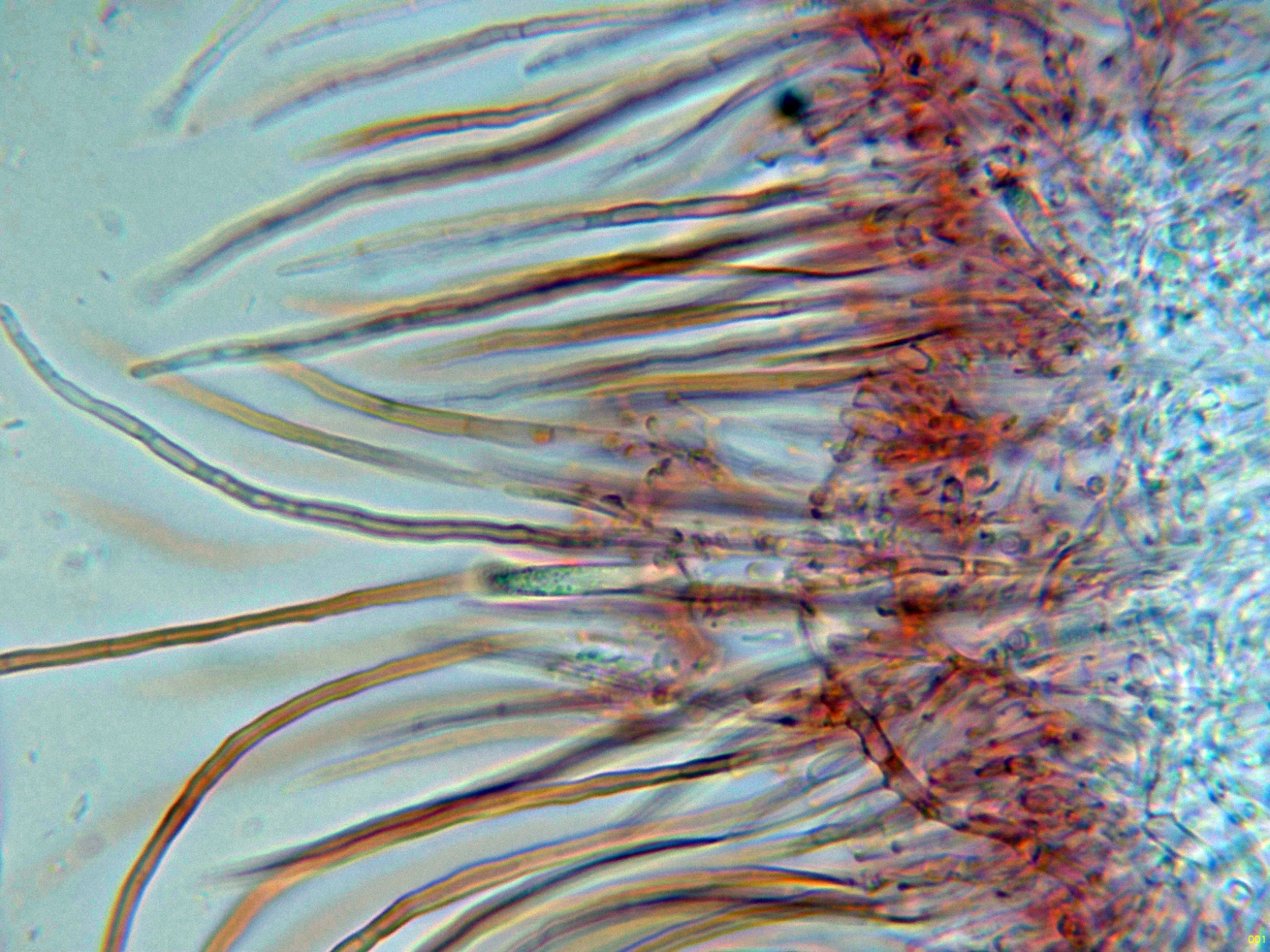 Con el desarrollo aparecen unos pelos que sobresalen muy por encima del nivel del himenio, estos pelos muy abundantes cuando ya se termina la conidiogénesis.