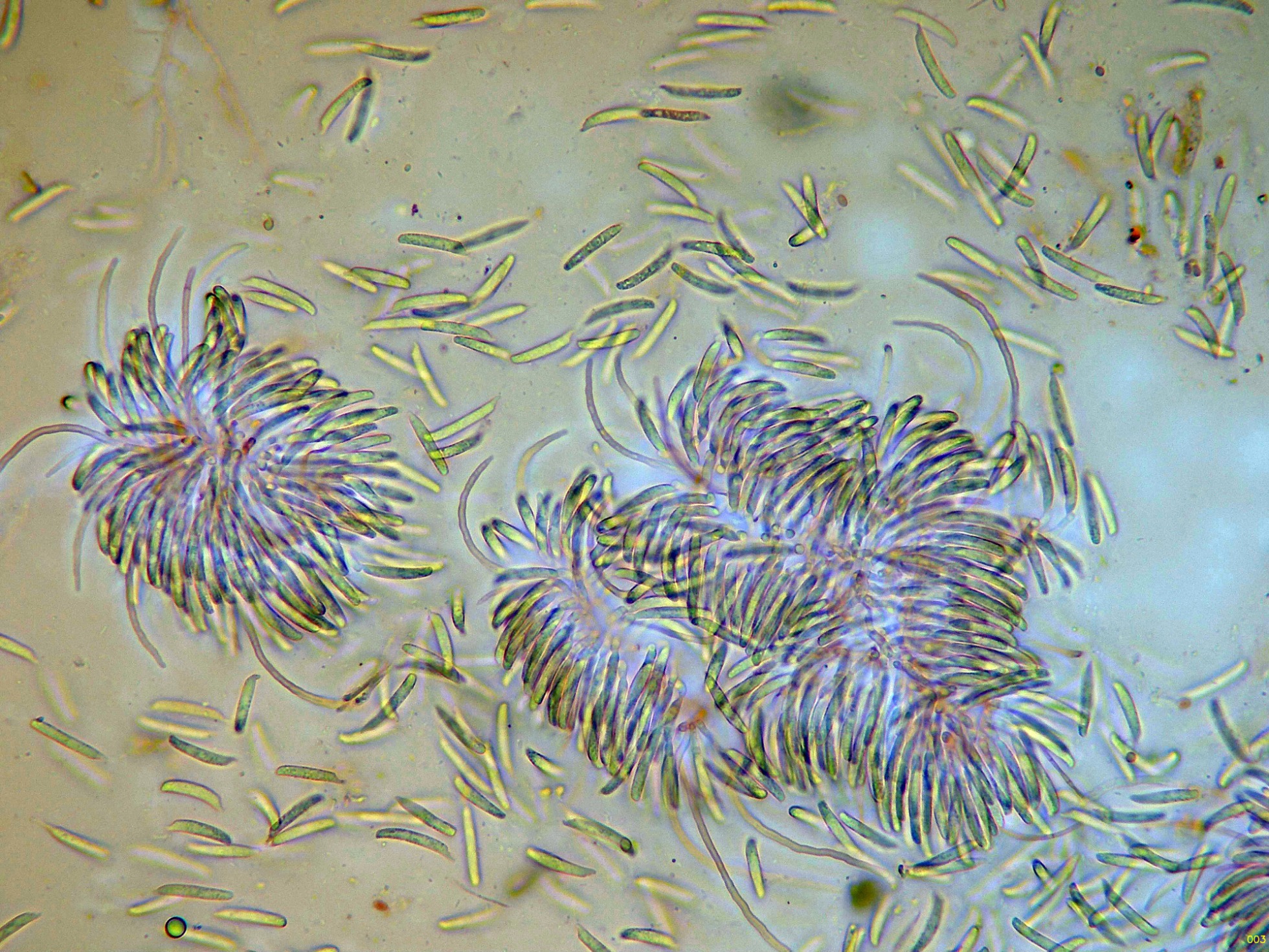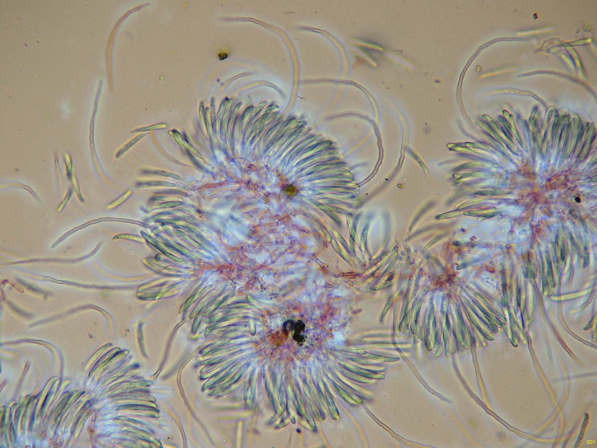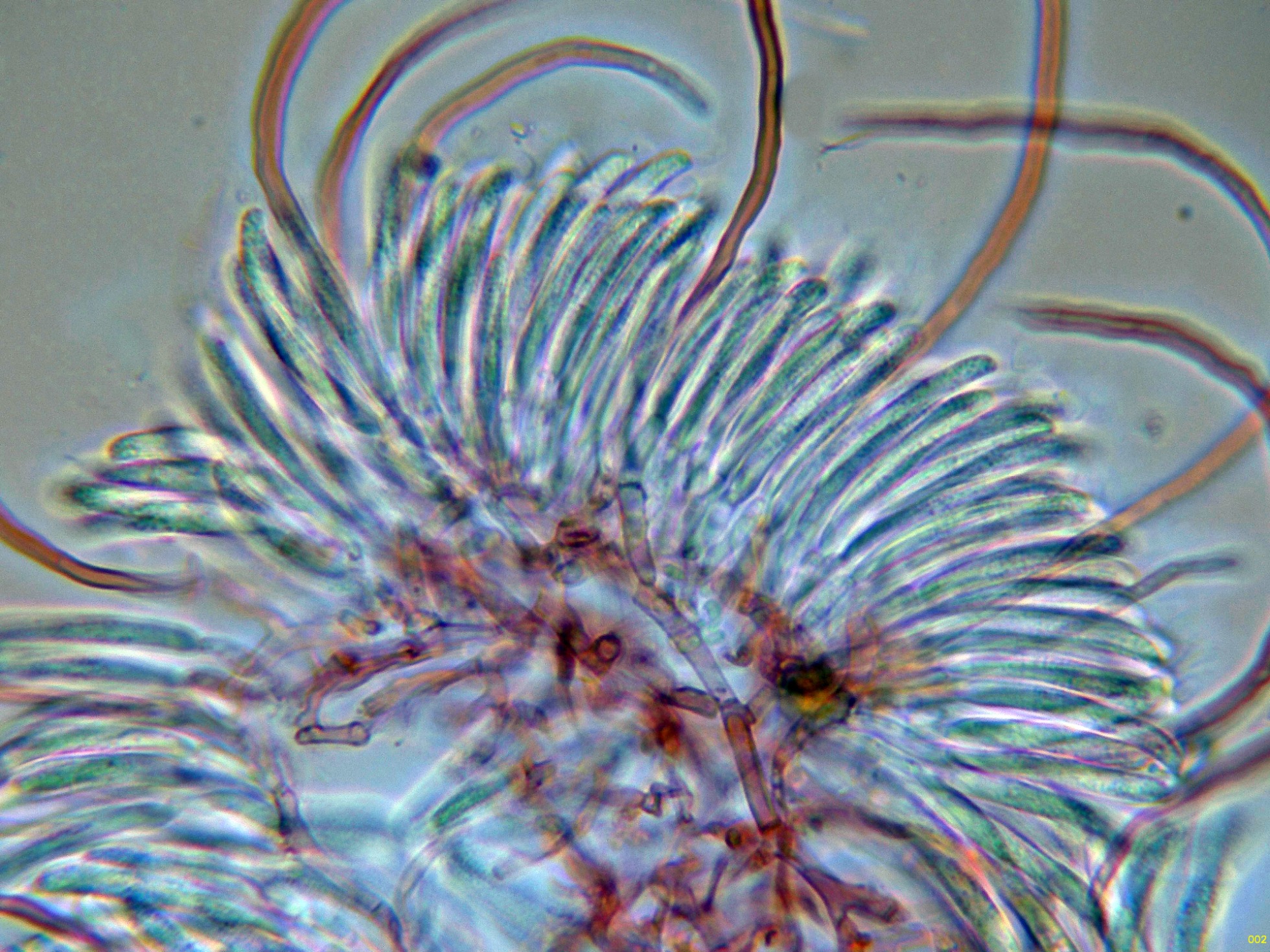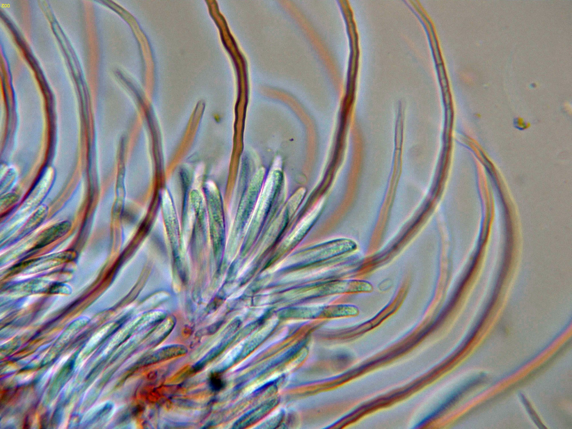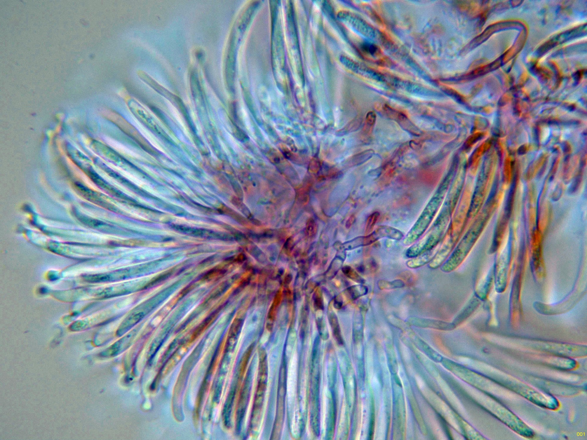 Con el desarrollo aparecen unos pelos que sobresalen muy por encima del nivel del himenio, estos pelos muy abundantes cuando ya se termina la conidiogénesis.