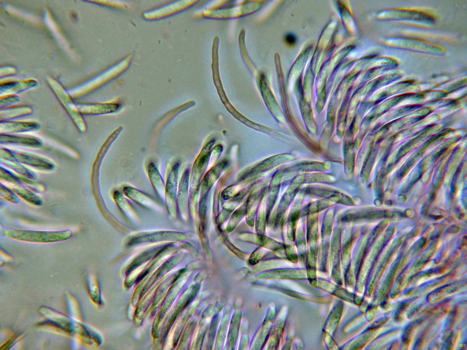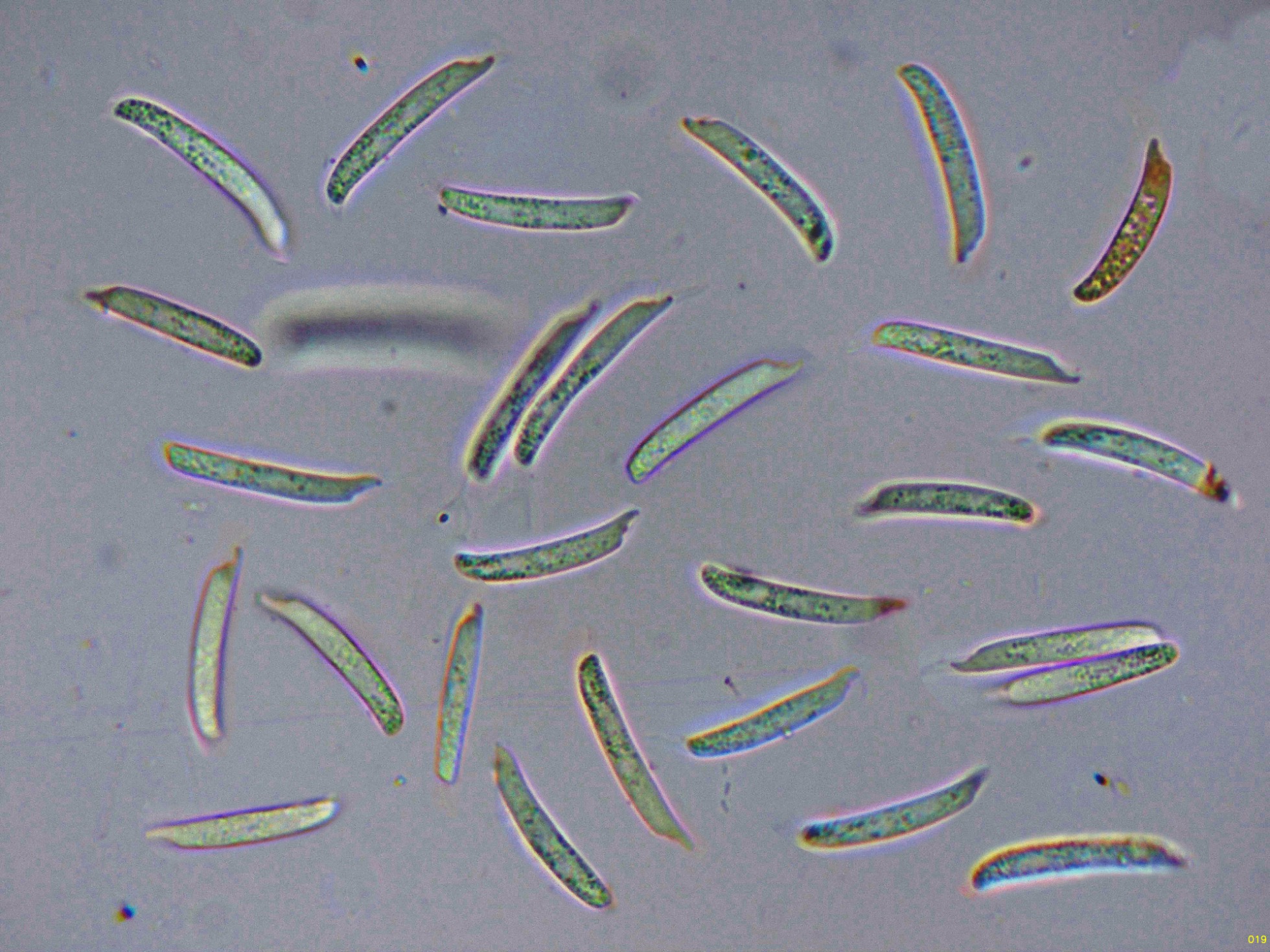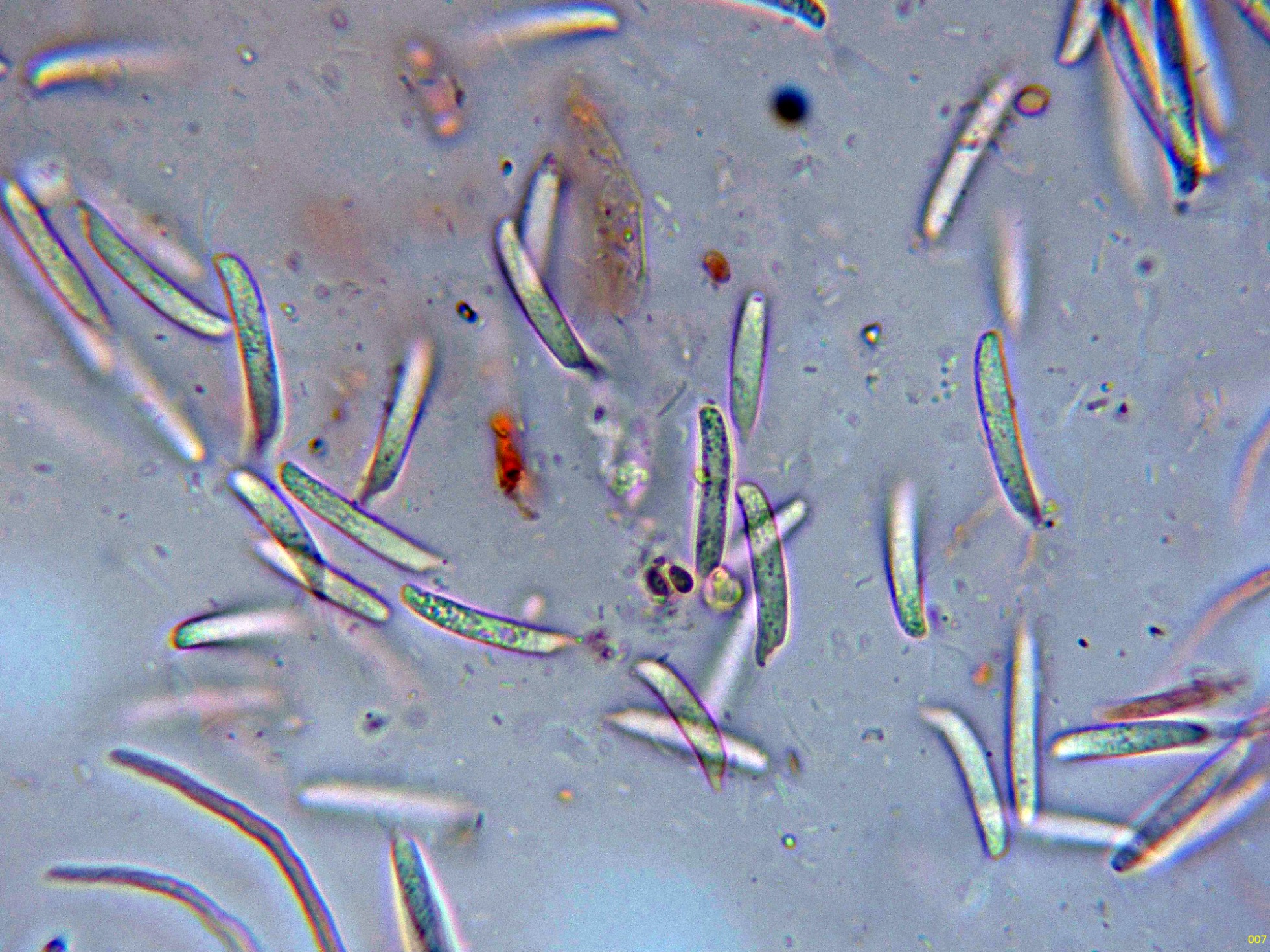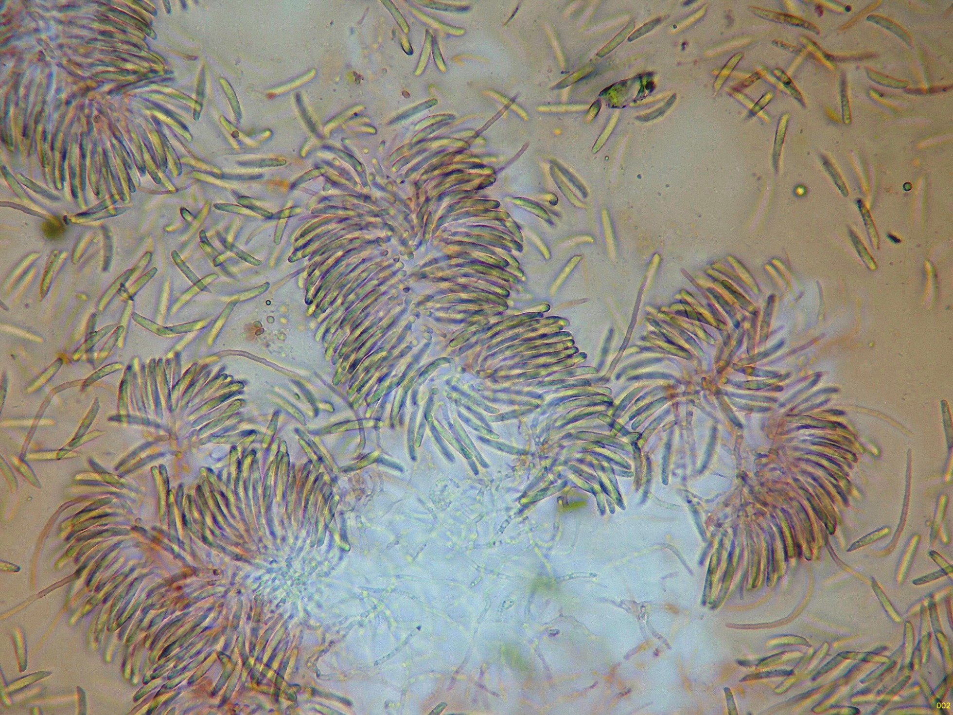 En sus primeras etapas a destacar sus hifas conidógenas muy cortas que producen unos conidios muy ligeramente alantoides con un extremo apuntado con forma de pico: