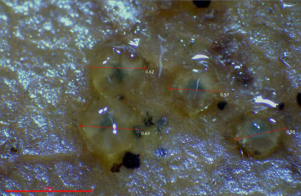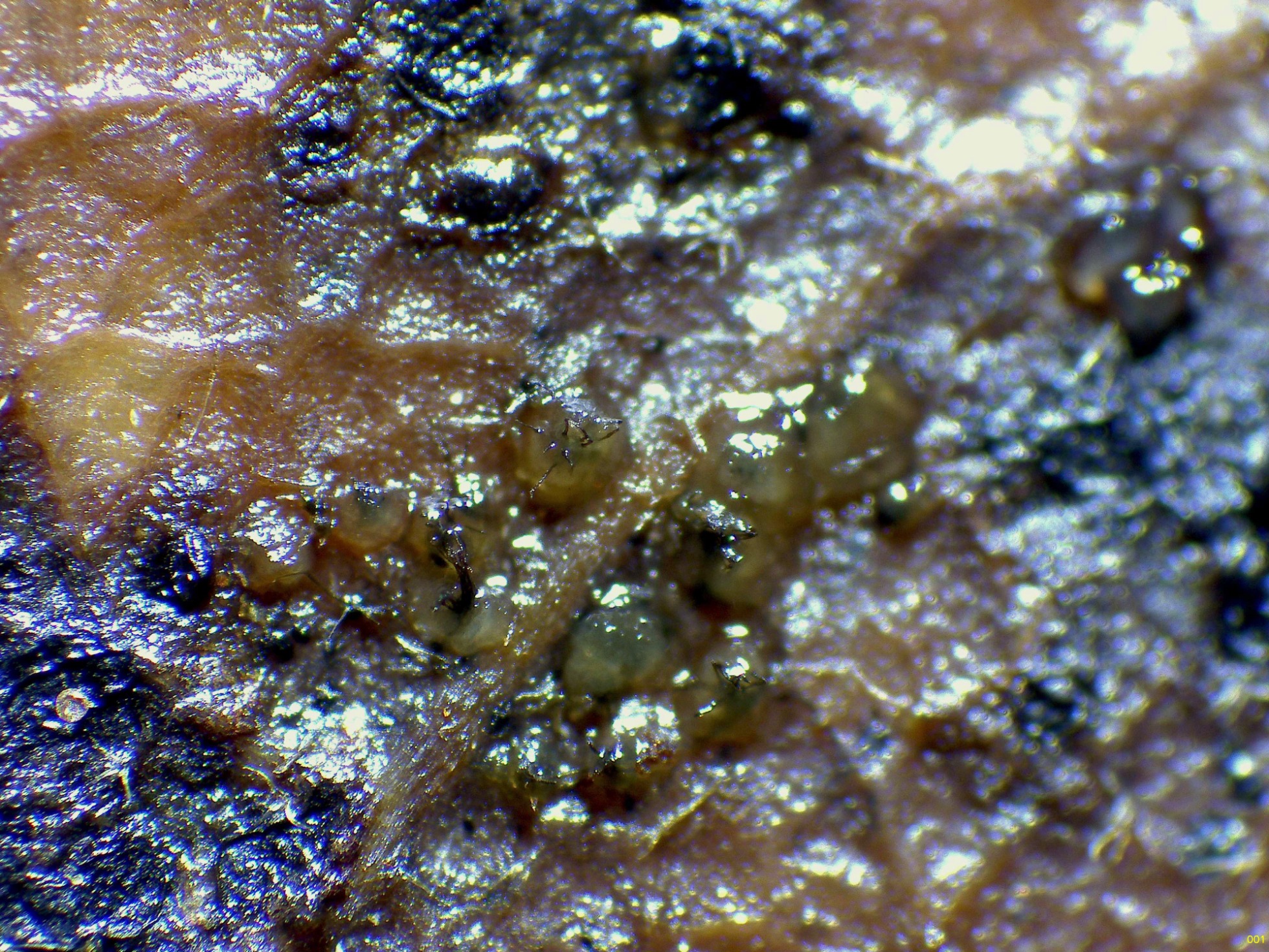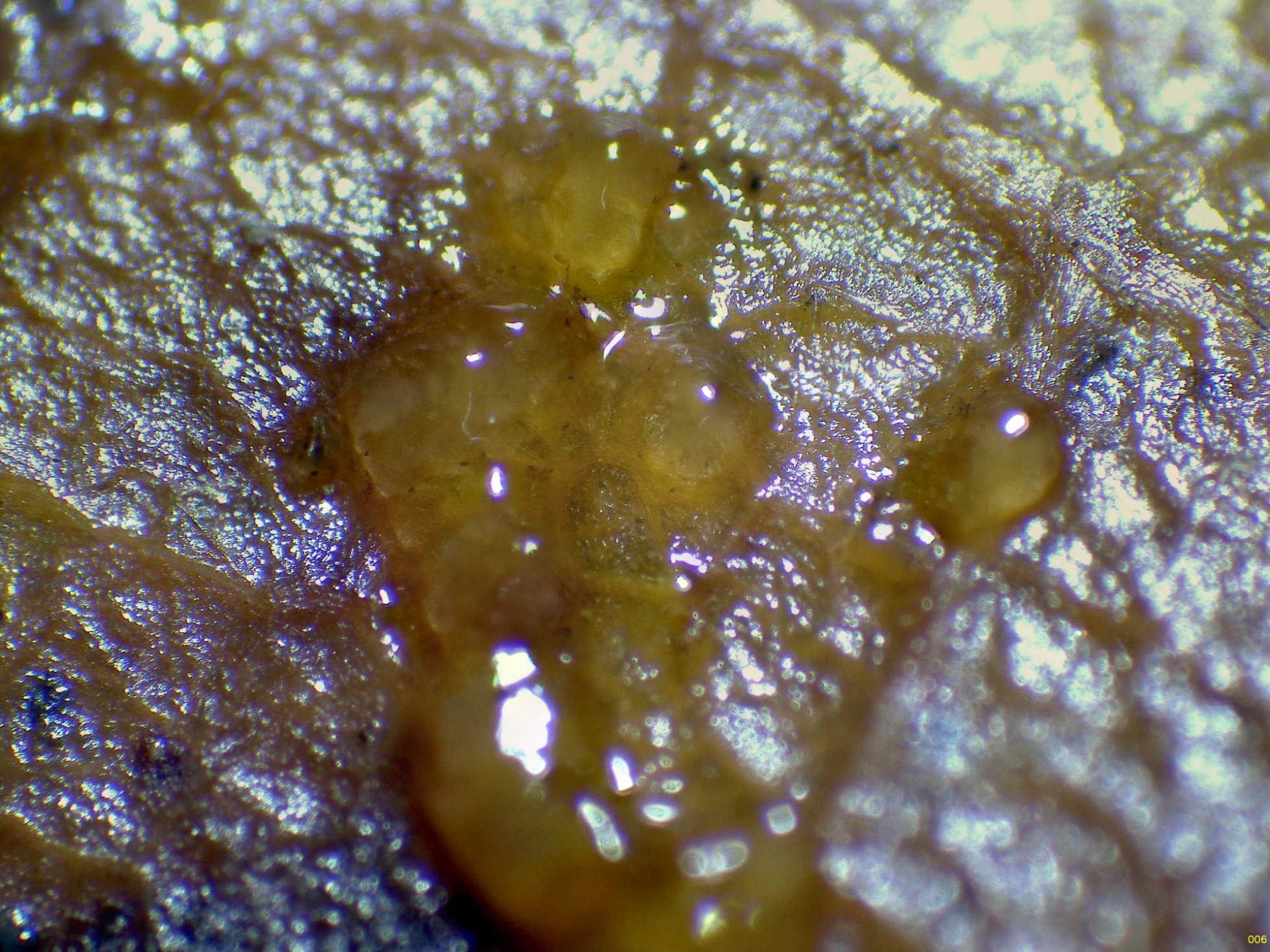 El pasado 24 de noviembre encontré unos pequeños peritecios de color negro sobre una hoja de roble, estos ya se encontraban en mal estado y al intentar cultivarlos en cámara húmeda, me aparecieron unos ascomas gelatinosos amarillos, con forma más o menos globosa, de muy pequeño tamaño de tan solo entre 0,5 y 0,7 mm. de diámetro.
