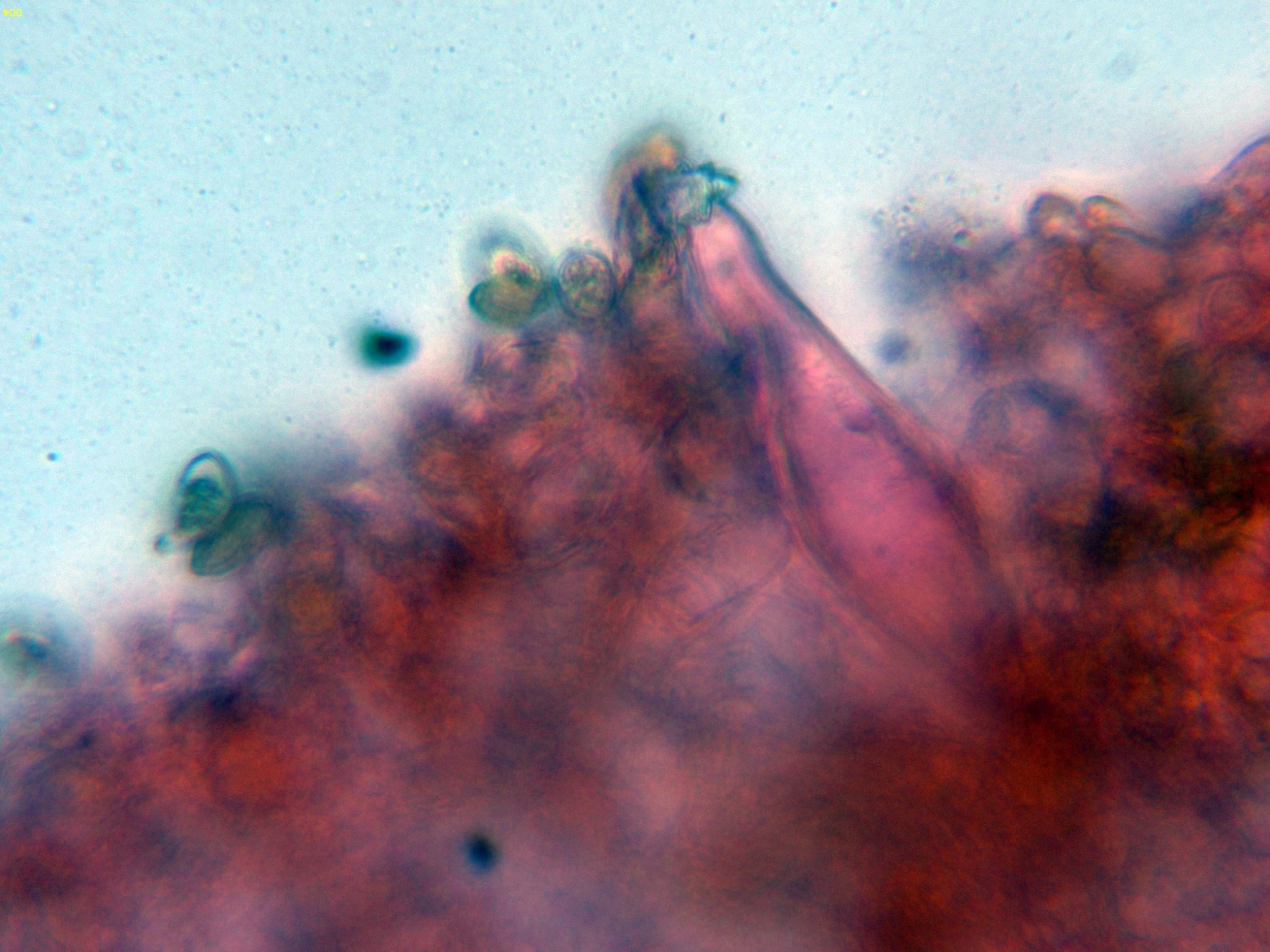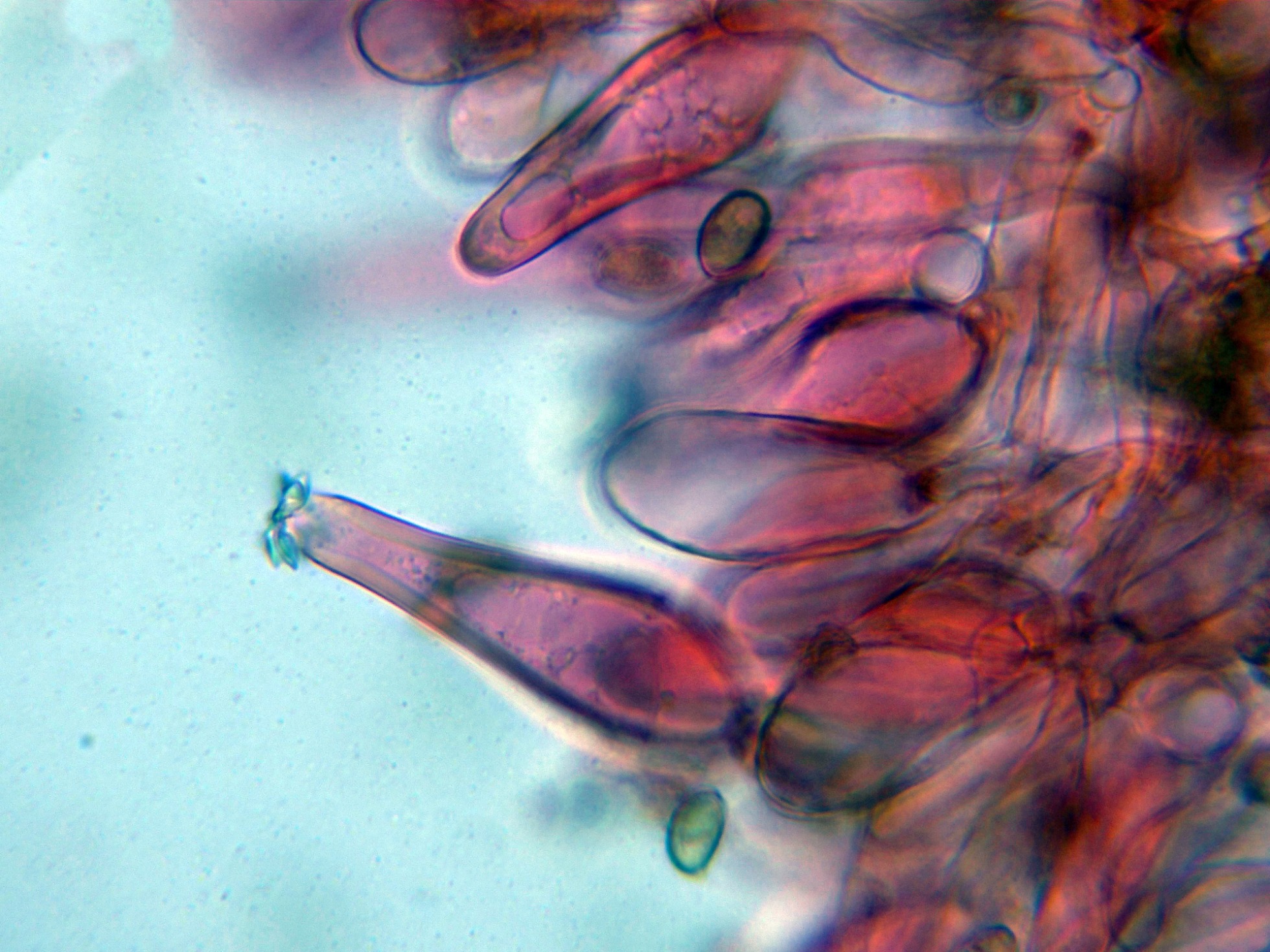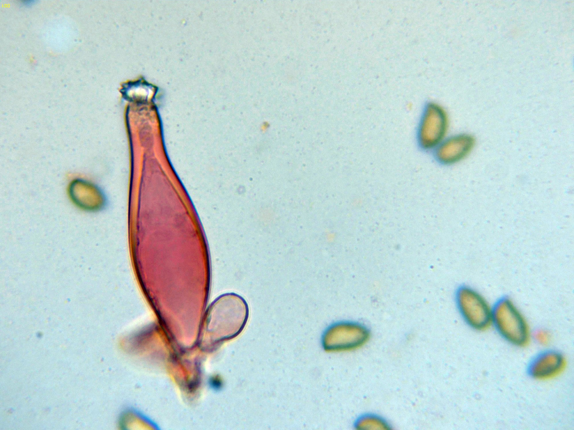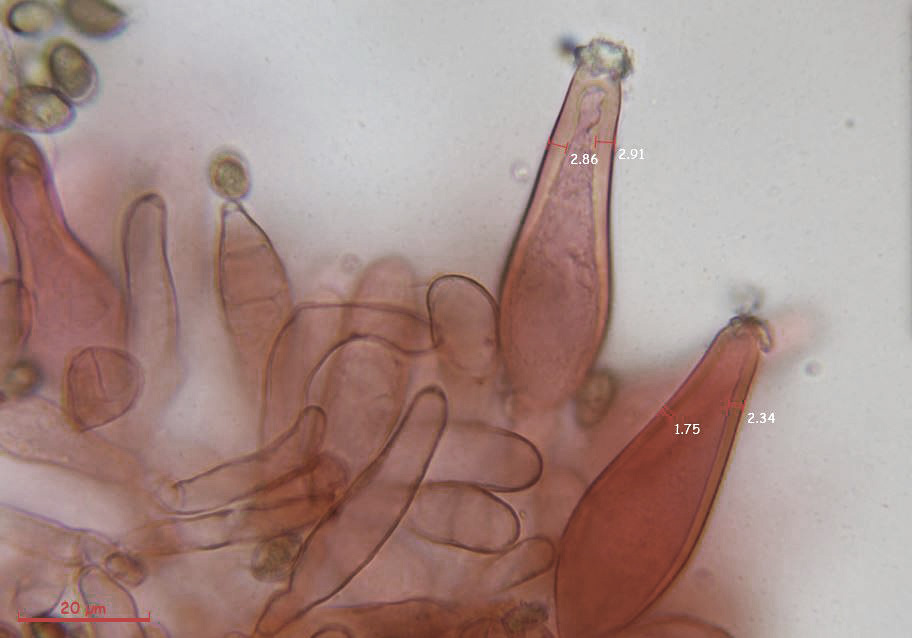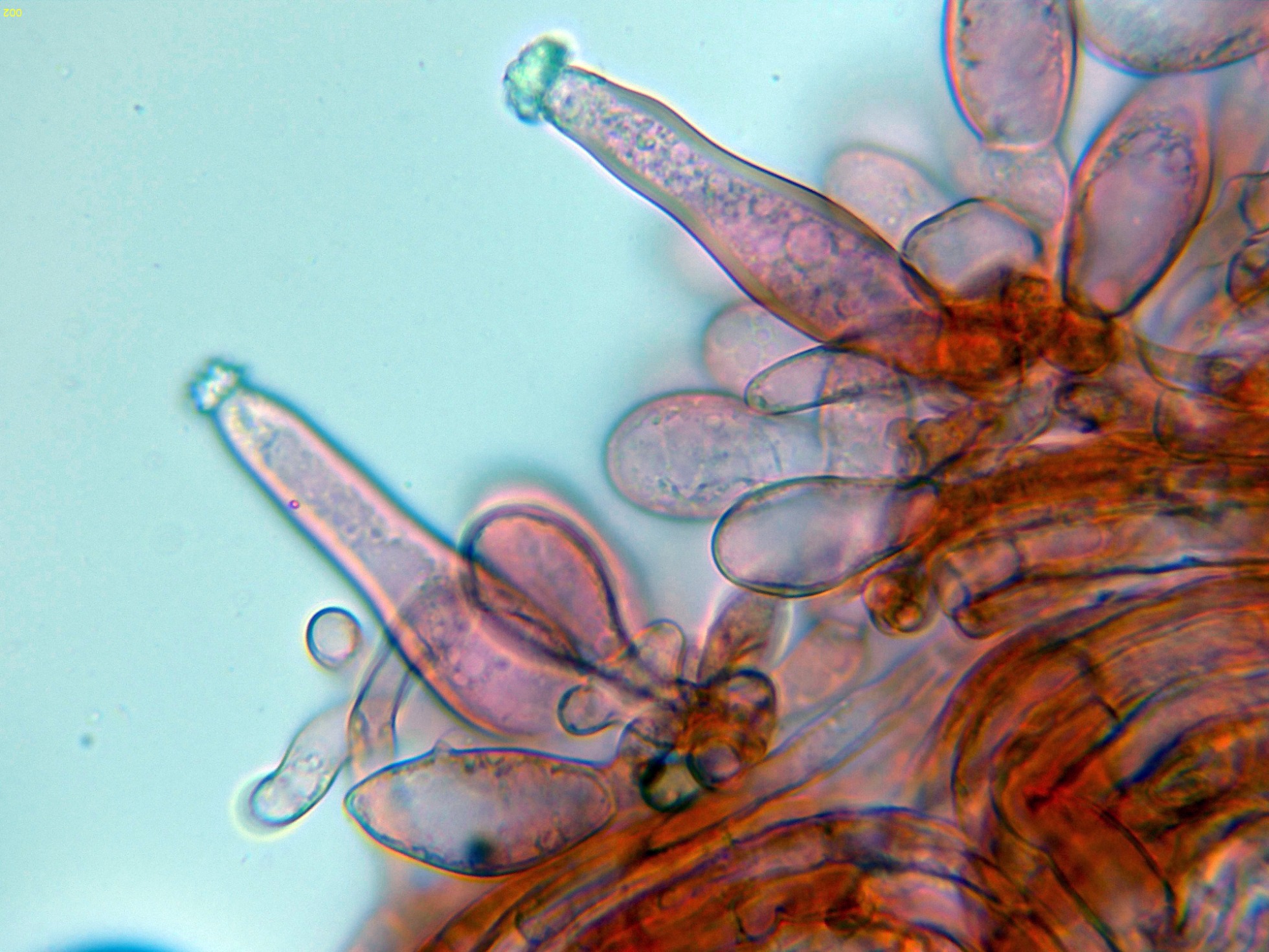 Queilocistidios fusiformes a subutriformes con critalizaciones en el ápice y unas medidas de (45,6) 45.8 - 59.3 (62.2) × (13.1) 14.6 - 17.2 (18.7) µm.