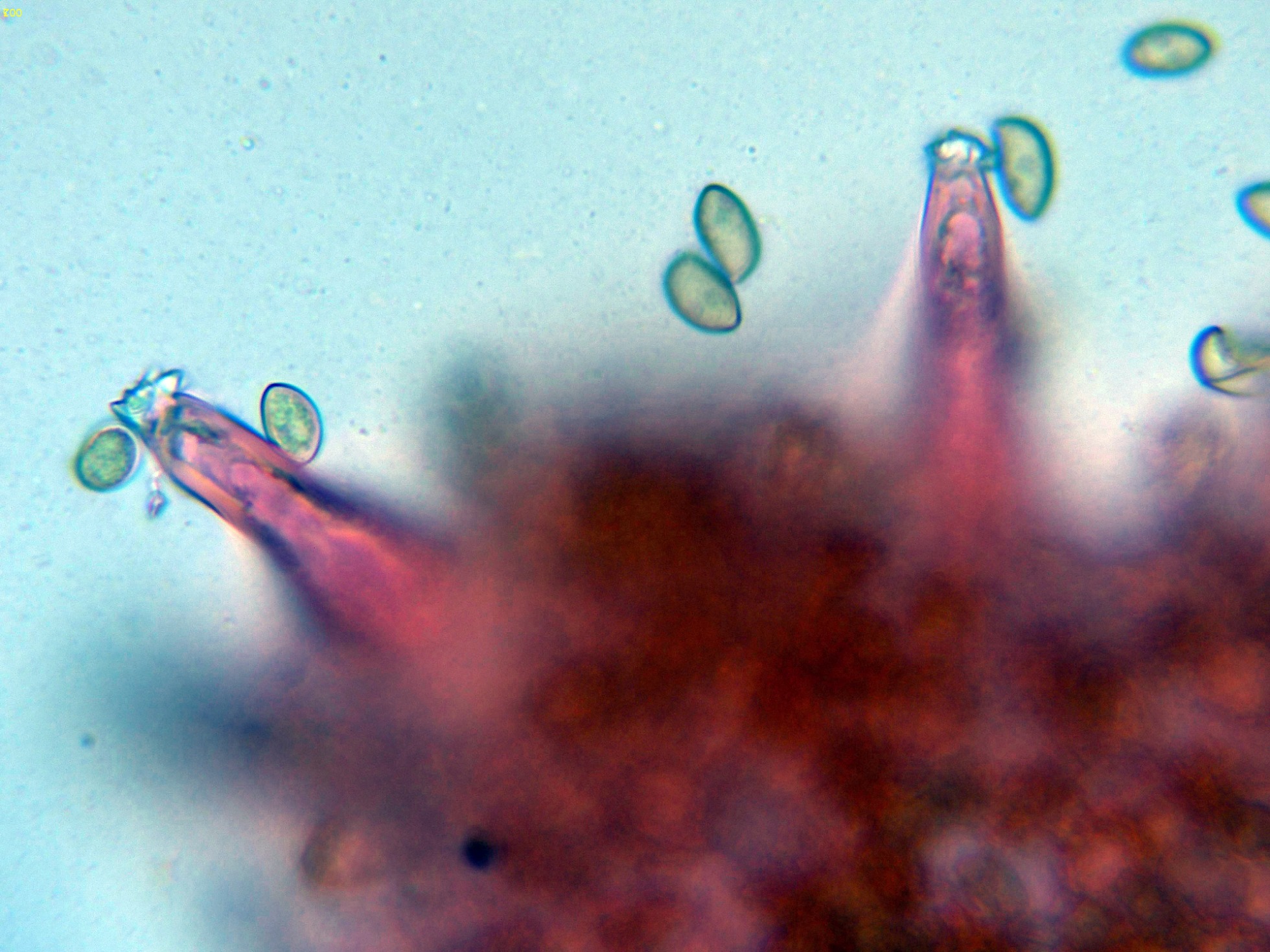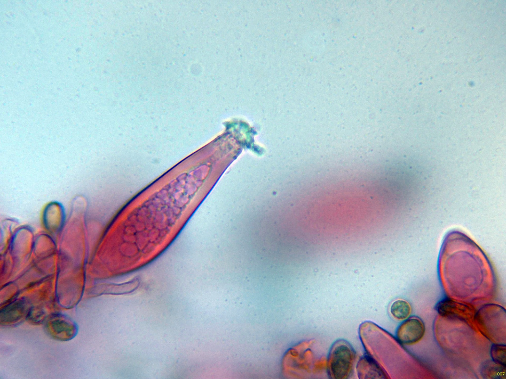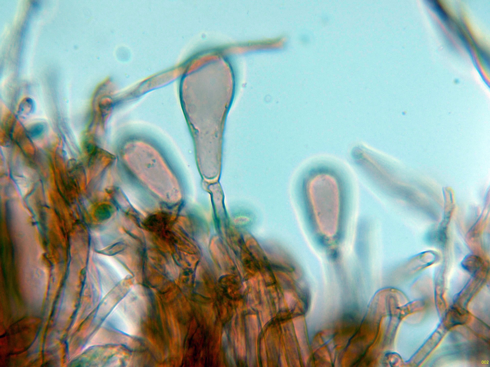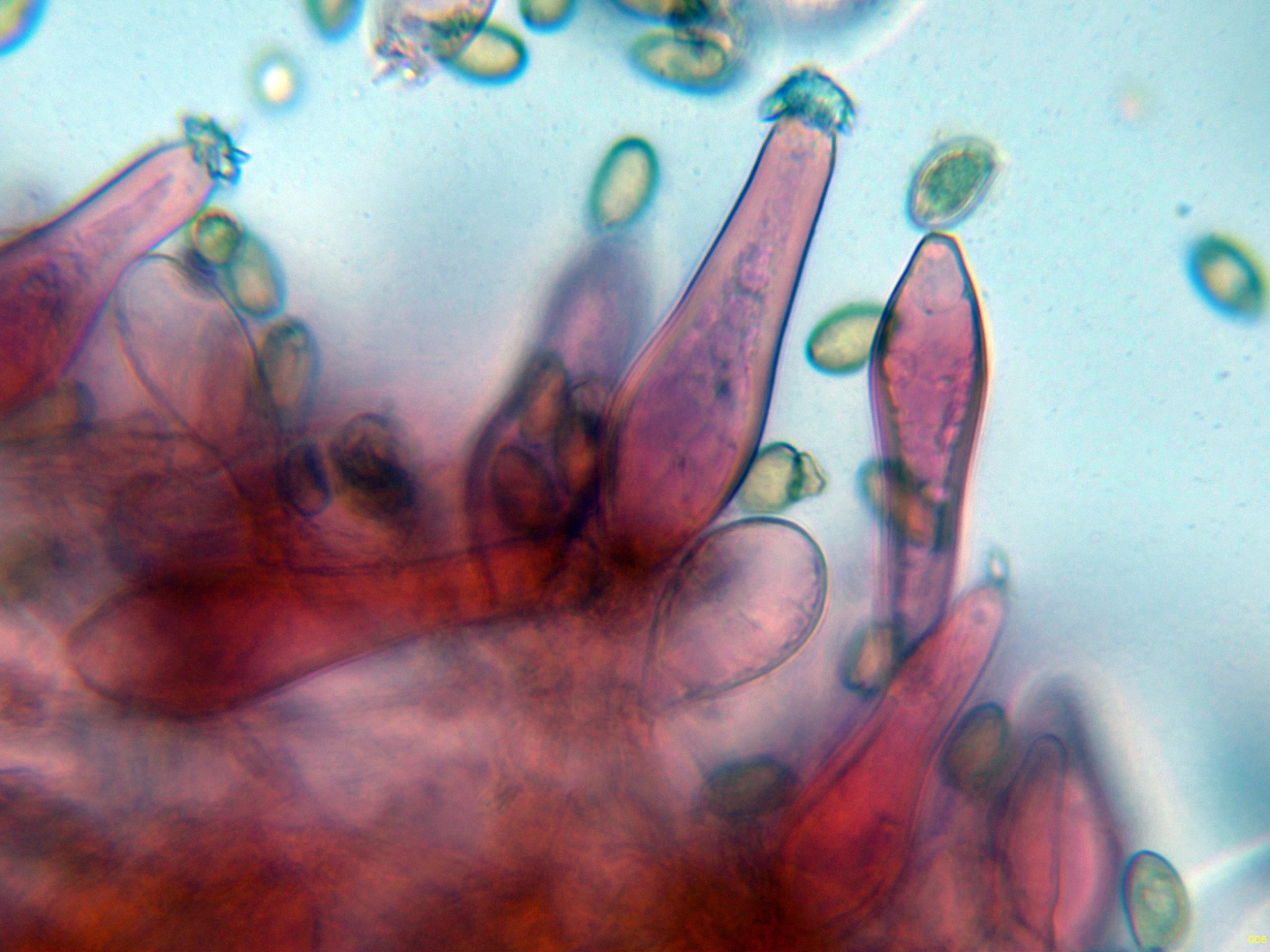 Queilocistidios fusiformes a subutriformes con critalizaciones en el ápice y unas medidas de (45,6) 45.8 - 59.3 (62.2) × (13.1) 14.6 - 17.2 (18.7) µm.