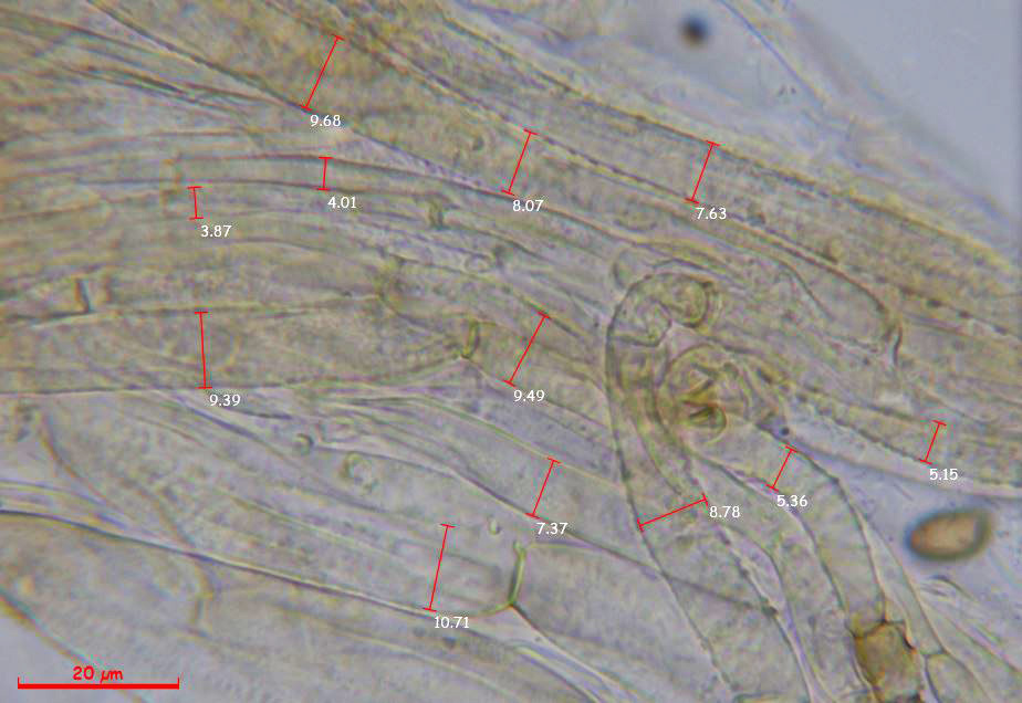 Unos queilocistidios con las medidas de la anchura de la pared: