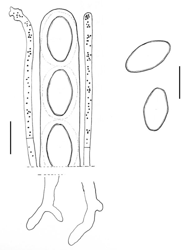 Por último añado un dibujo de Nicolás Van Vooren con las características de la microscopía de la Geopixis carbonaria: