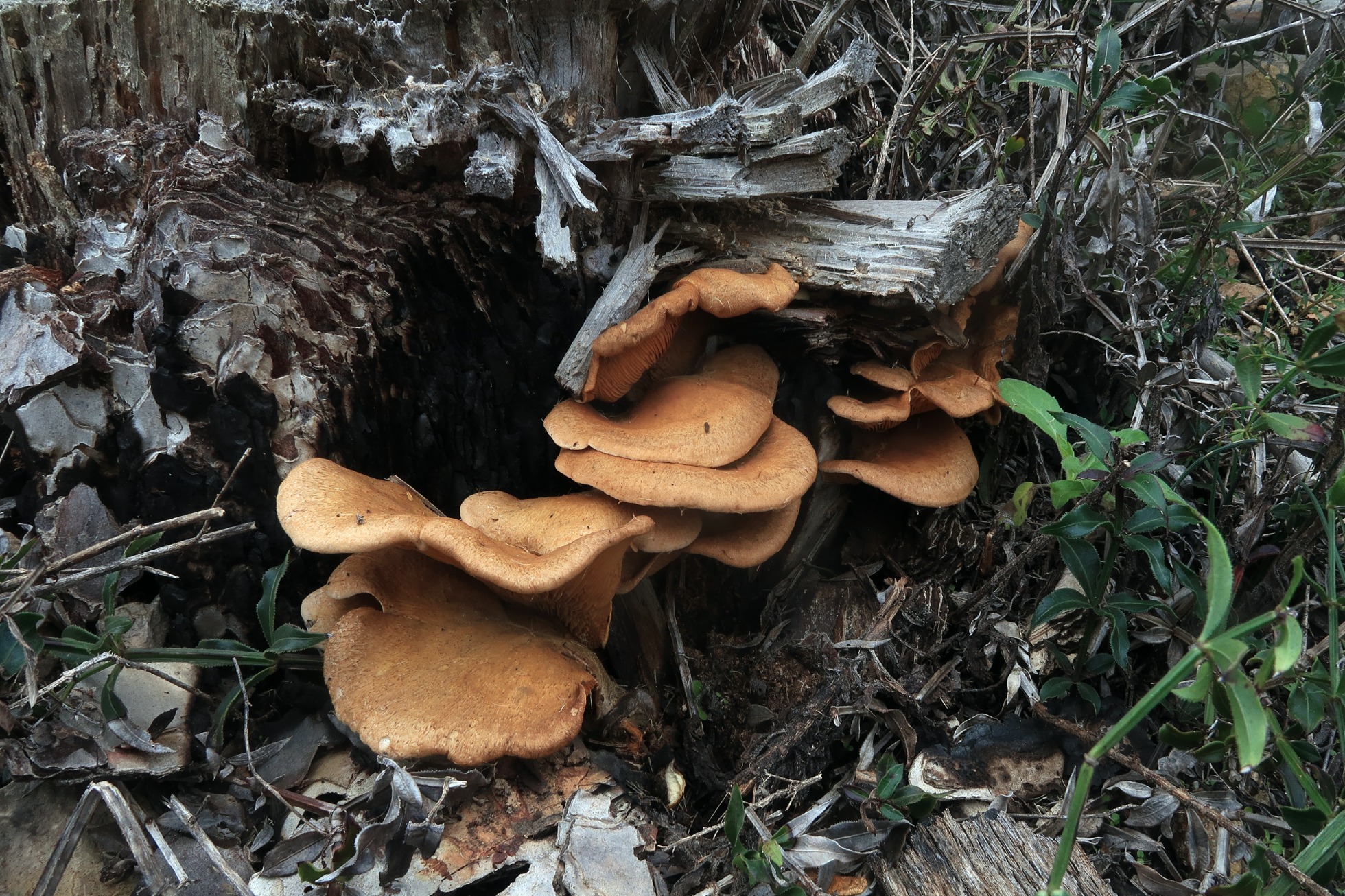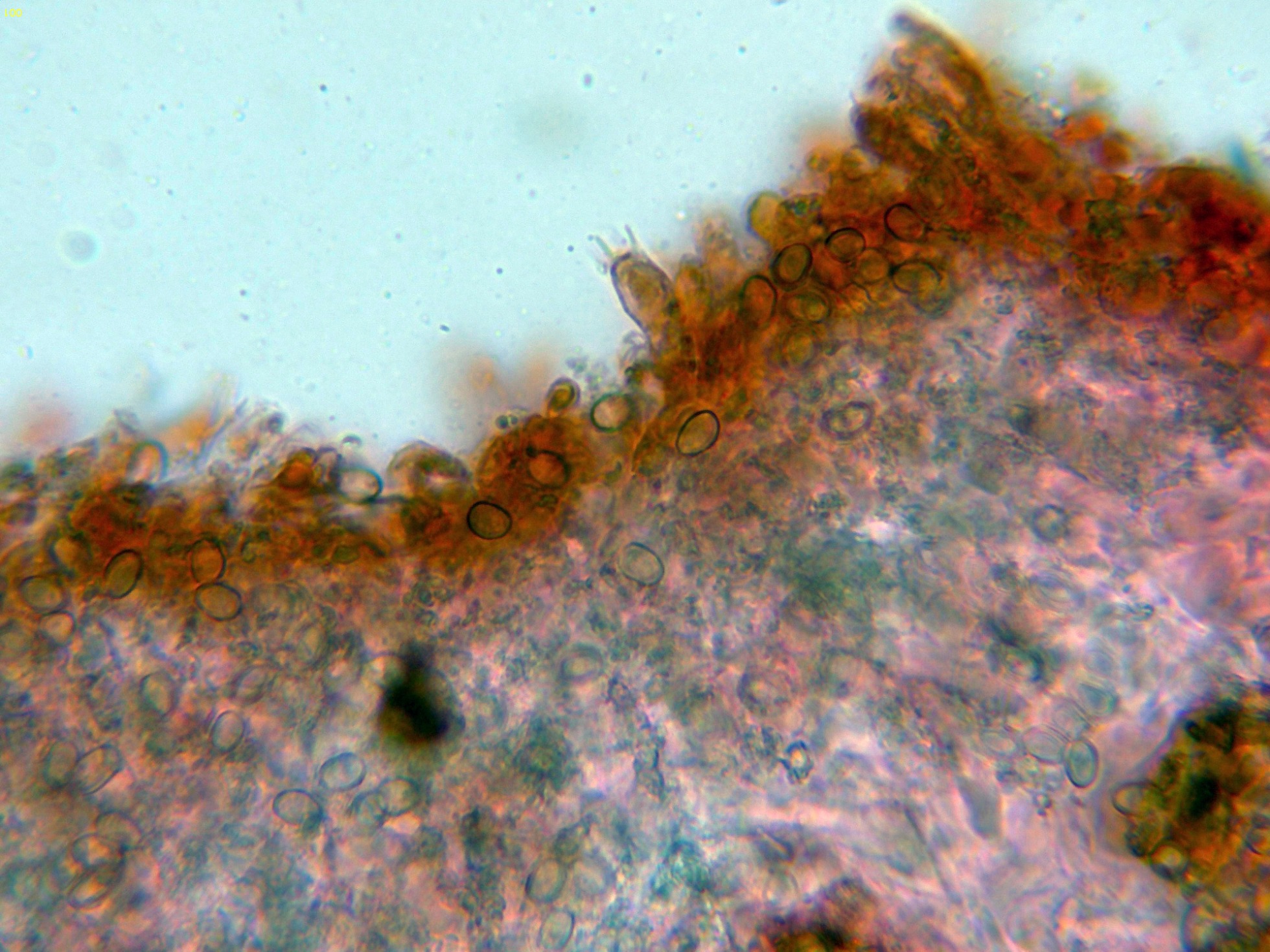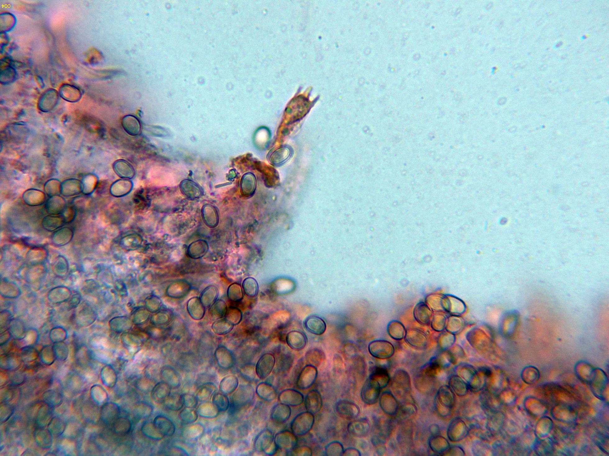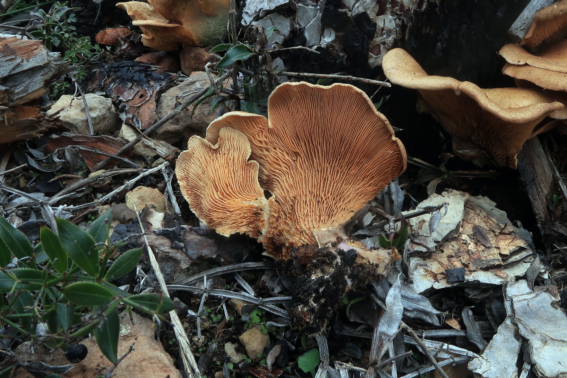 Un hongo lignícola que si bien no se considera para nada raro, he tardado 10 años en encontrar, y del que no disponía de su microscopía, brotando de manera abundante sobre un tocón de pino, sobre suelo quemado, aunque esto no tiene nada que ver con la especie, tenemos por fin la: