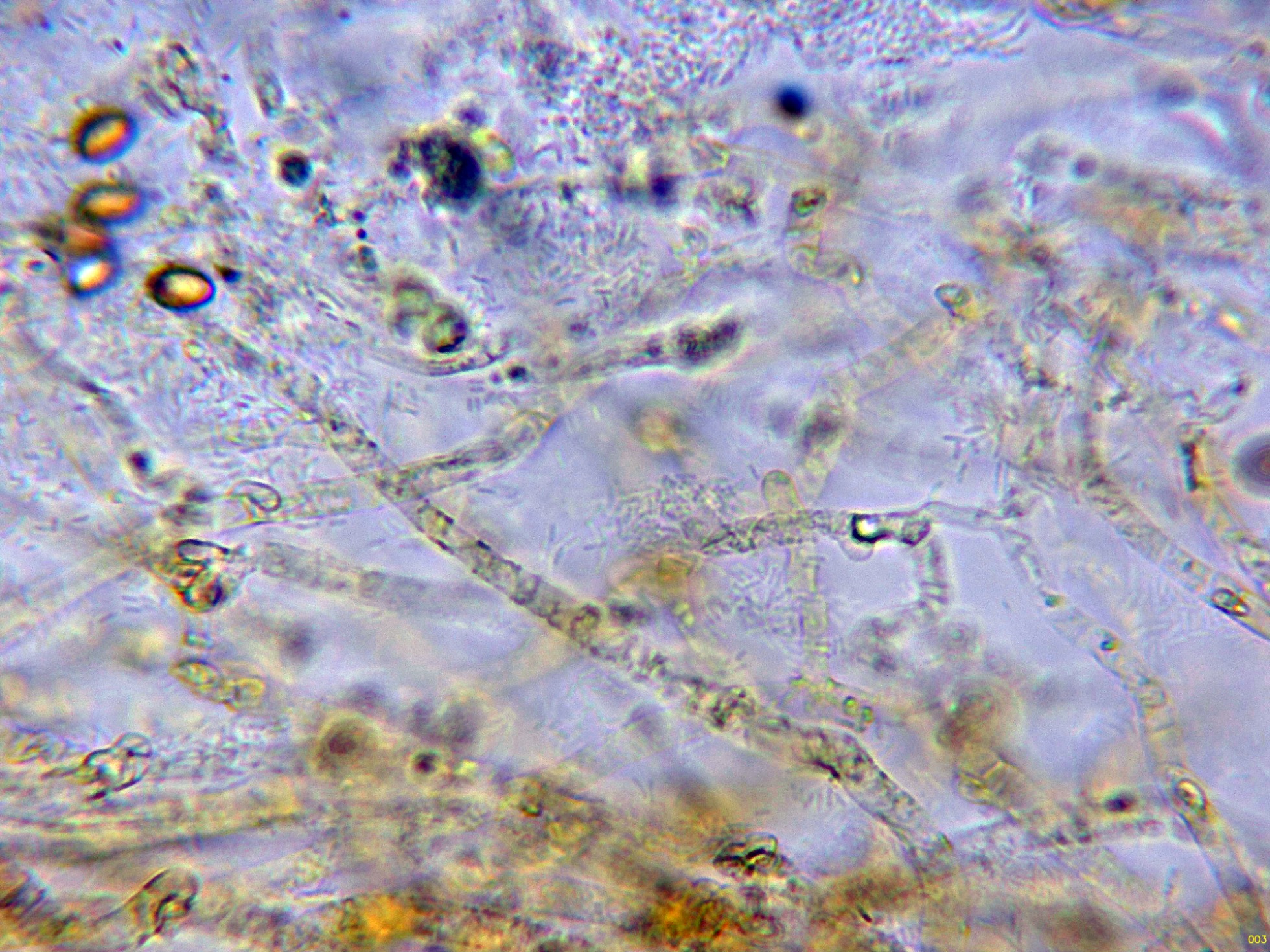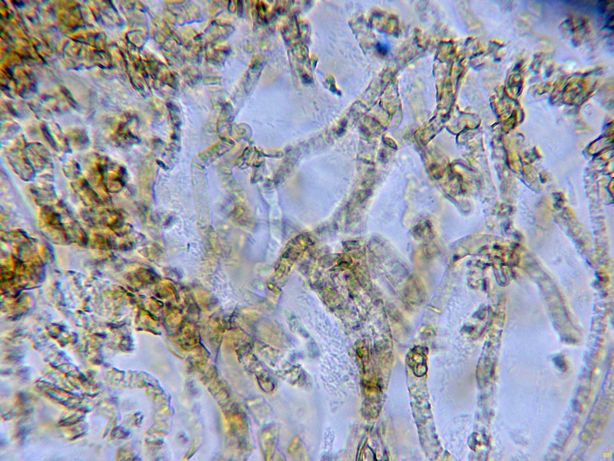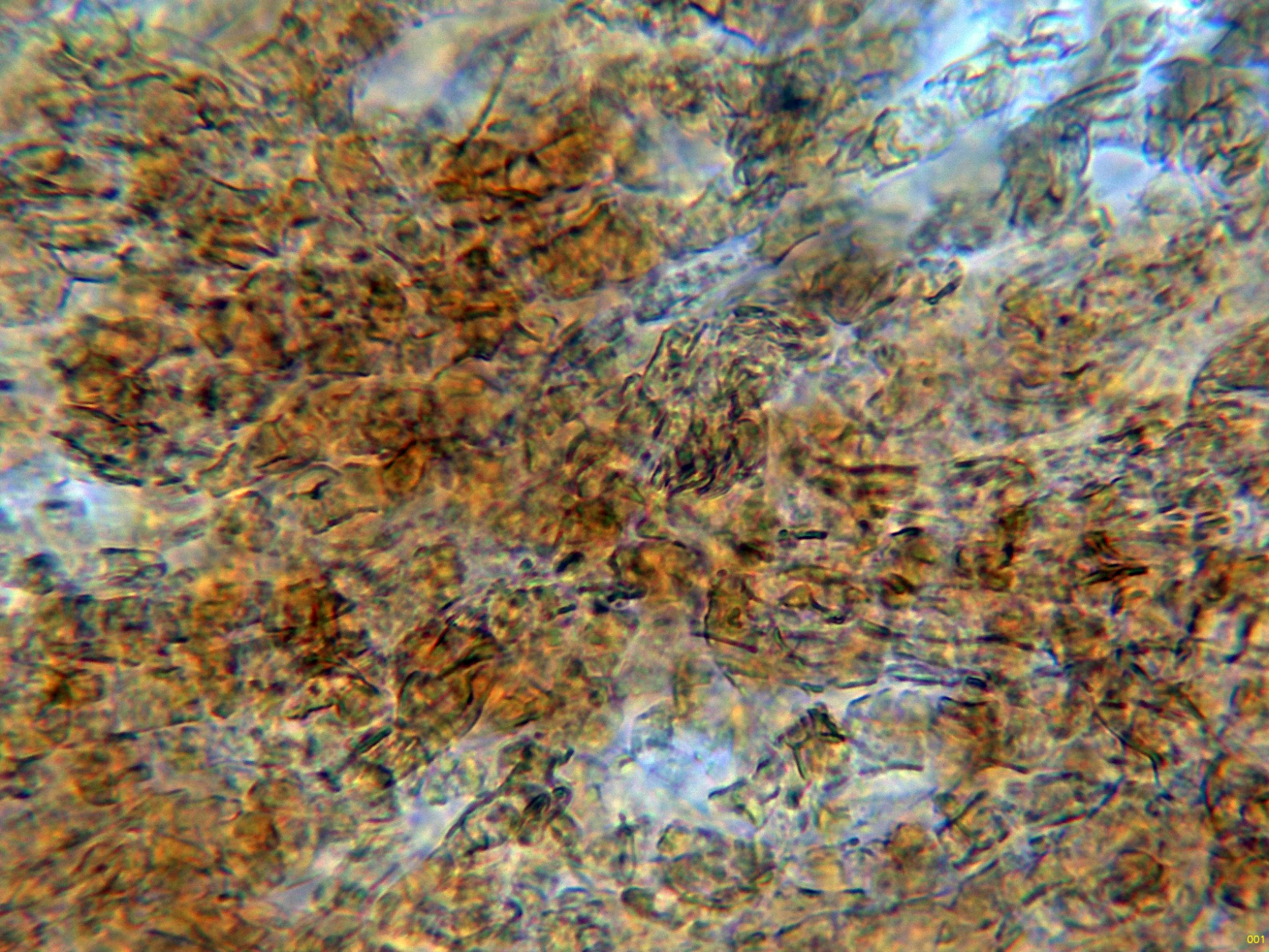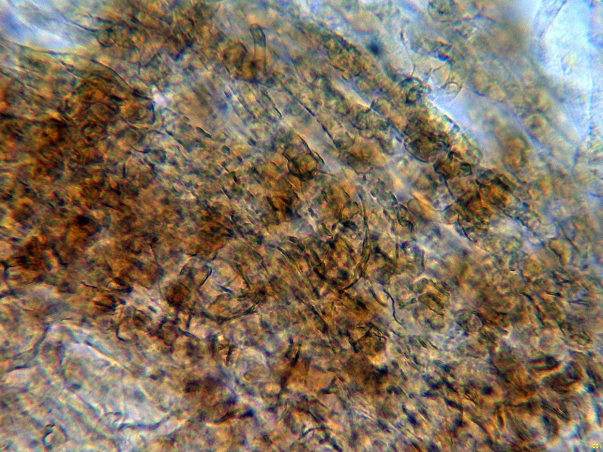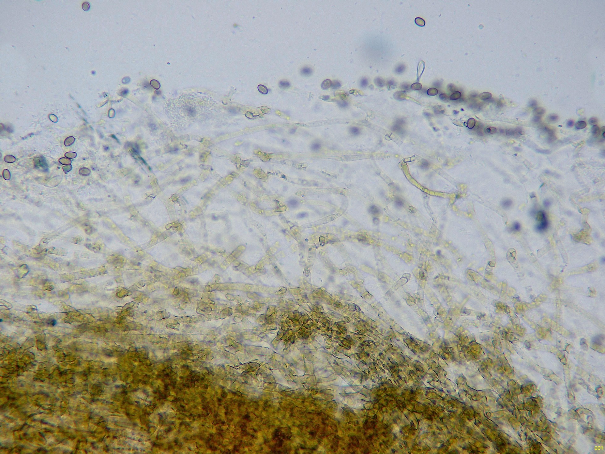 Por debajo de estas una capa de hifas ya más compactadas, con incrustaciones y pigmento marrón ocráceo: