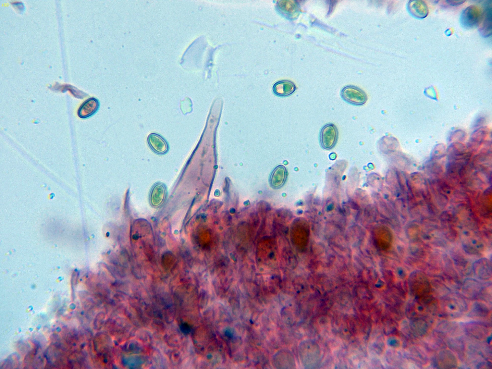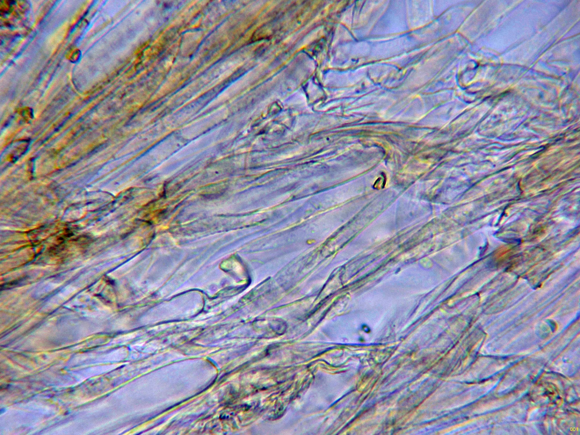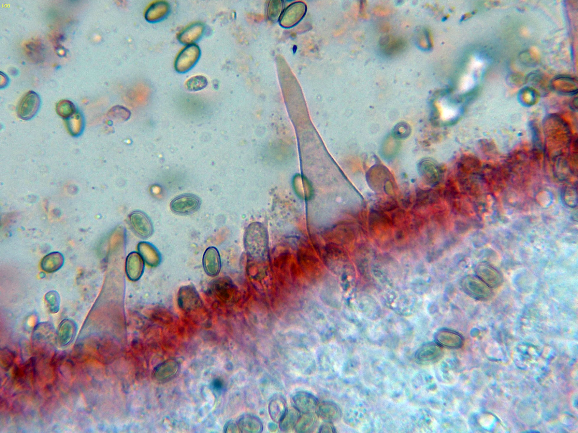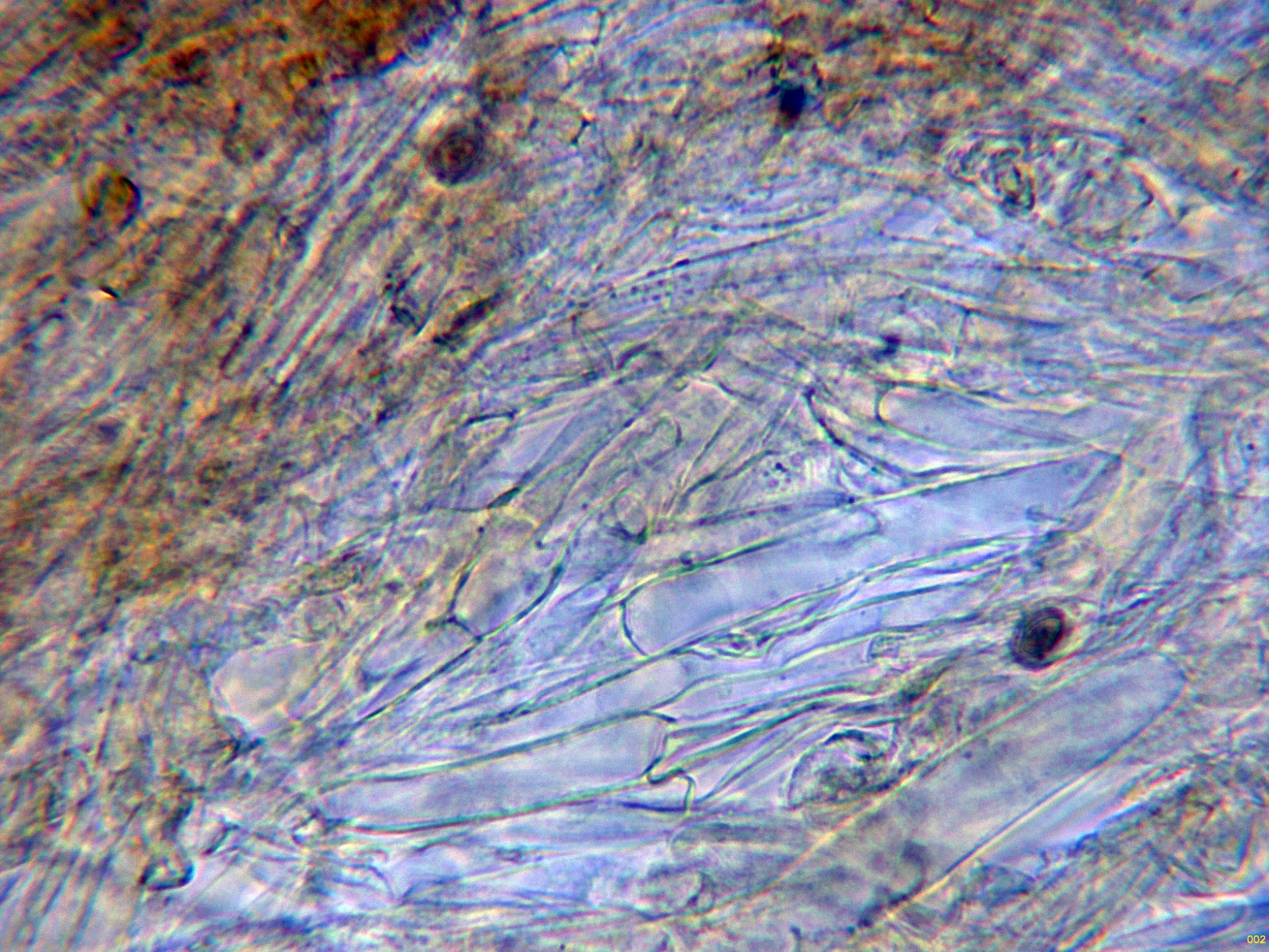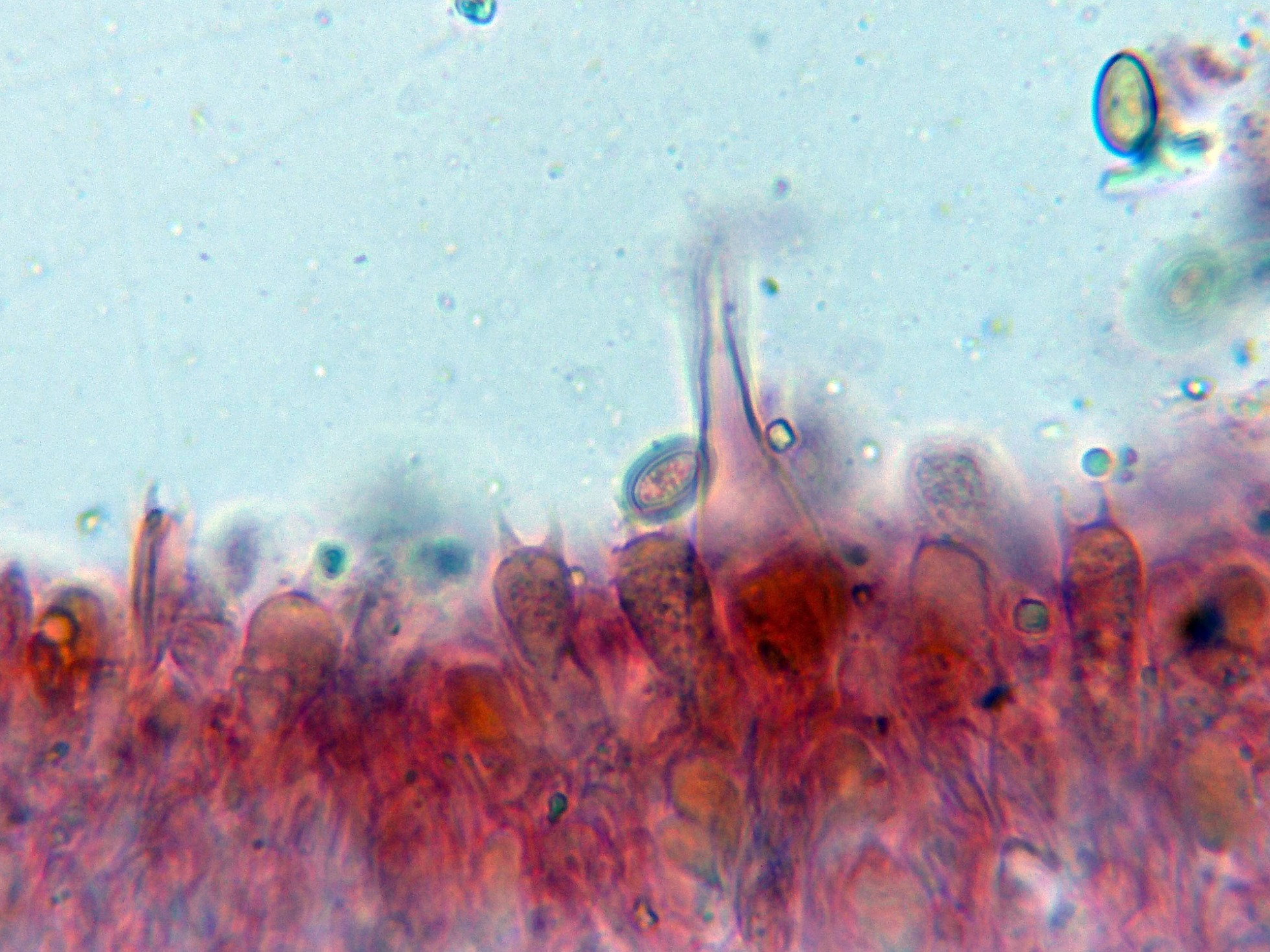 En la parte superior del pie se pueden observar unas escasas células terminales a modo de caulocistidios: