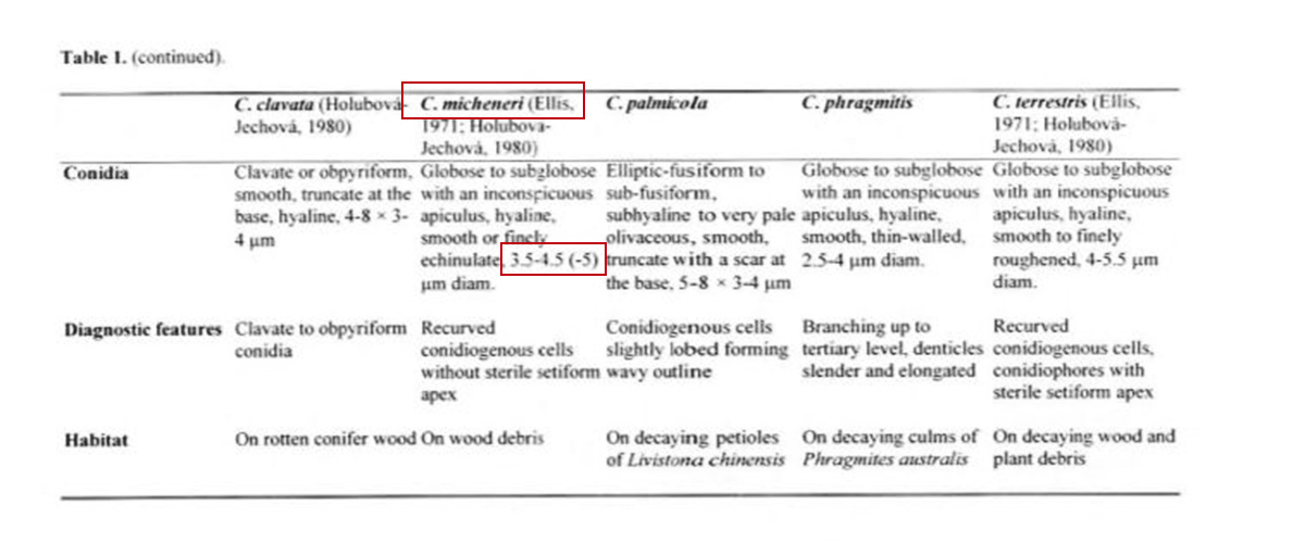 Asimismo las medidas de los conidios dentro del género Costantinella, encajan perfectamente con la especie propuesta, añado una captura de pantalla con las medidas que le corresponden, la imágen la he extraído del documento "Two new species of Constantinella from Hong Kong":