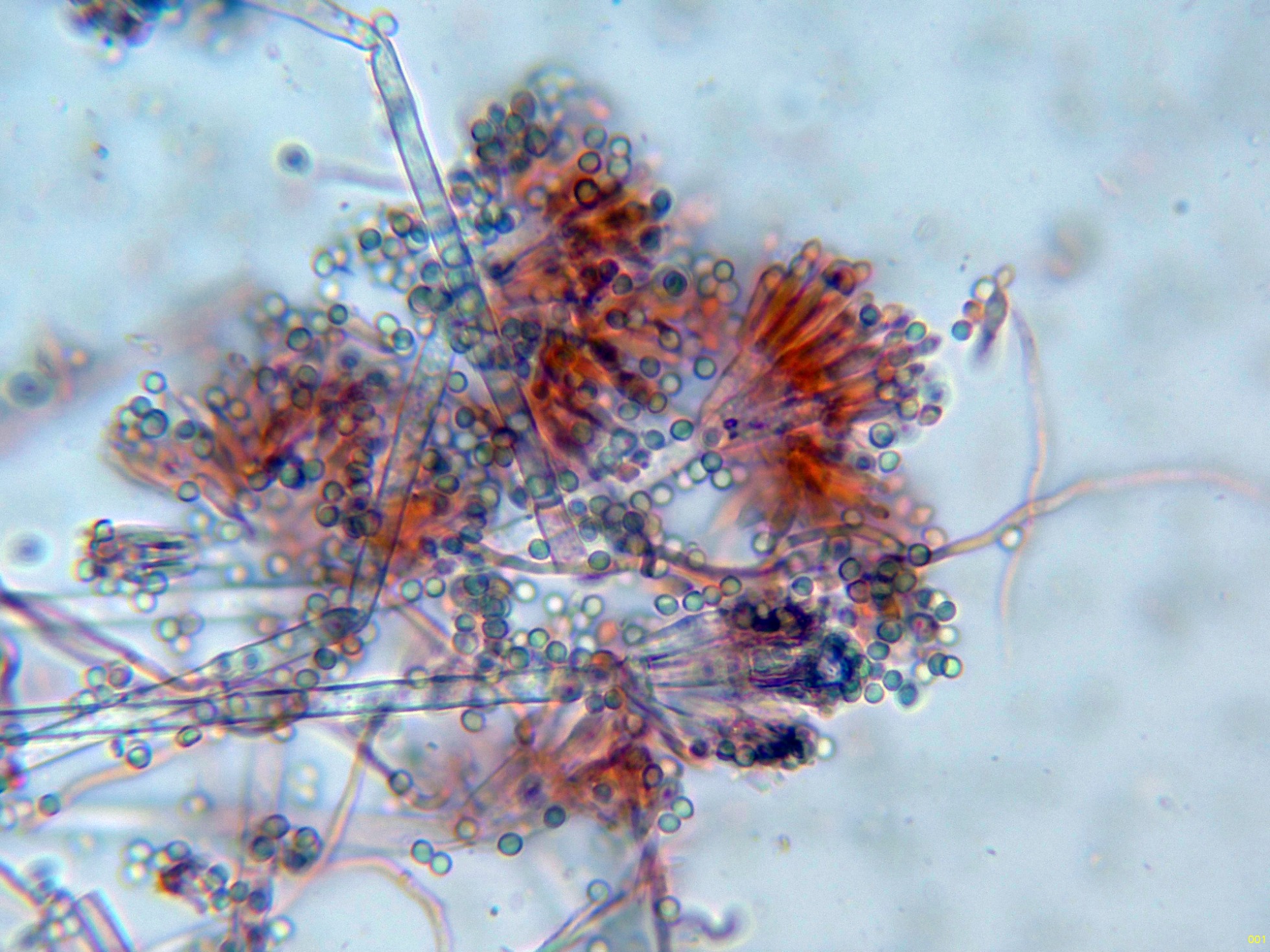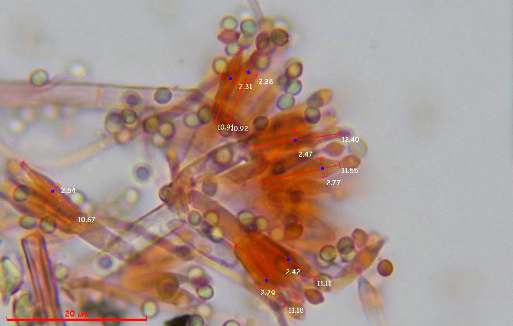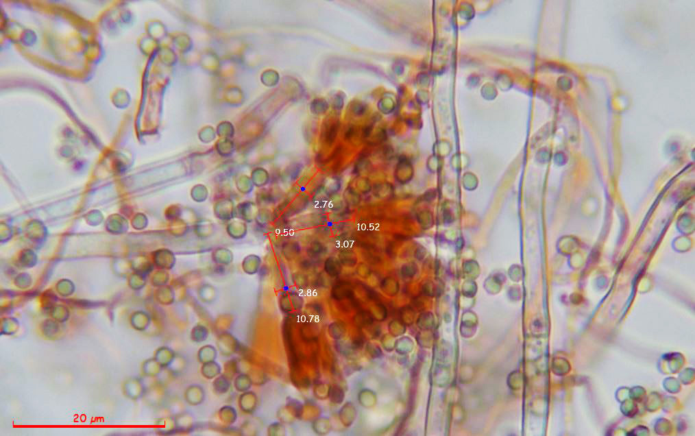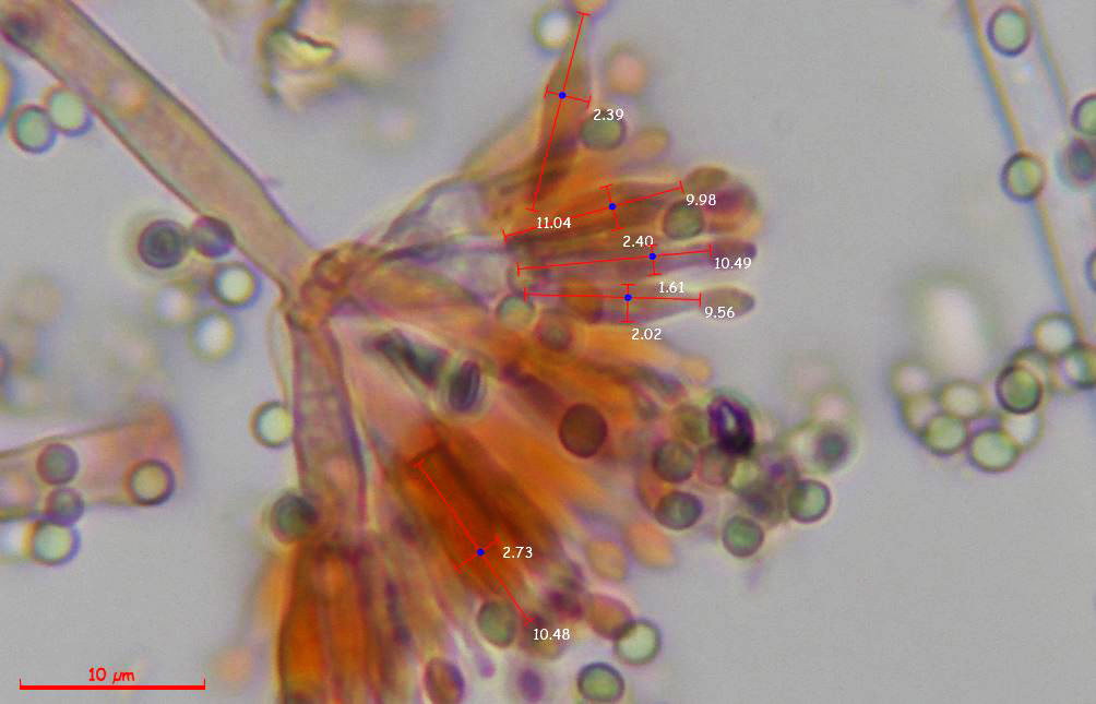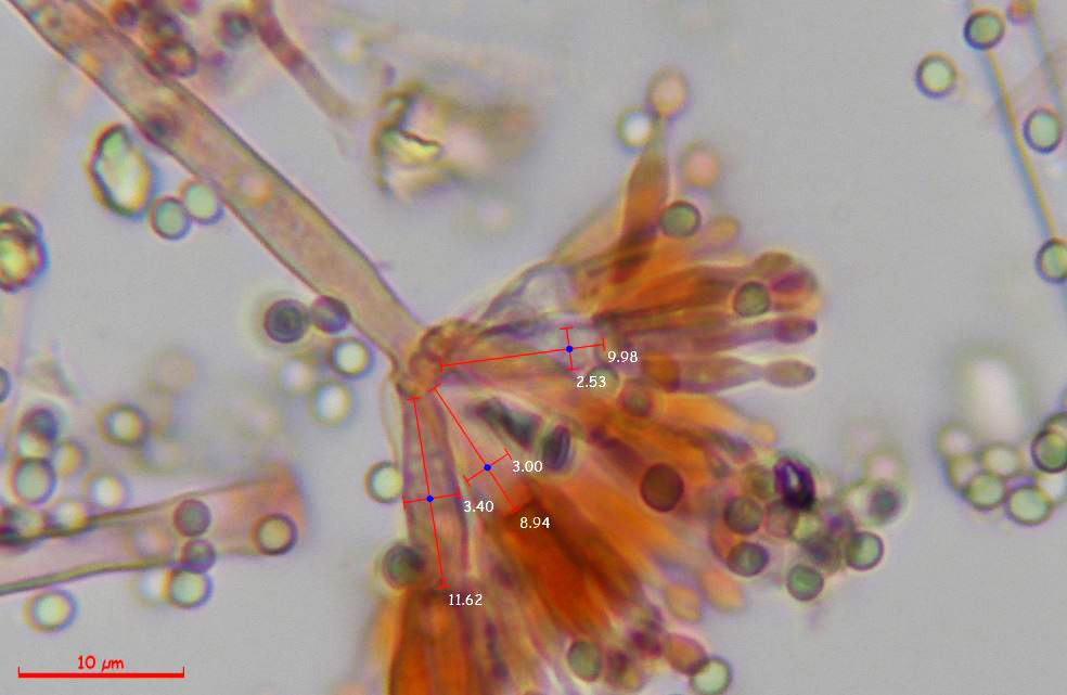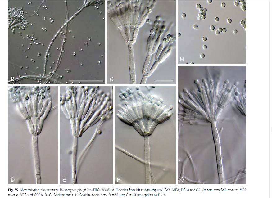 Estudio contrastado con la información del documento del 22 de septiembre de 2014, con el título "Polyphasic taxonomy of the genus Talaromyces", en el que se indican para el Talaromyces pinophilus unas medidas para las fiálides de 8.5–12 × 2–3 μm., unas medidas para las métulas de 10–11 × 2.5–3 μm. y unas medidas para los conidios de 2–3 × 2–3 μm., todos los parámetros muy acorde con los reflejados en el presente estudio. Añado una imágen con la microscopía del Talaromyces pinophilus extraída del mismo documento: