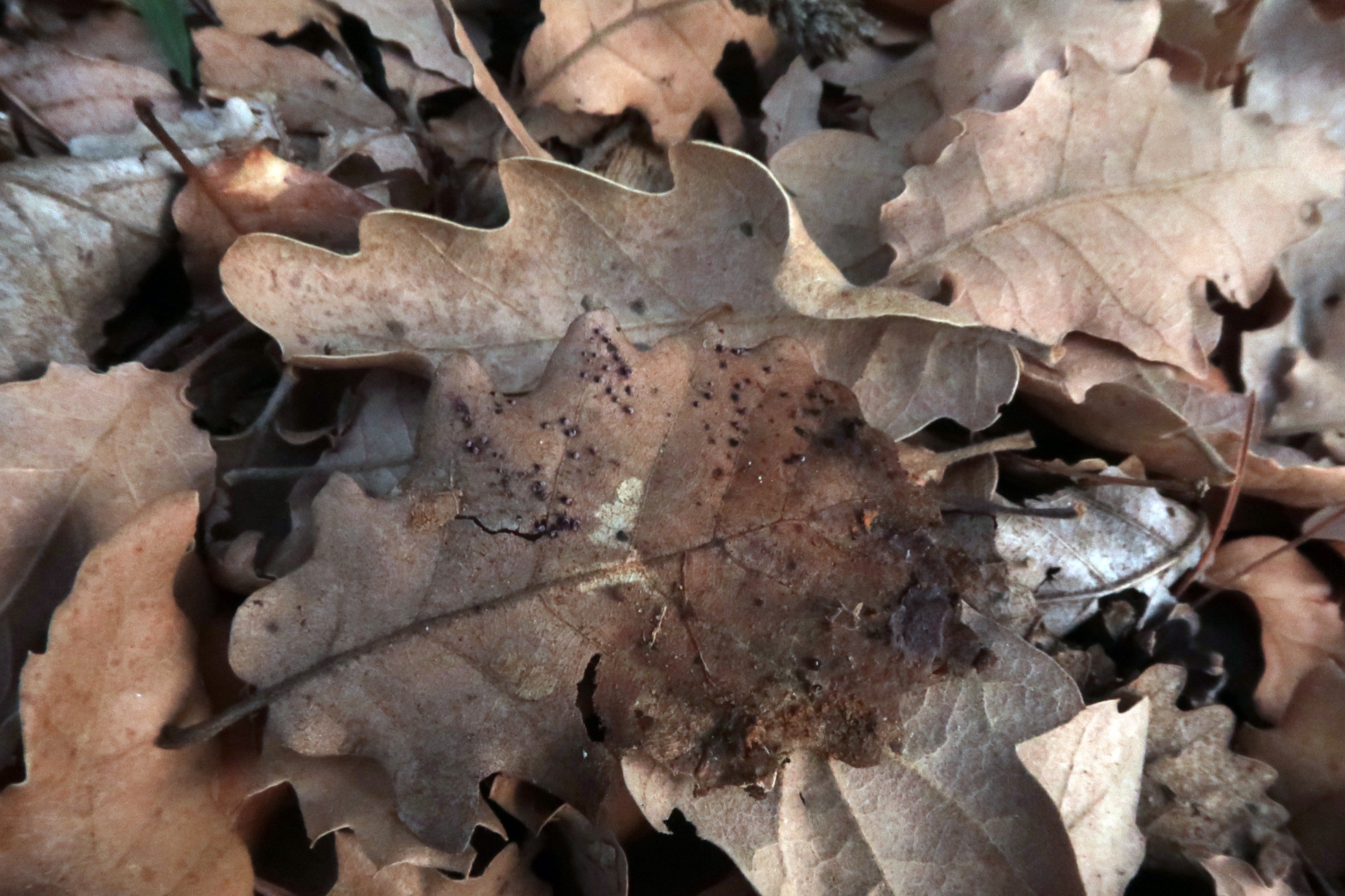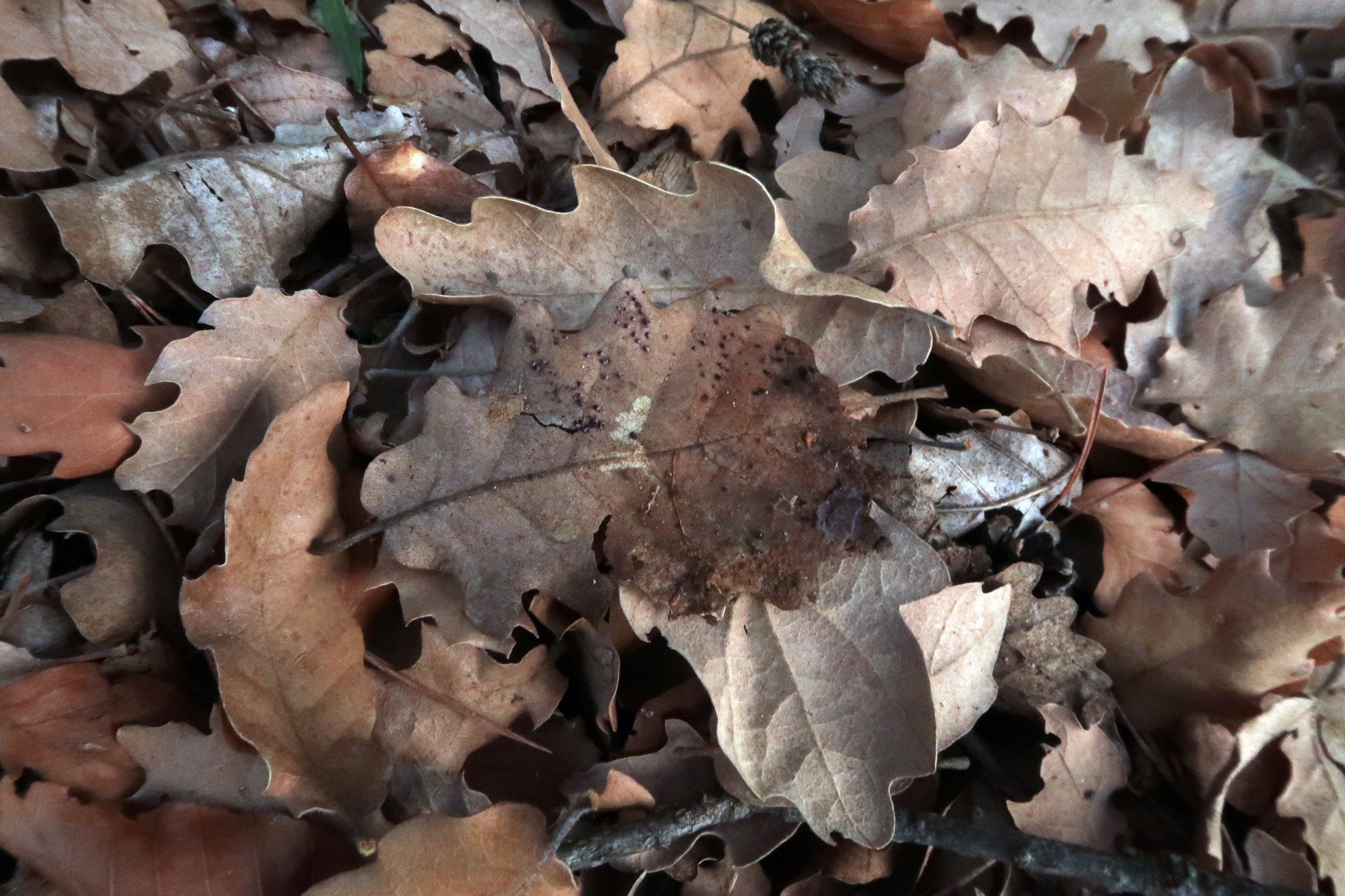 Un Mixomiceto nuevo para mí, fotografiado el 1 de diciembre pasado brotando sobre una hoja de roble, muy probablemente el: