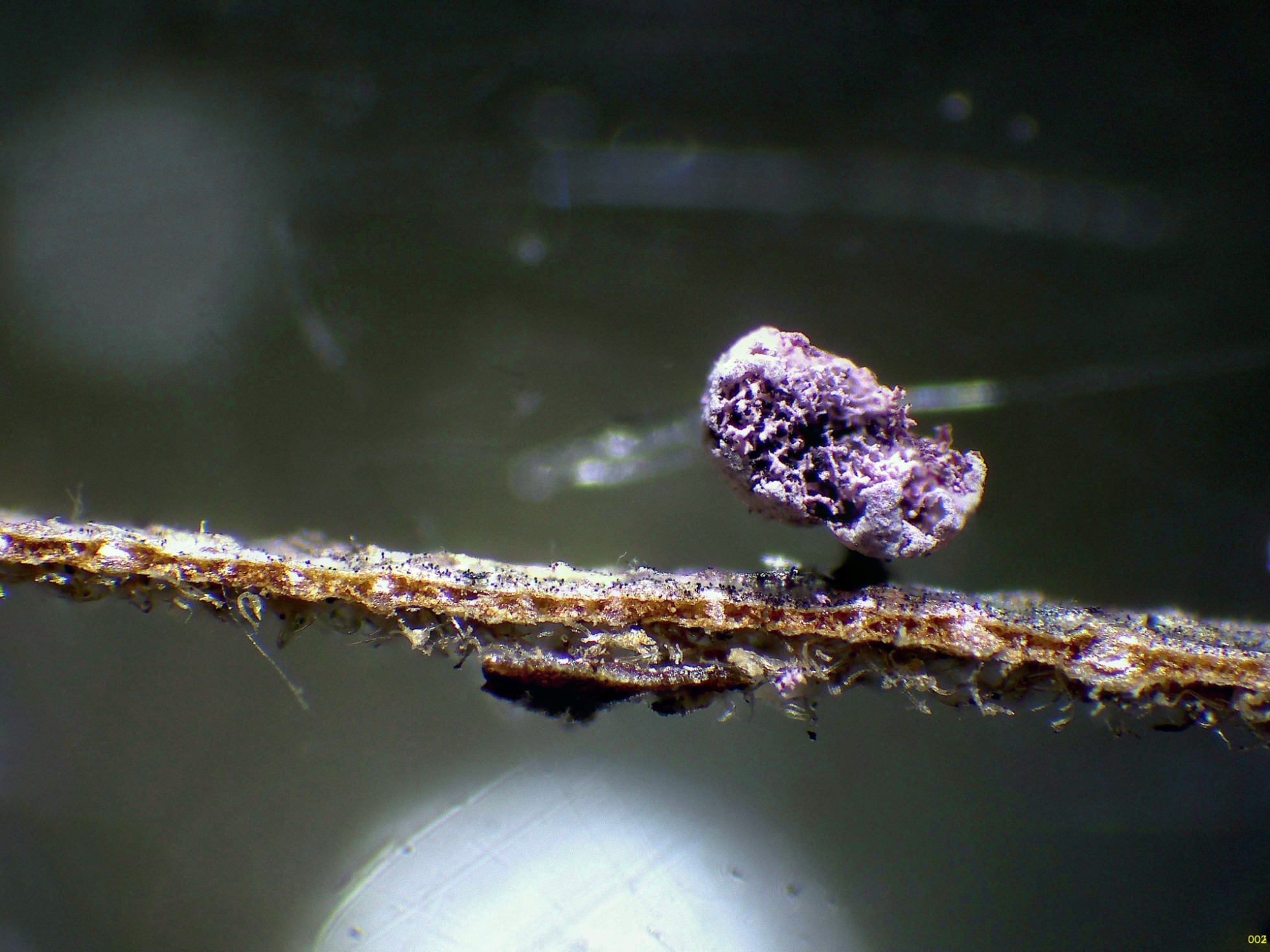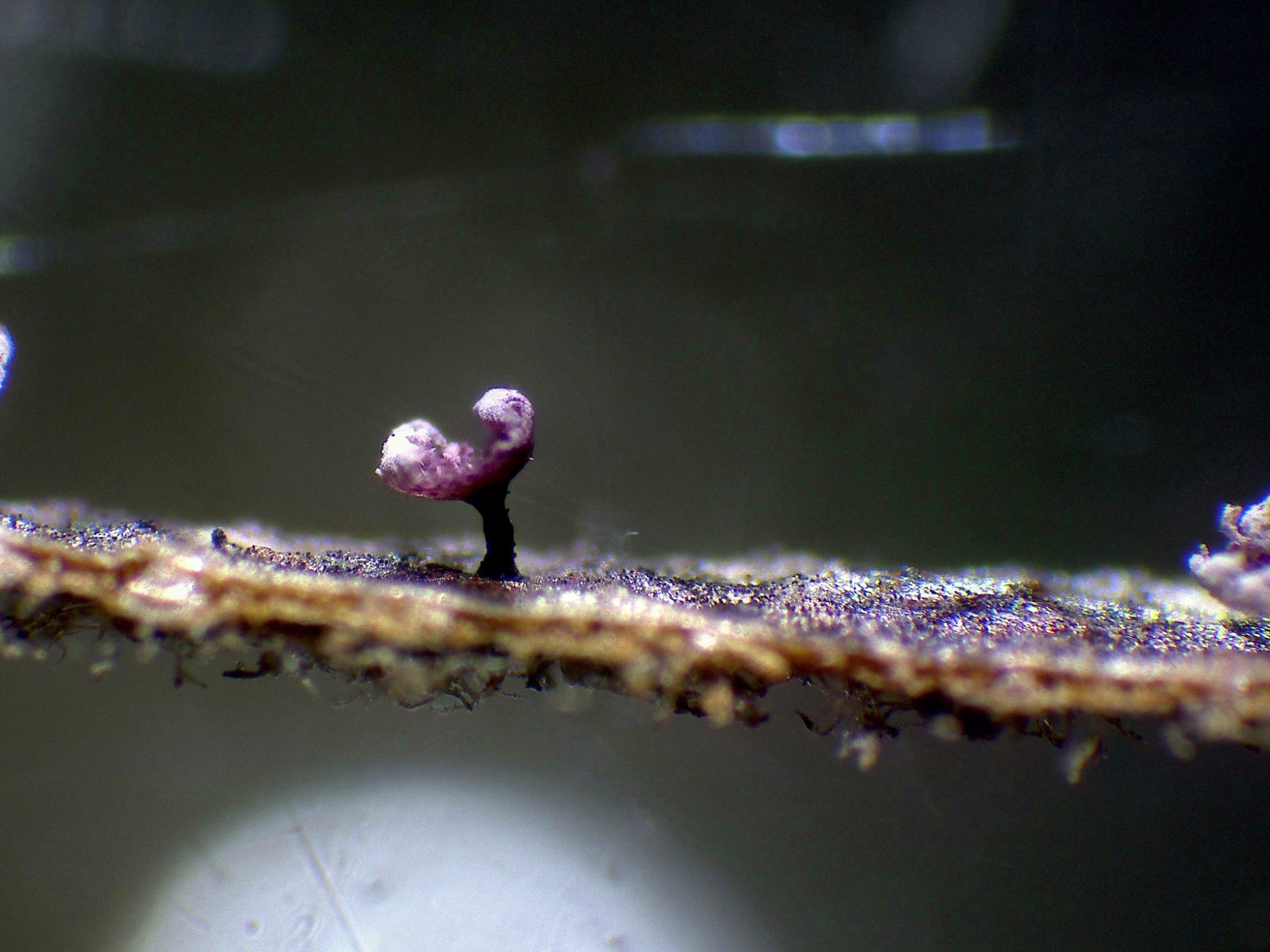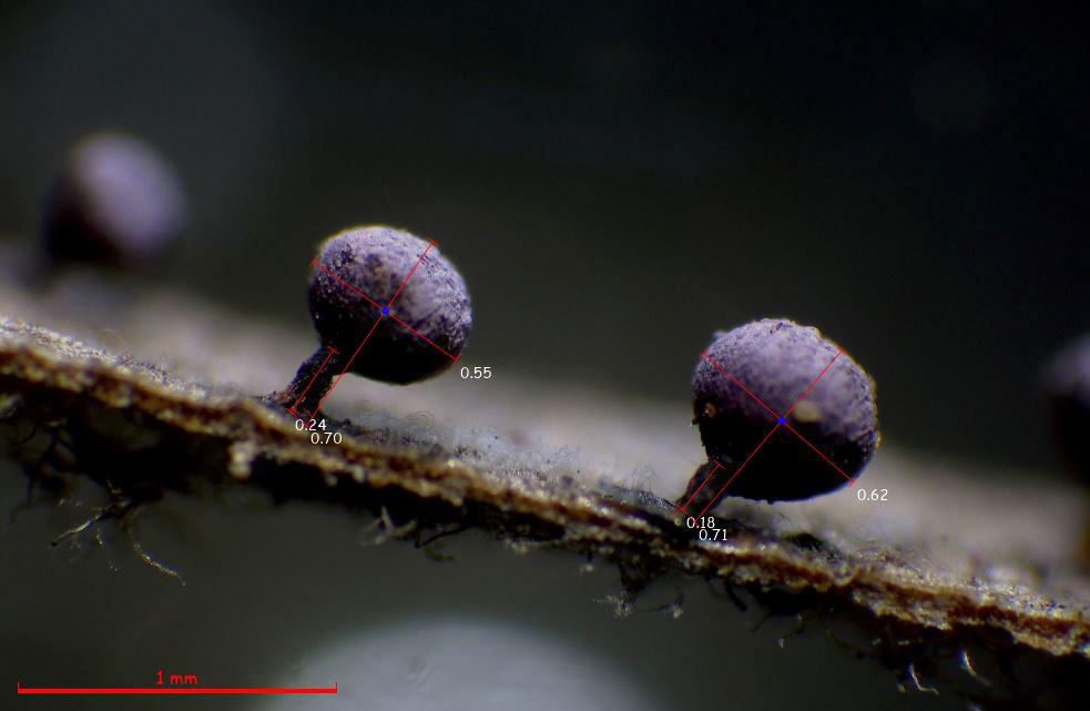 Los esporocarpos a 40 aumentos, con tonos púrpura y un muy corto pie: