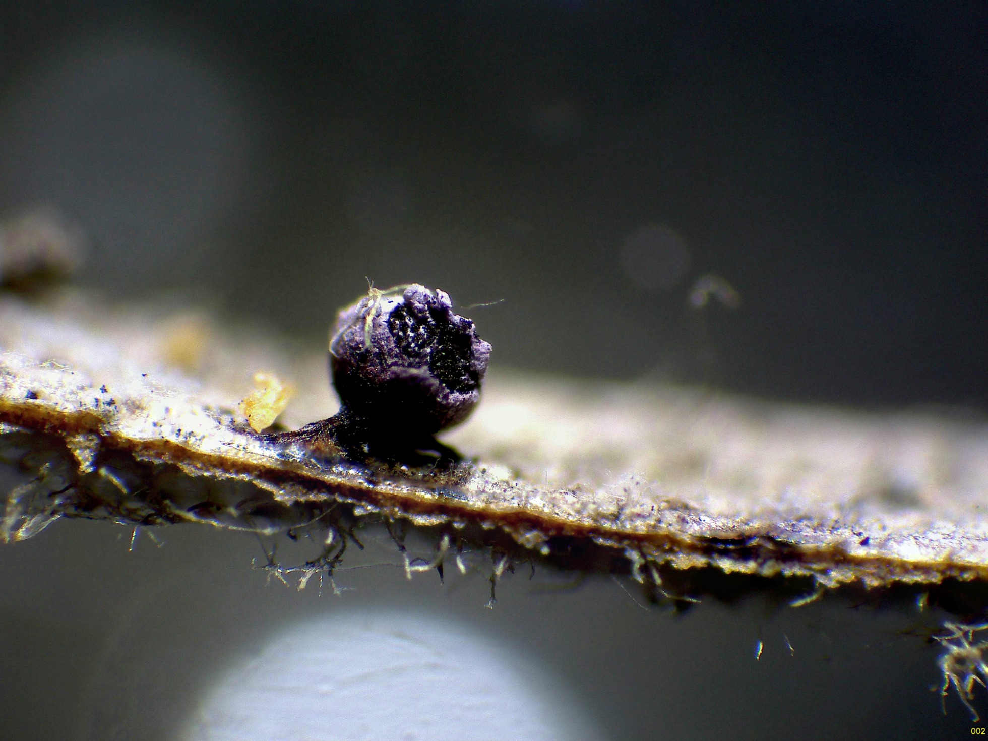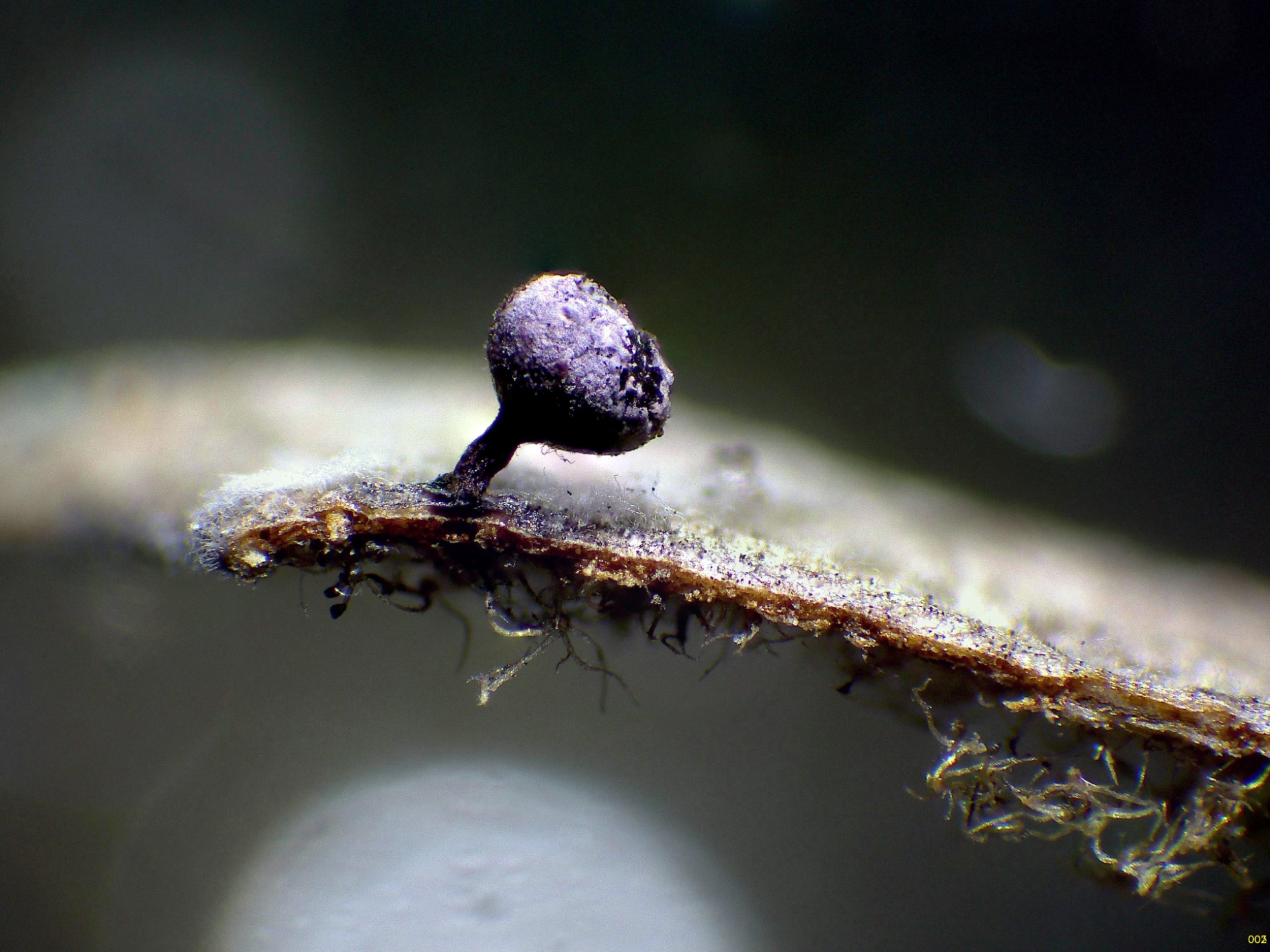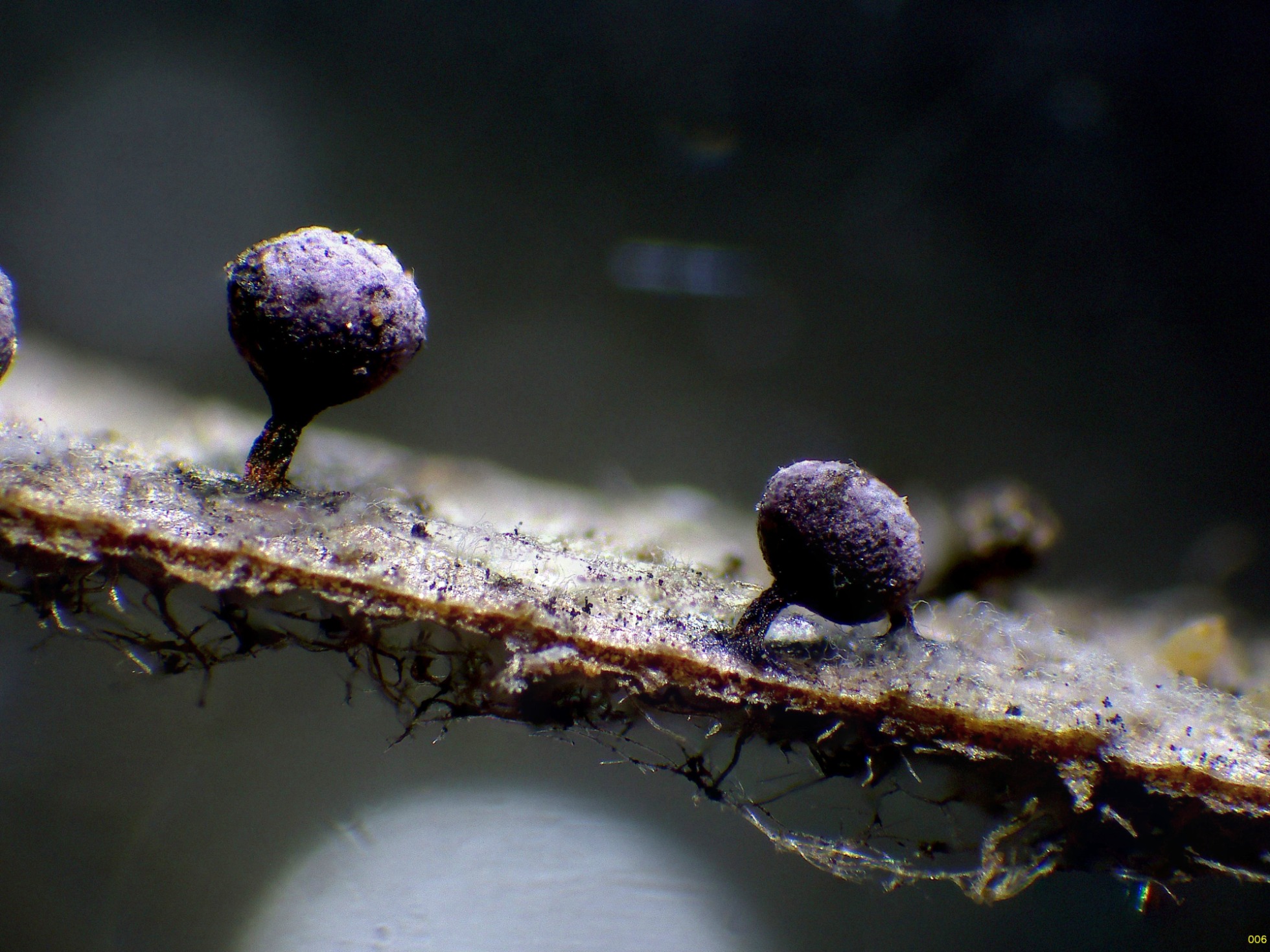 Los esporocarpos a 40 aumentos, con tonos púrpura y un muy corto pie: