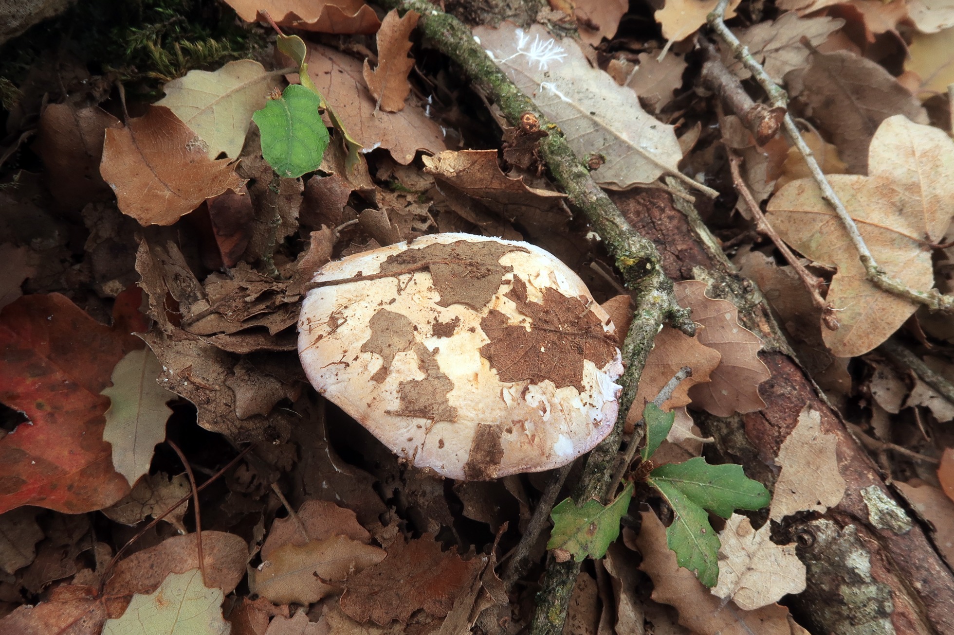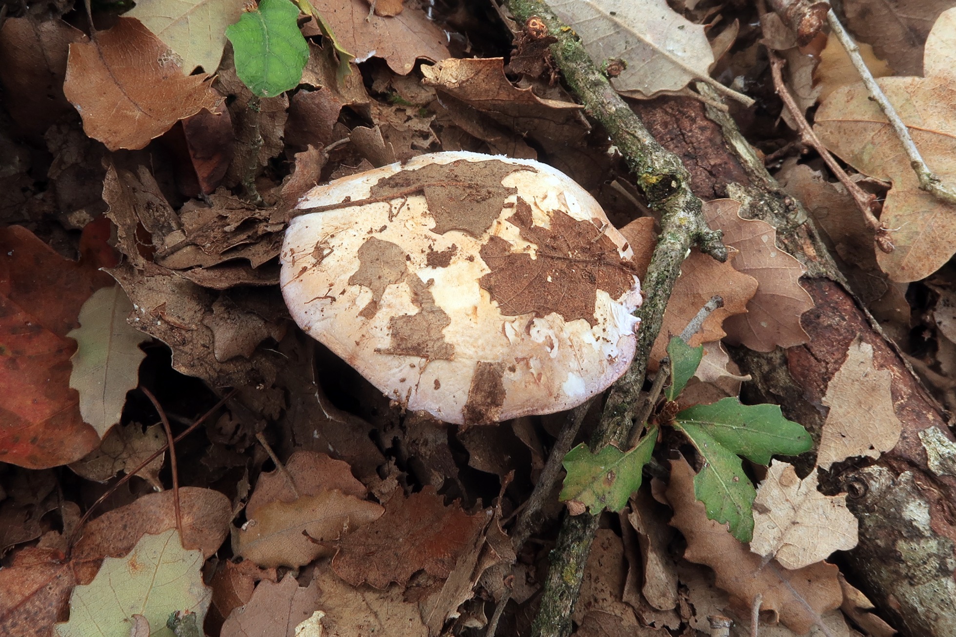 Sombrero de unos 6 cm. de diámetro, convexo de color crema con ligeros tintes rosado violáceos, estos tintes más acusados en el borde, cutícula aparentemente seca pero que presentaba una gran cantidad de hojas adheridas, probablemente estaba seca por la acción del viento sur, por lo que deduzco que en tiempo húmedo la cutícula probablemente debería ser viscosa.