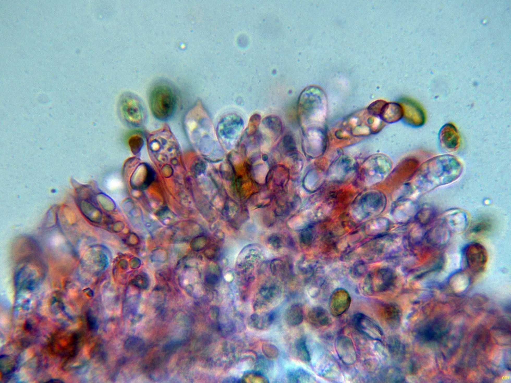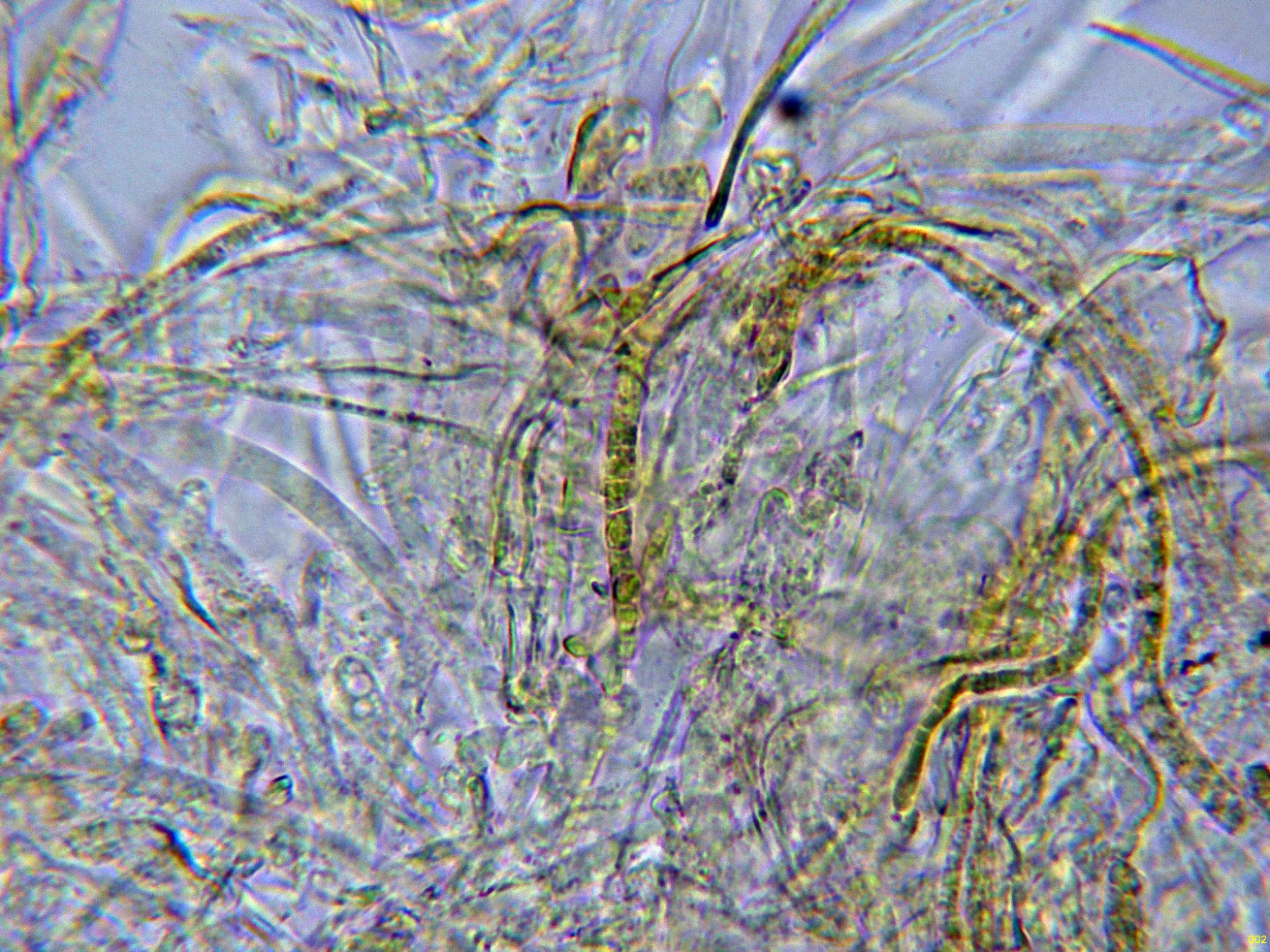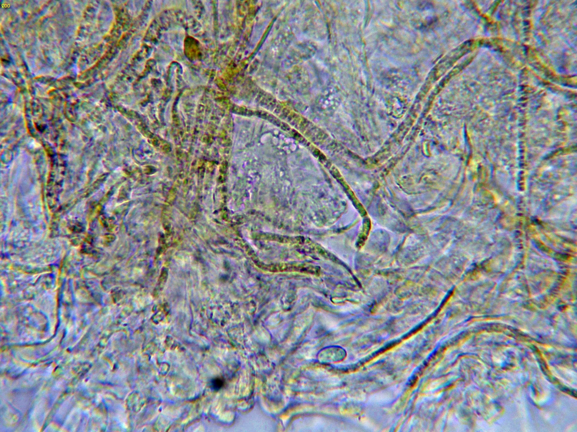 Suprapellis formada por una masa de hifas estrechas (hasta solo 3 micras de anchura), fuertemente pigmentadas y aparentemente fibuladas, por debajo de estas unas hifas ya más anchas e hialinas de hasta 9 micras o más de anchura