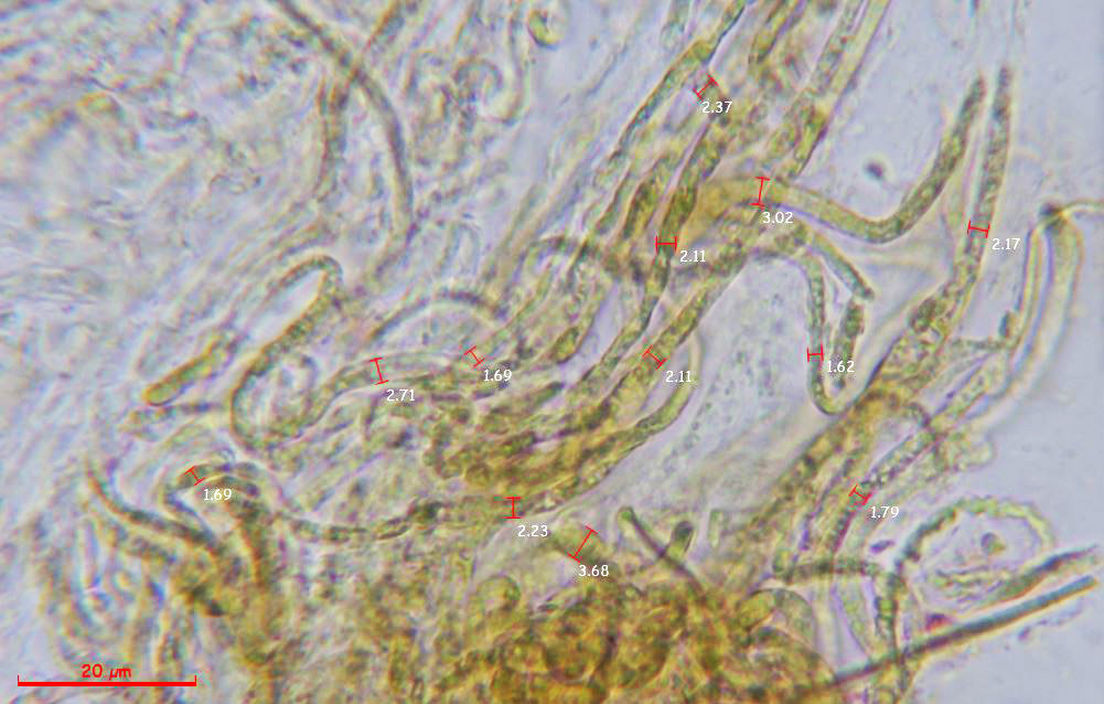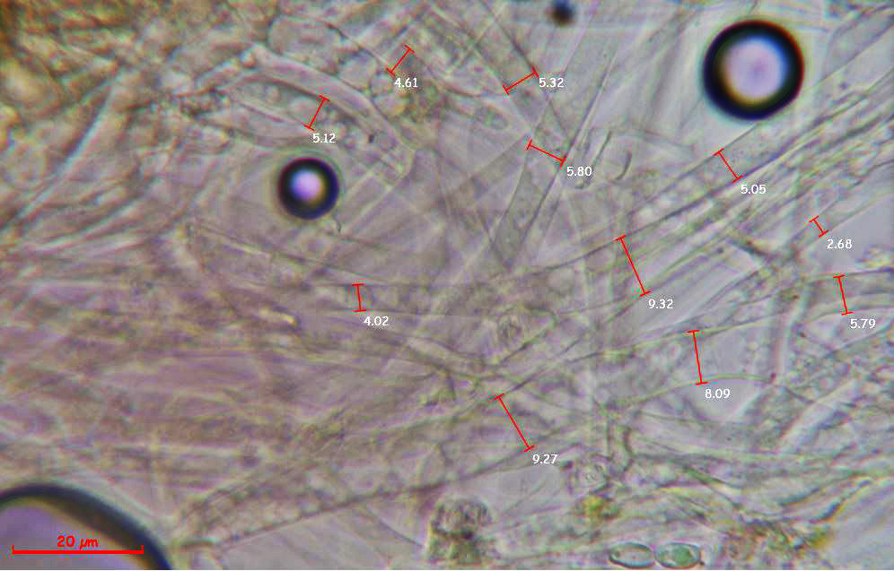 Las hifas de la subpellis ya más hialinas, asimismo con sus medidas: