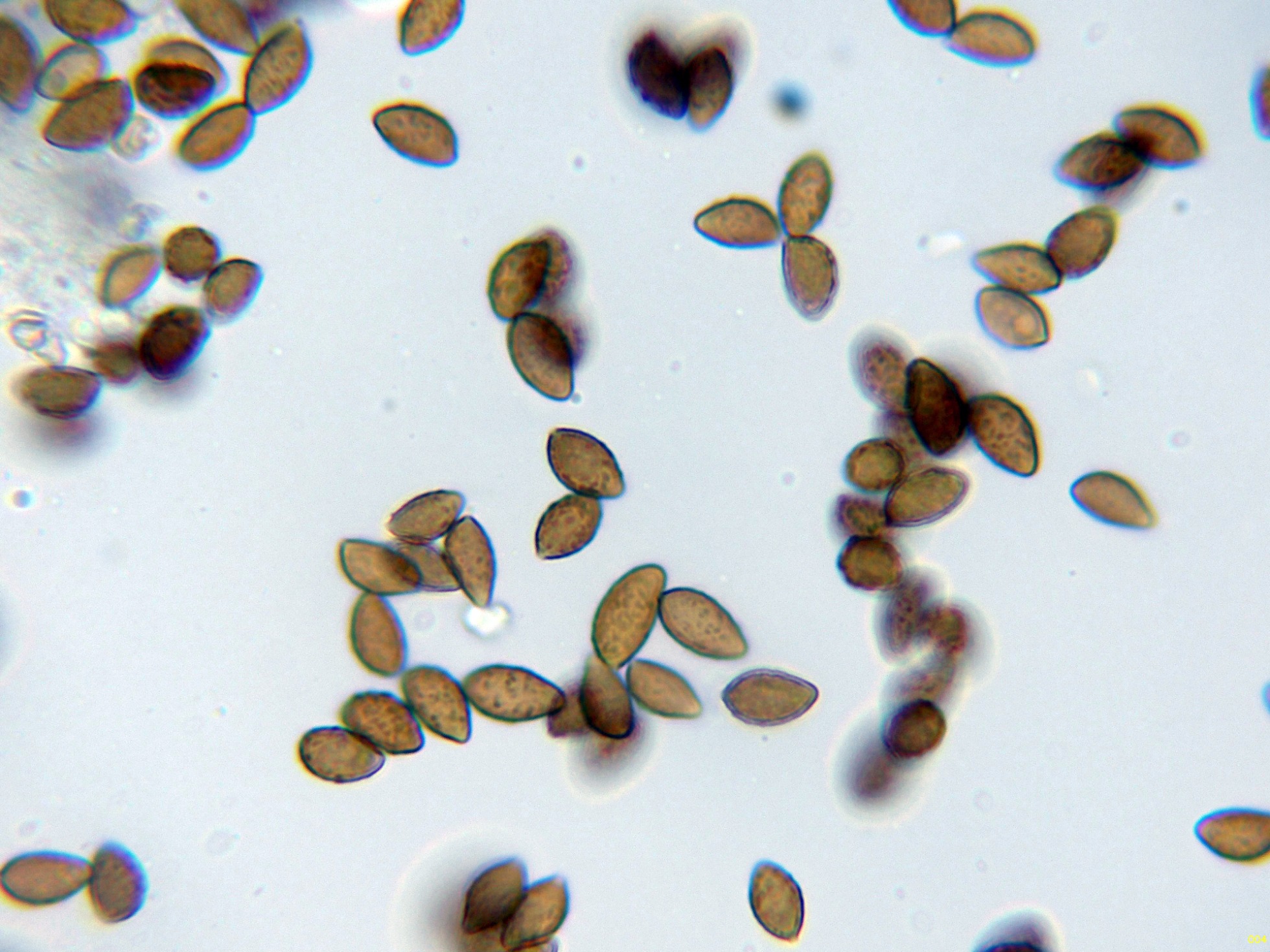 Y por último las esporas en agua, estas esporas almendradas, con marcadas verrugas, y de color marrón al microscopio: