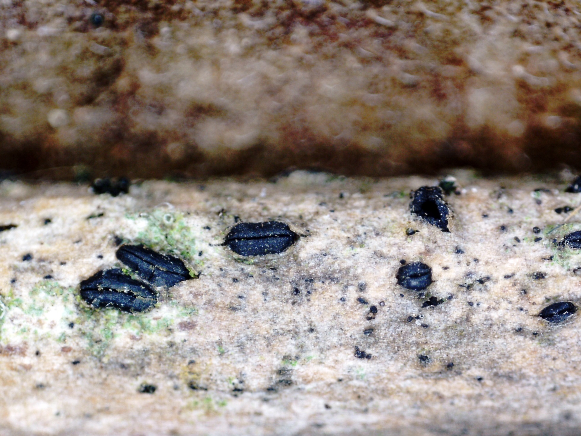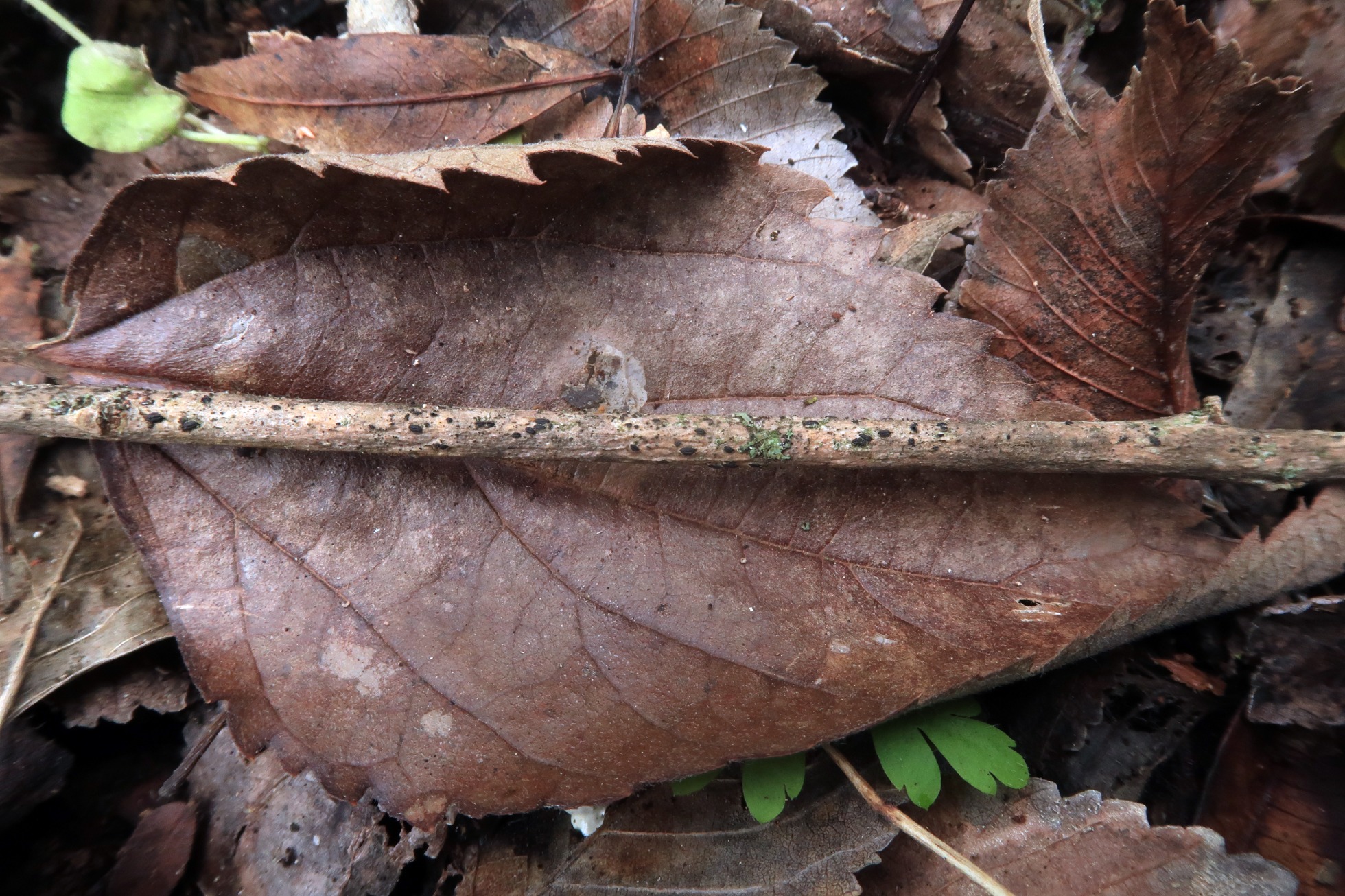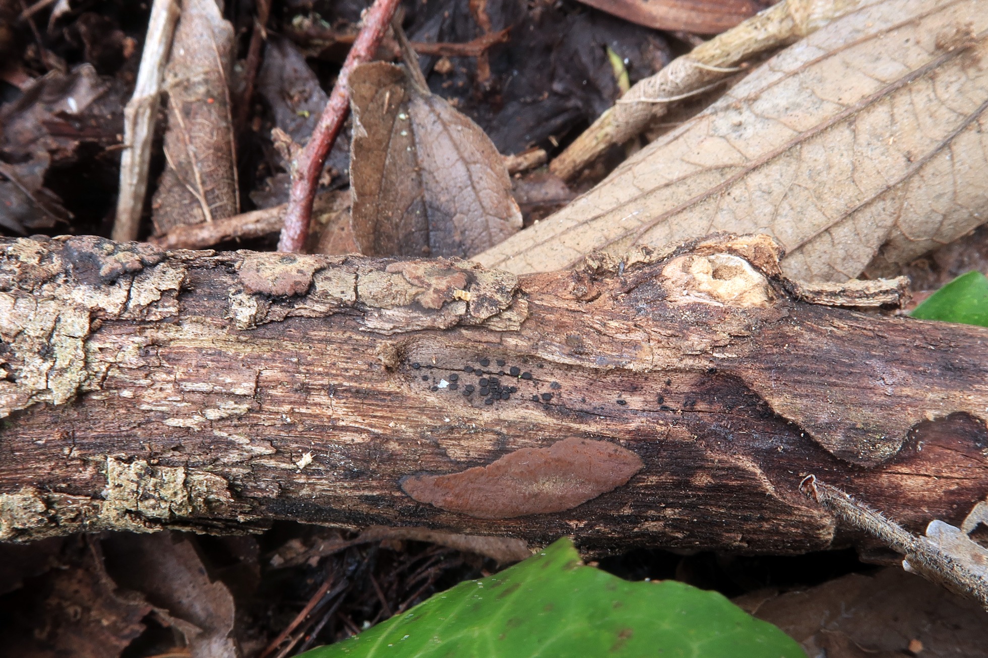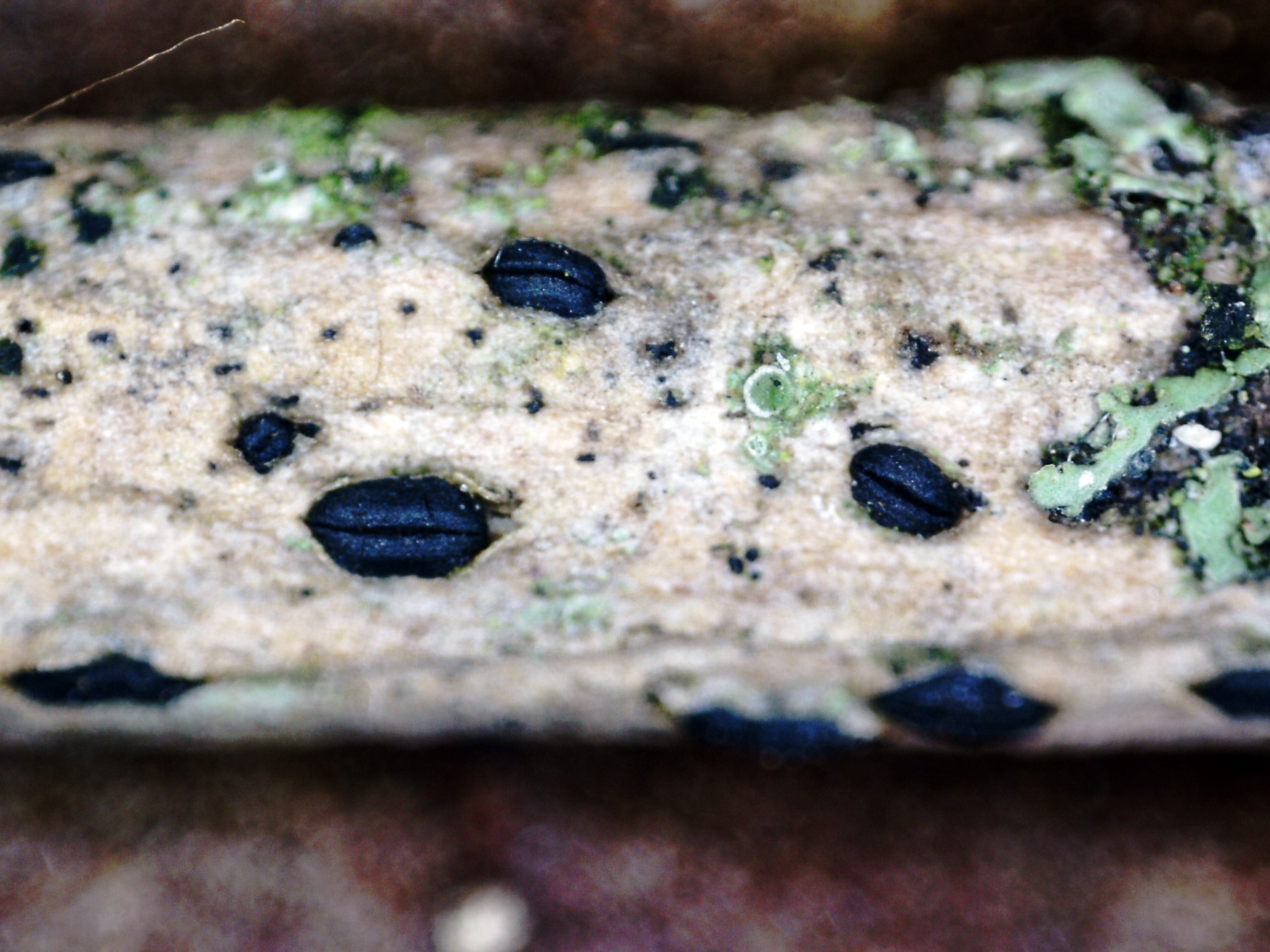 Otro ascomiceto, sobre la superficie de un muy diminuto tronco del suelo, un viejo conocido, el Hysterographium fraxini: